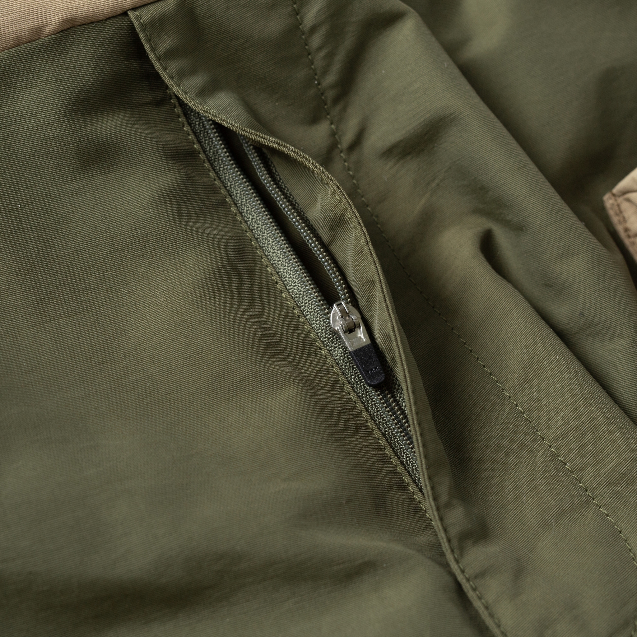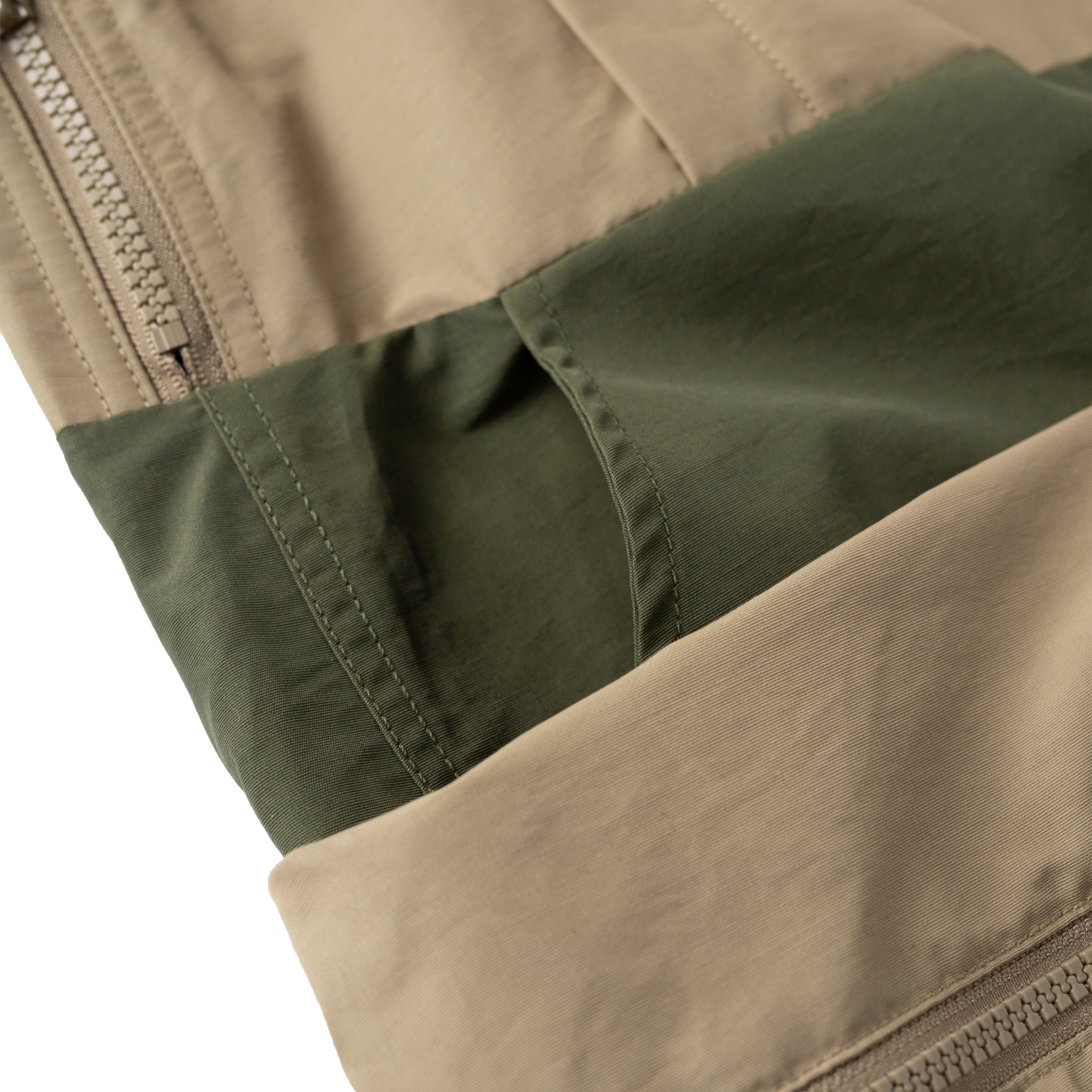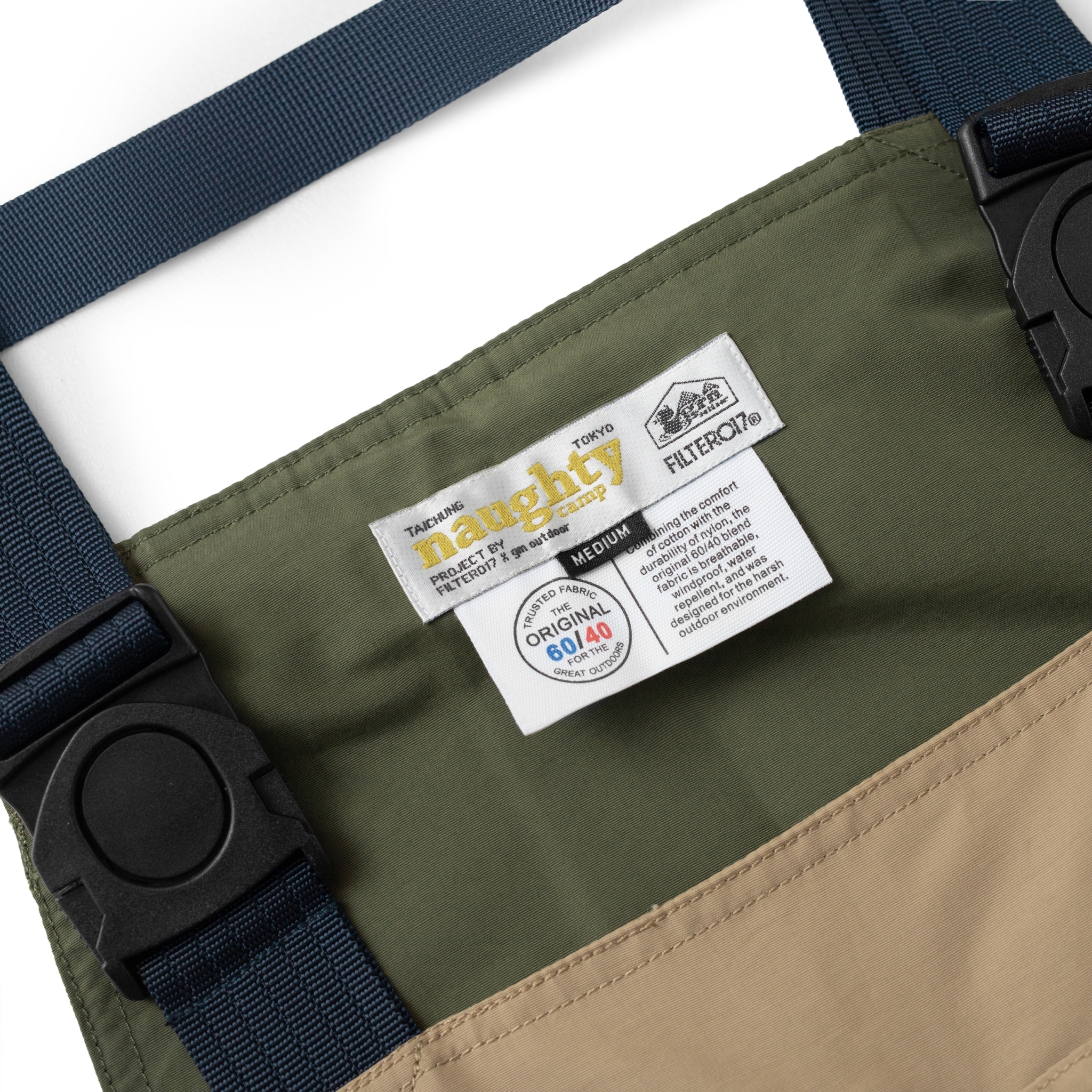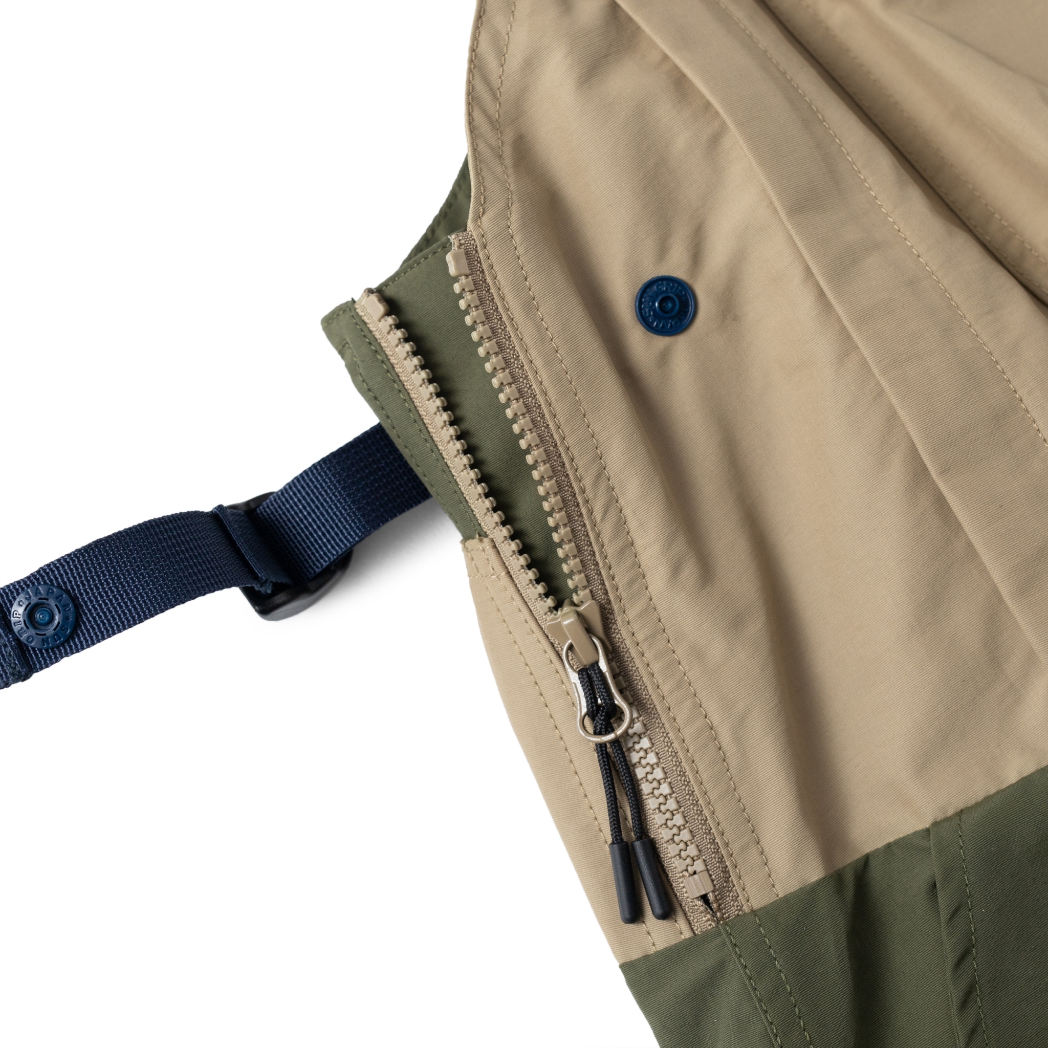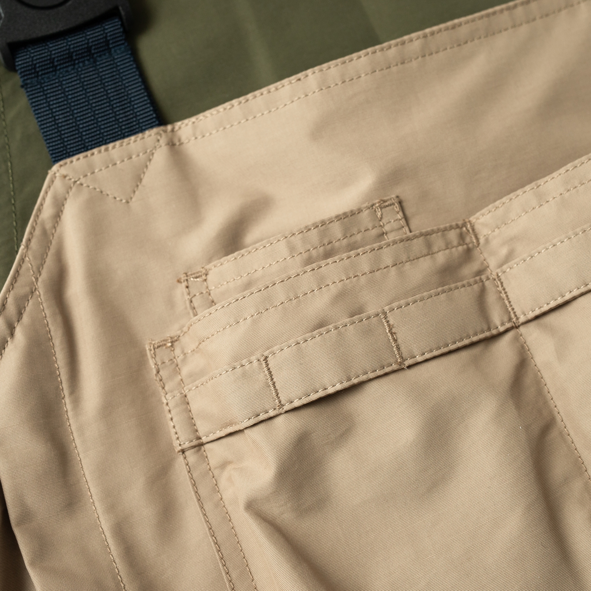 結合軍、工、獵裝的混合概念下呈現創意與飽滿的細節表現,於胸口、兩側配置規劃多重機能與實用性兼具的口袋及暗袋,背部則拼接融合改良自傳統獵裝背心中放置獵物、工具用途的扇型背袋設計,在視覺與功能上更層次。