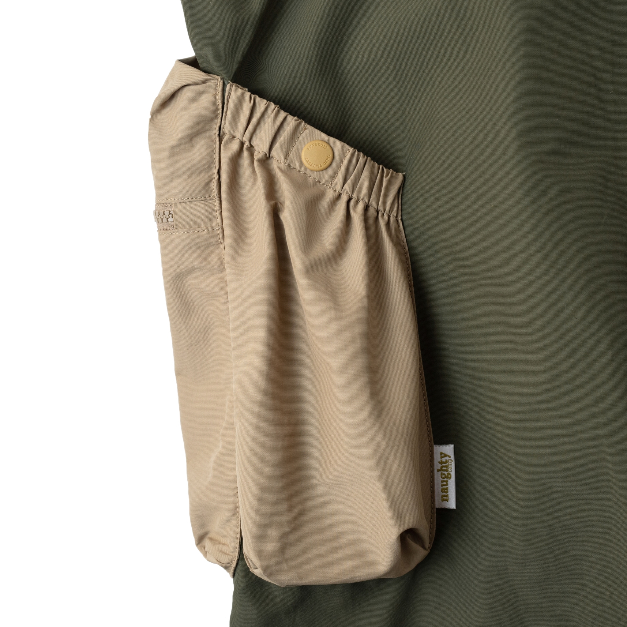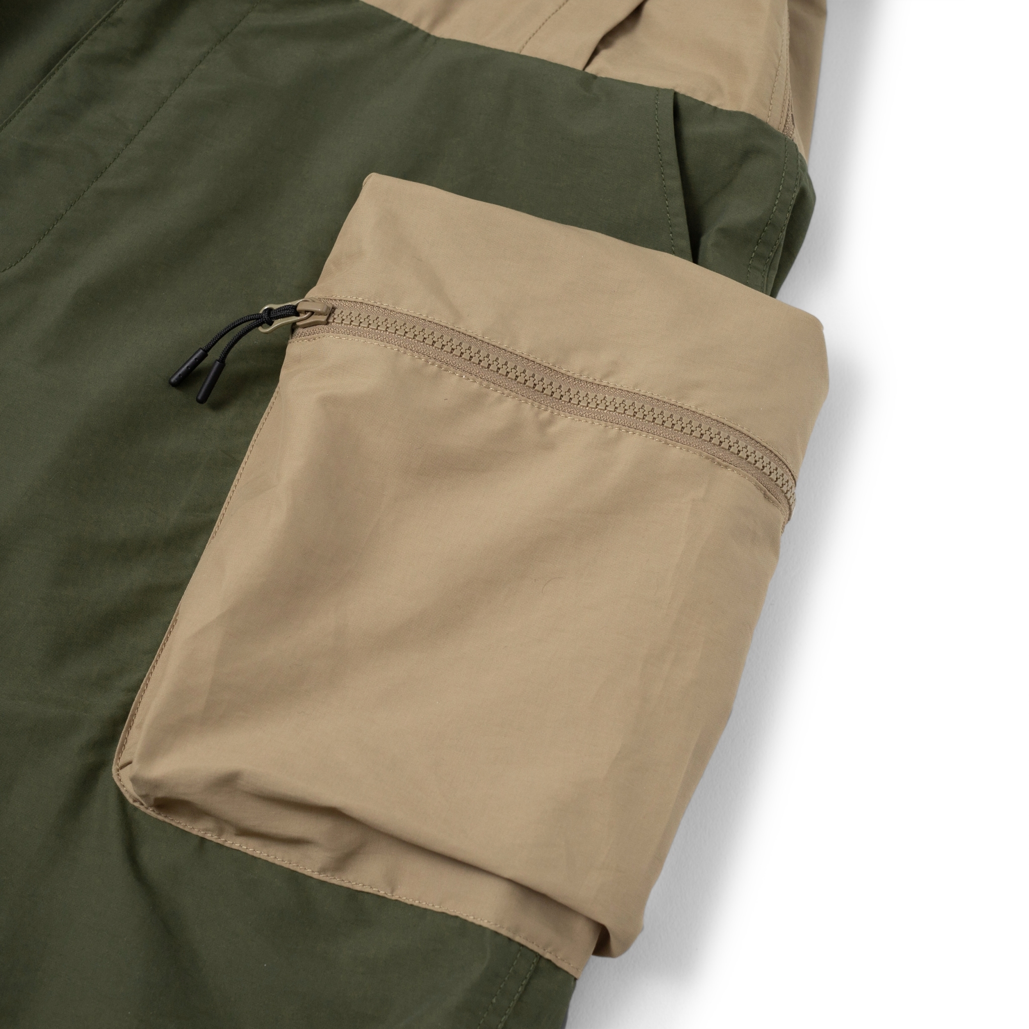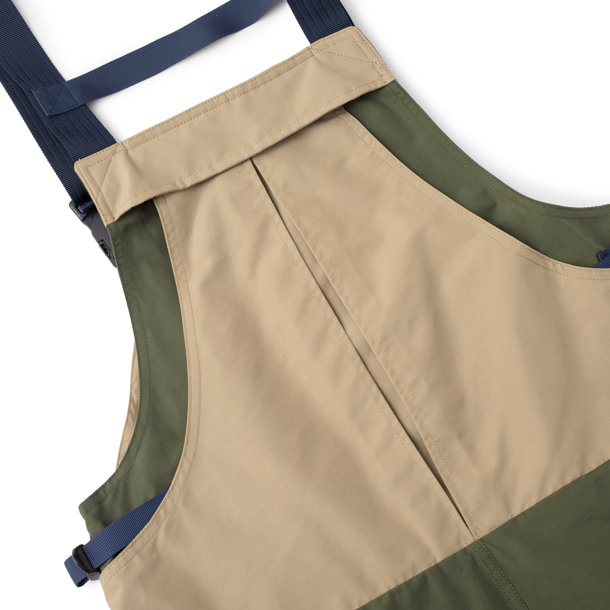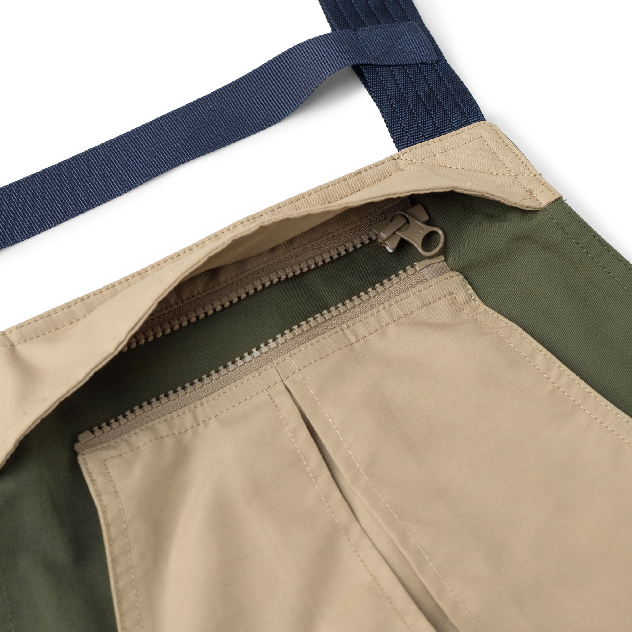 結合軍、工、獵裝的混合概念下呈現創意與飽滿的細節表現,於胸口、兩側配置規劃多重機能與實用性兼具的口袋及暗袋,背部則拼接融合改良自傳統獵裝背心中放置獵物、工具用途的扇型背袋設計,在視覺與功能上更層次。