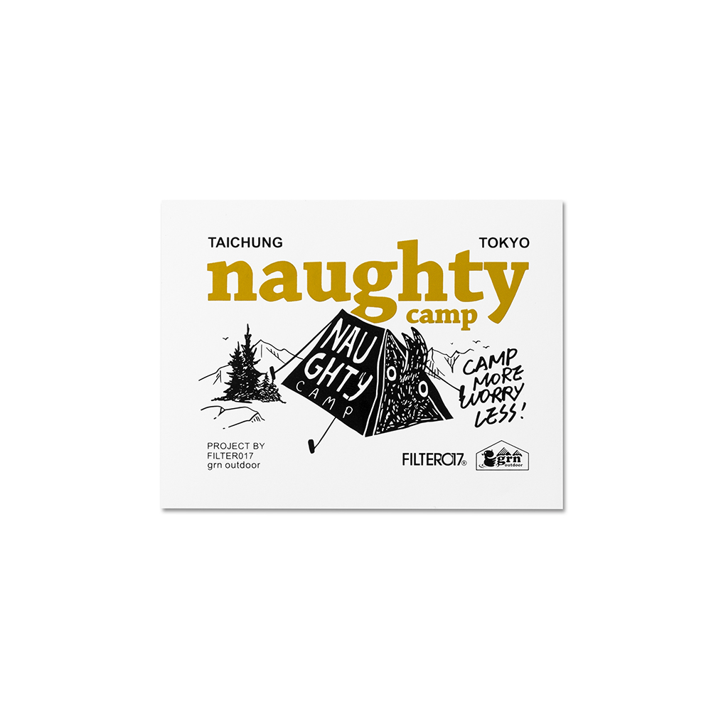 台灣設計單位/品牌Filter017 於2021創立屆滿17周年之際 ,宣布攜手風靡近年亞洲風格戶外巿場、擁有相當影響力的創意品牌grn outdoor ,延伸雙方品牌基因,以流行、戶外休閒及機能設計,加以揉合創意趣味及特色視覺,正式推出以風格戶外為主軸的全新跨國支線企劃「NAUGHTY CAMP」。
