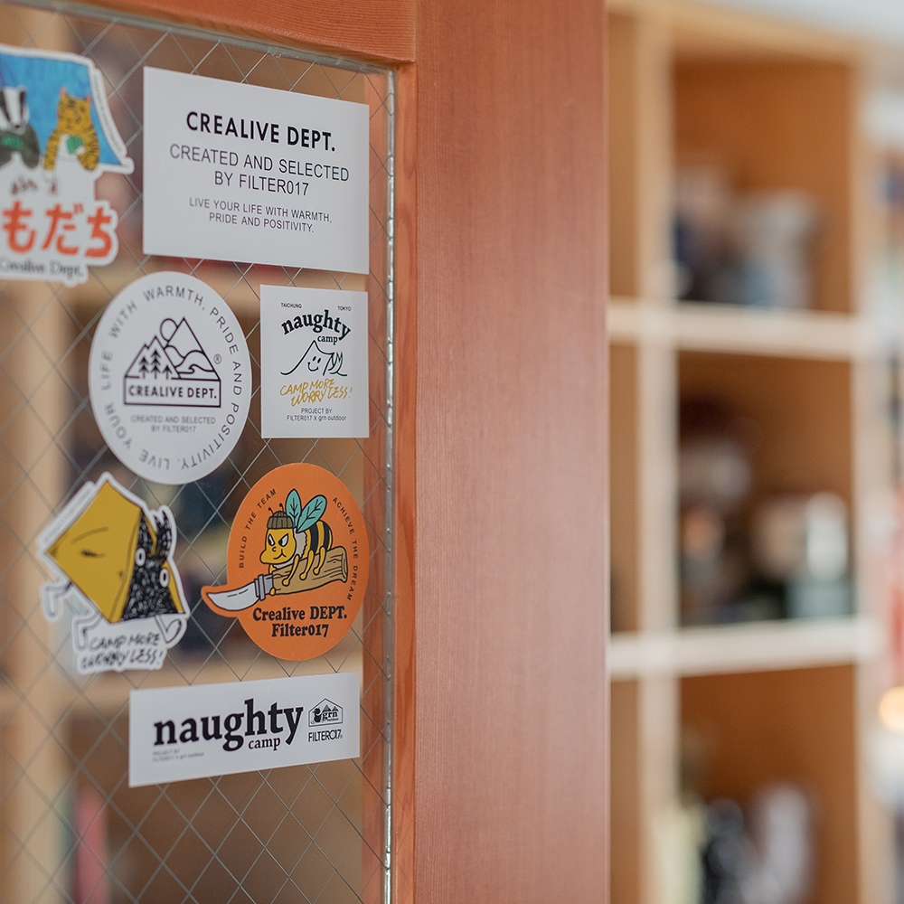 以自然戶外元素作為設計發想,結合雙方品牌及NAUGHTY CAMP支線概念及意象所設計的聯名圖像,利用網版印刷方式呈現於高品質之 PVC 材質貼紙中,與一般貼紙相較更為防水、抗撕、耐用、不殘膠且抗 UV 不易褪色,為INOUT質感生活增添亮眼點綴。