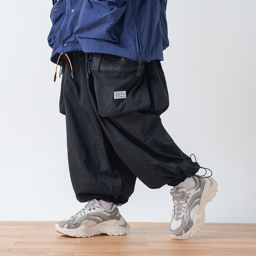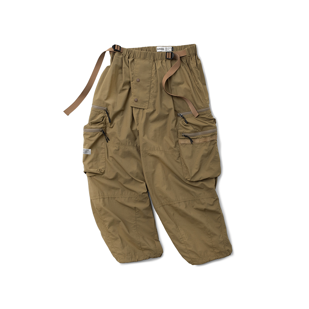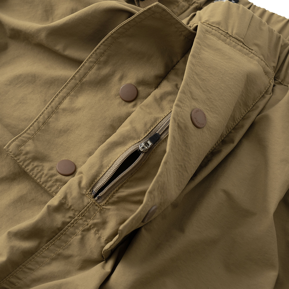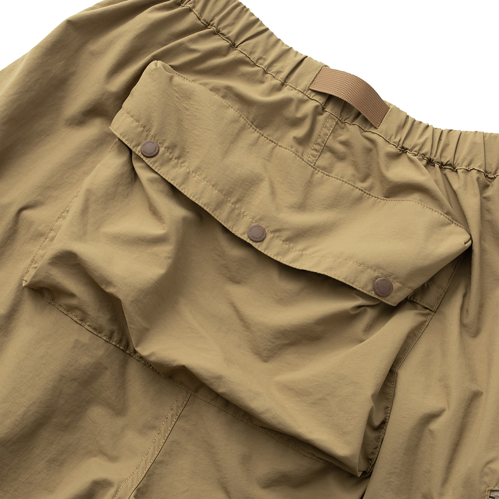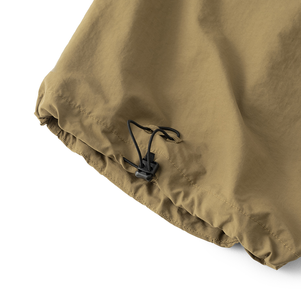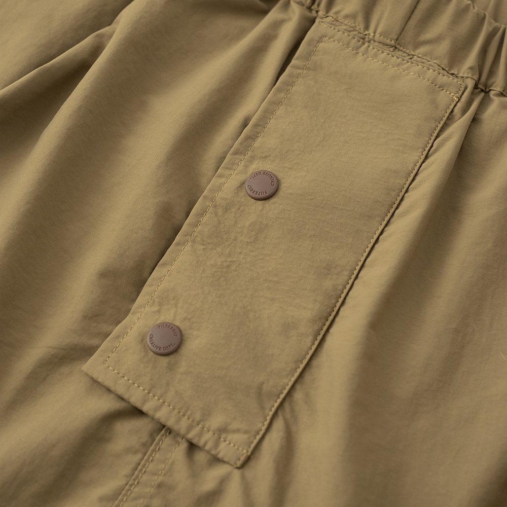 材質上以品牌特別獨立開發,具備防風、輕量、不貼身之特性的洗皺尼龍面料進行製作,並以 Teflon 鐵氟龍認證塗層加工,大幅增強防潑水、抗汙的機能特性,搭配寬鬆輪廓的褲型設計和腰部隱藏式束繩的細節設定,無論戶外活動或都市機能穿搭,皆能輕鬆展現舒適自在穿著體驗。