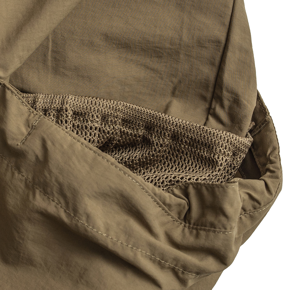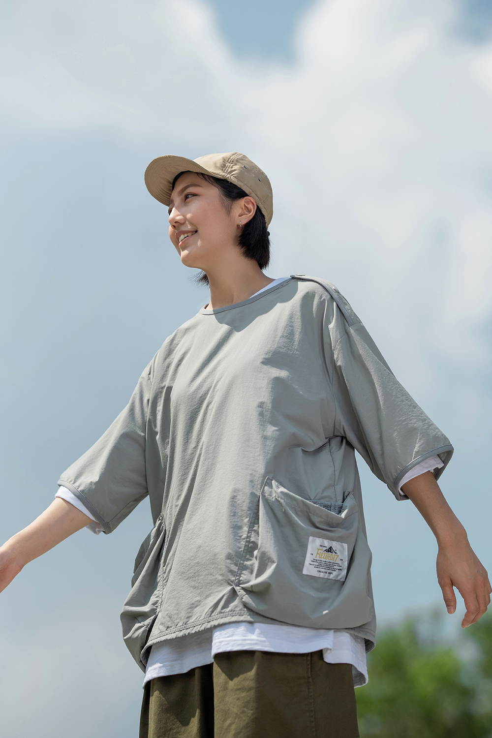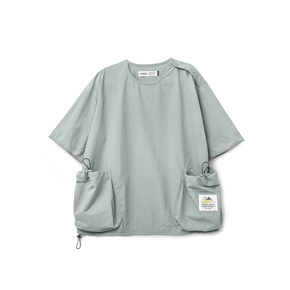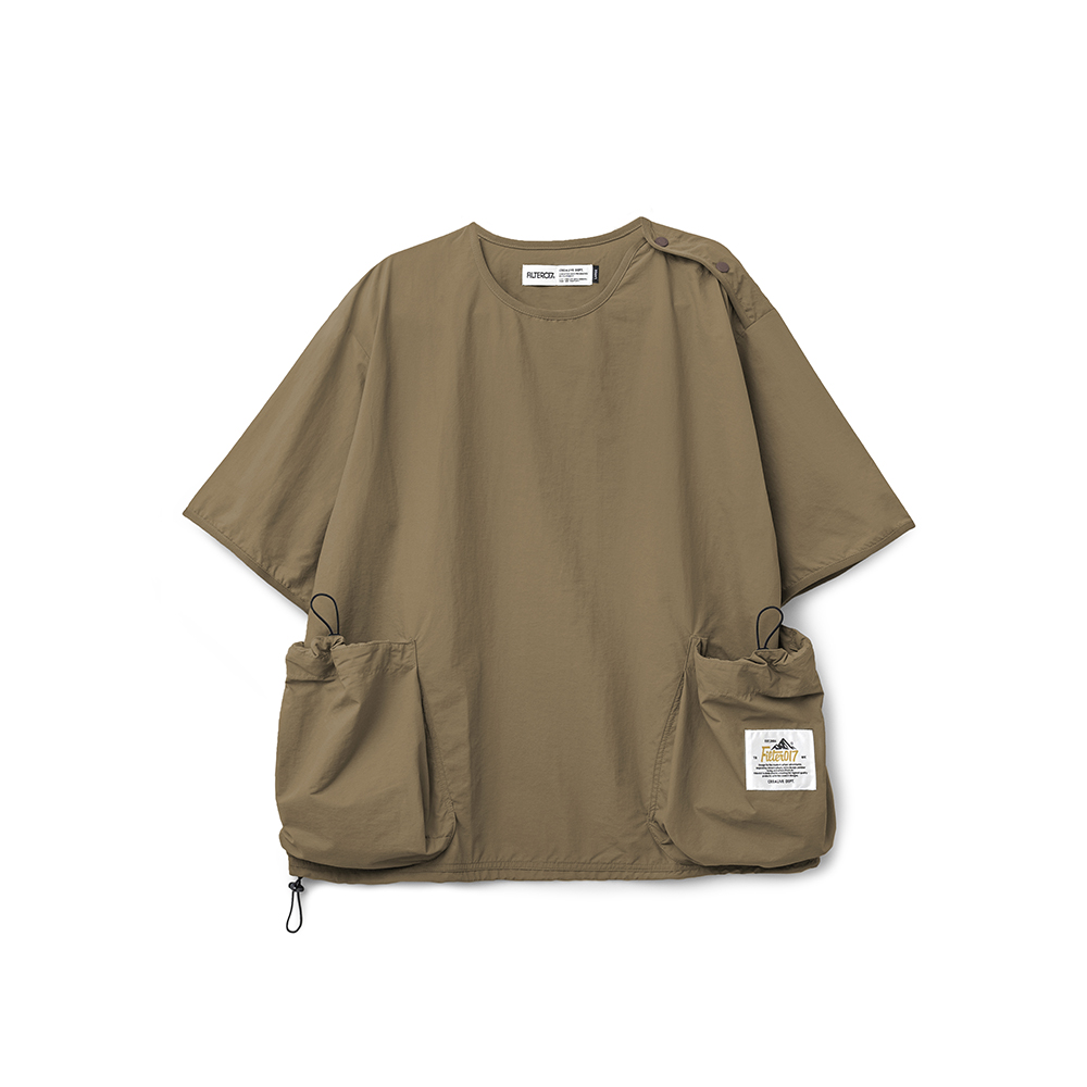 寬鬆版型的短袖罩衫,以擁有舒適手感,並具基本防風機能、穿著時不貼身的尼龍機能面料所打造而成。