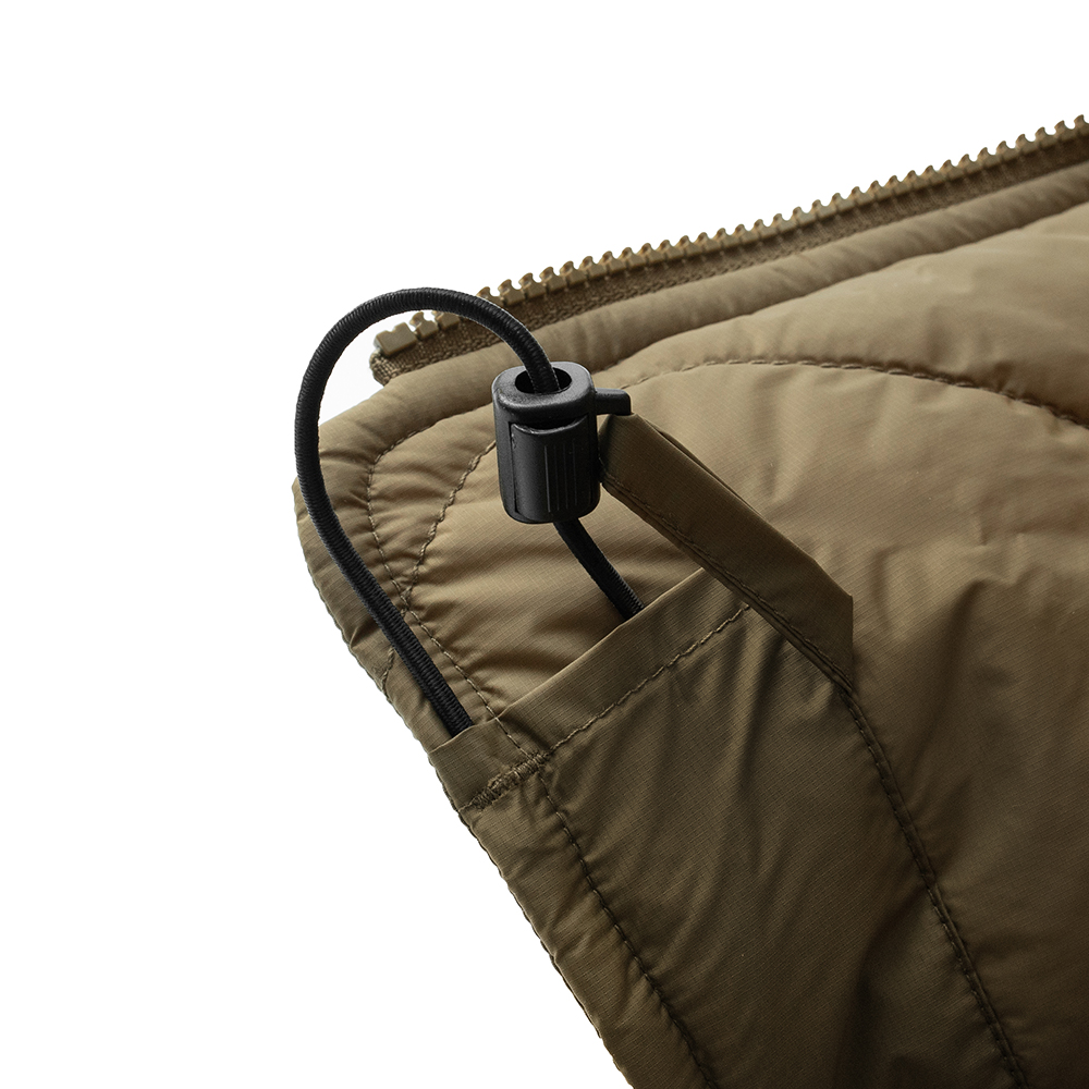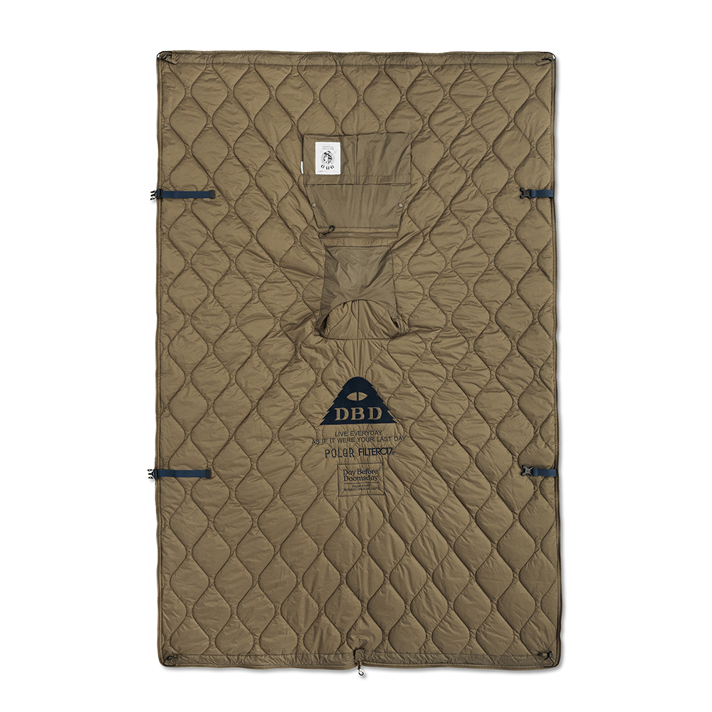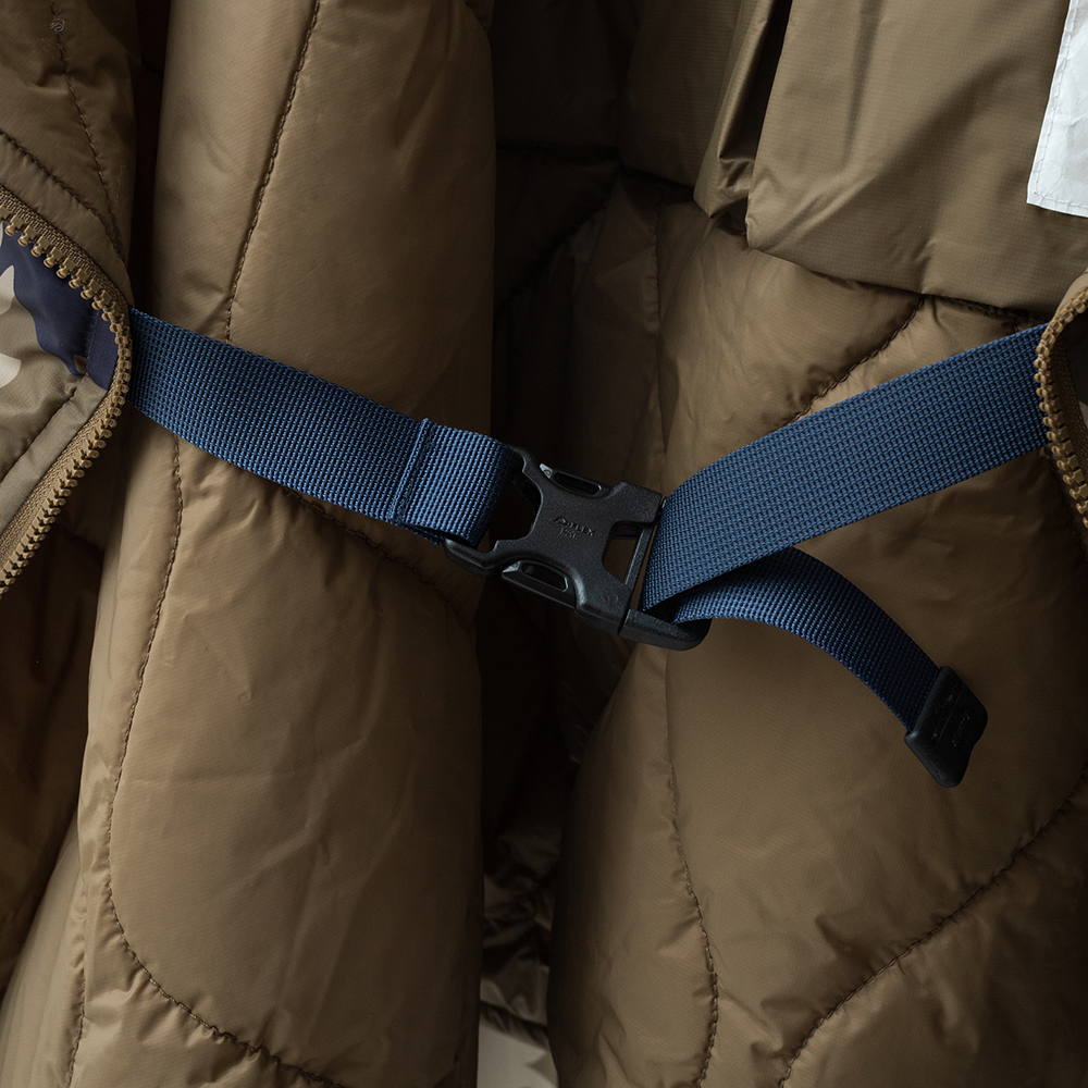 除了可雙面穿著斗篷的型態,在功能巧思上增添了考究歐洲軍用機能的可變設計,除可鋪平做為棉被或保暖毯使用,透過拉鍊結構就能輕易轉化為單人保暖的睡袋。
