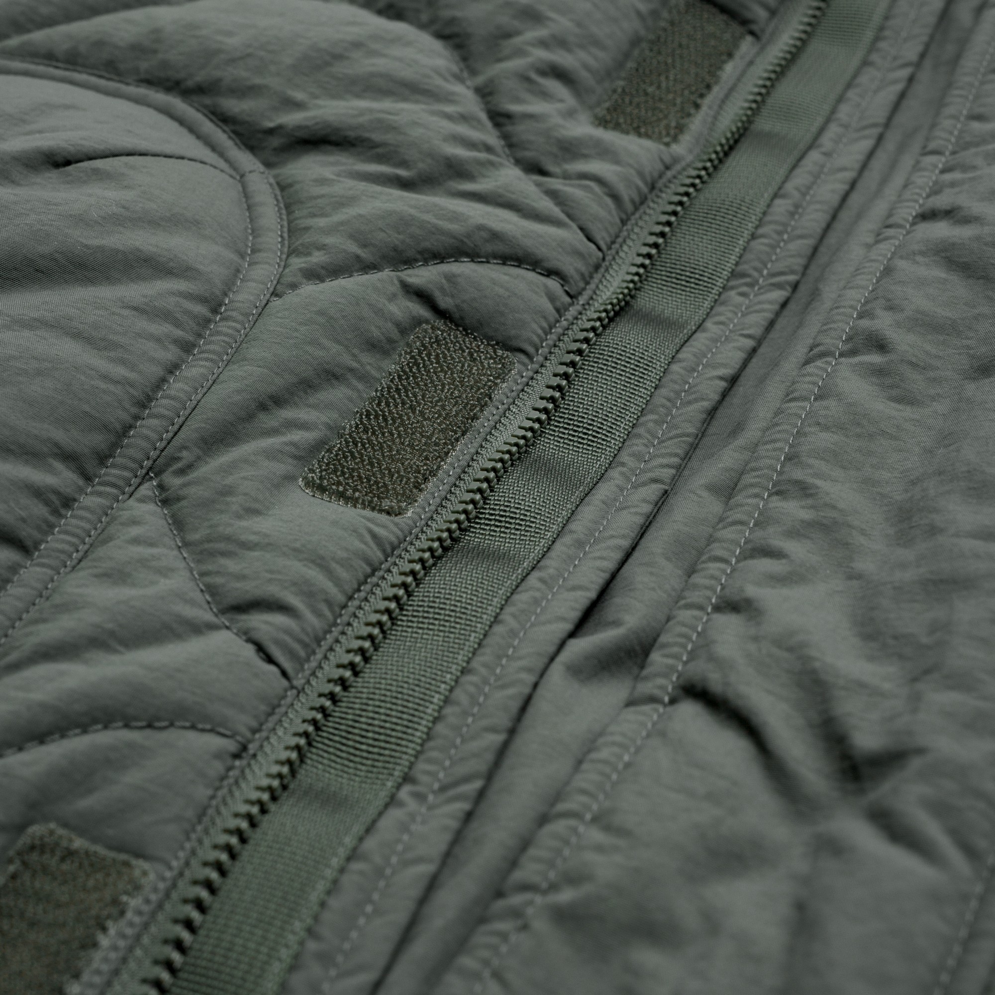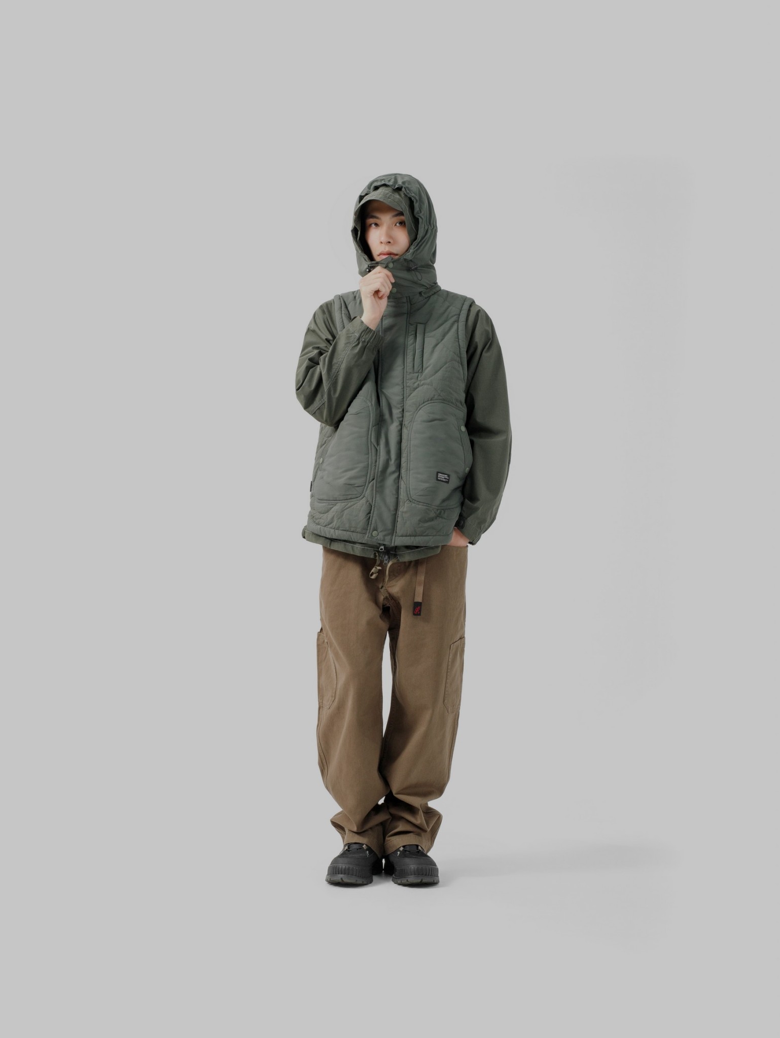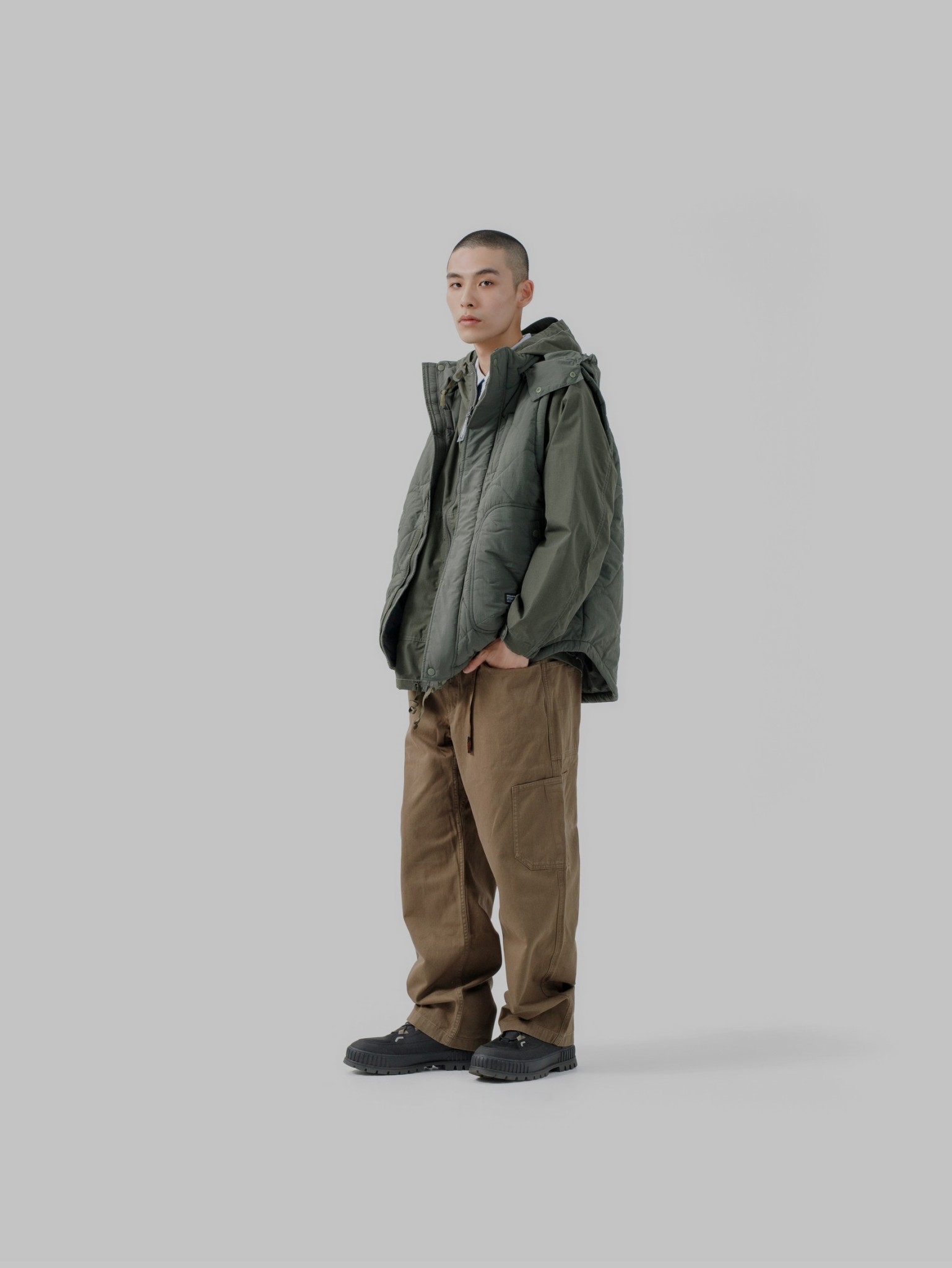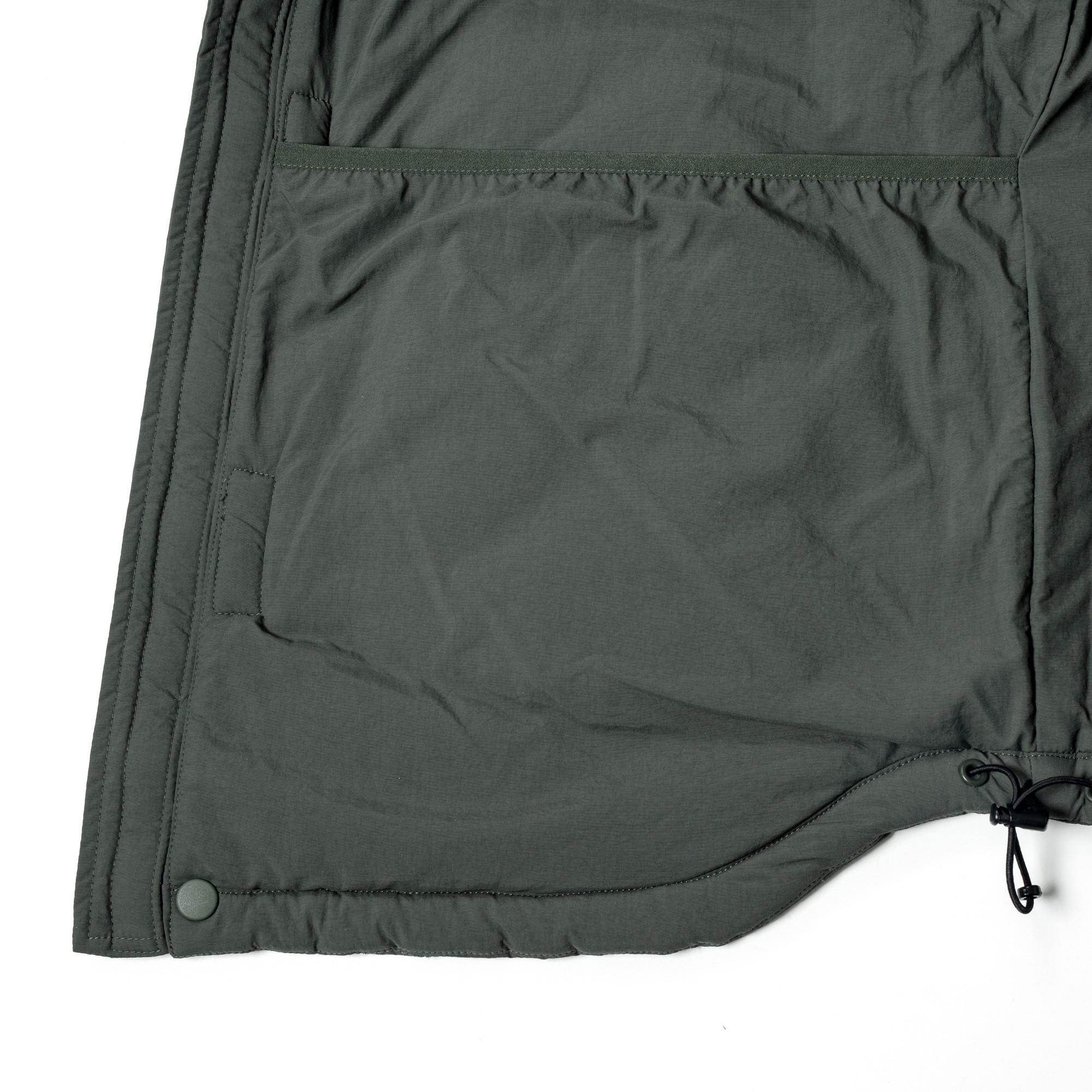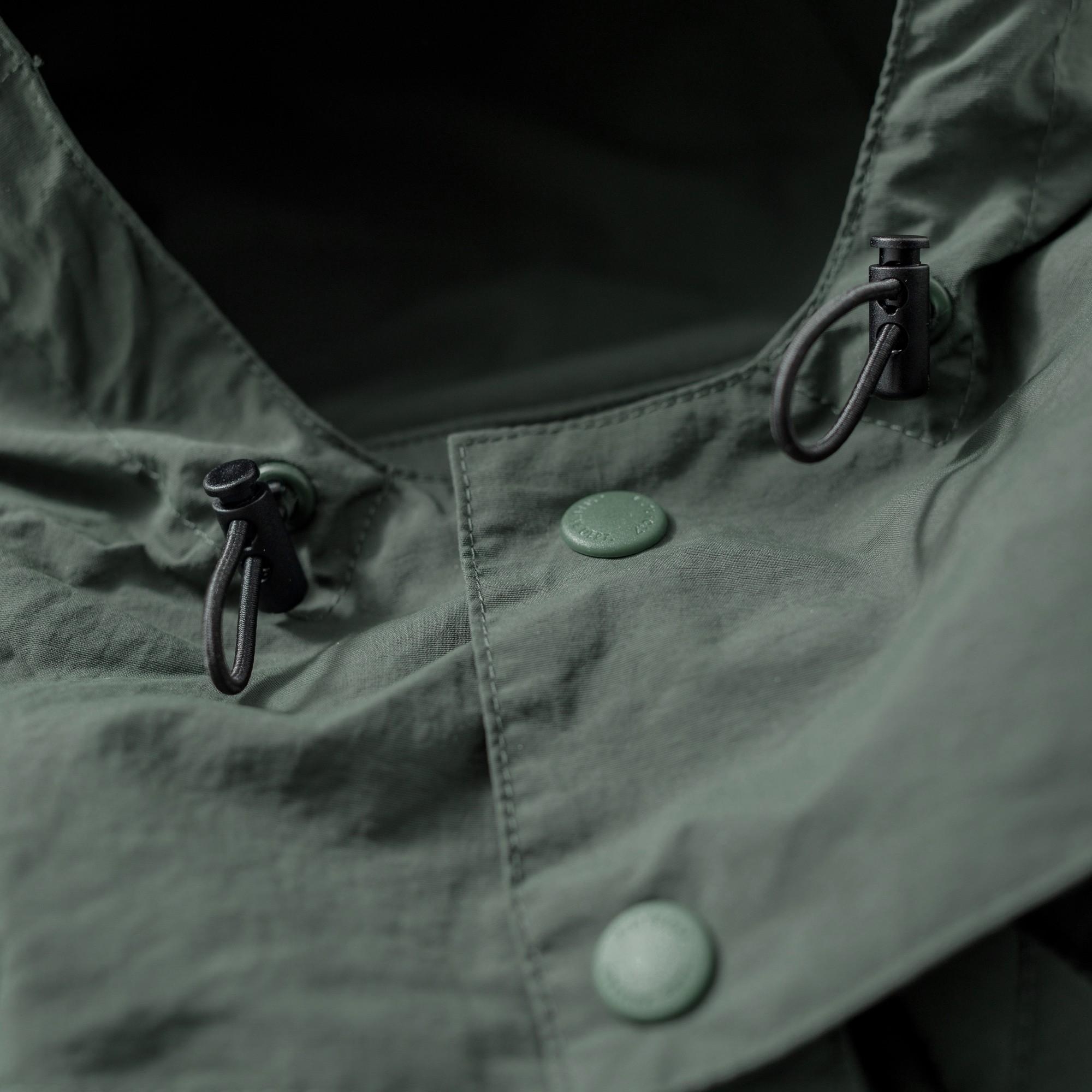 以THERMOLITE® 中空纖維輕量保溫且抗濕透氣,與品牌獨立開發之皺洗尼龍面料經考究軍事衍縫技法融合呈現,略為寬鬆的版型輪廓搭配弧形下擺,在保暖防寒的實用度外建構出搭配需求的豐富變化。