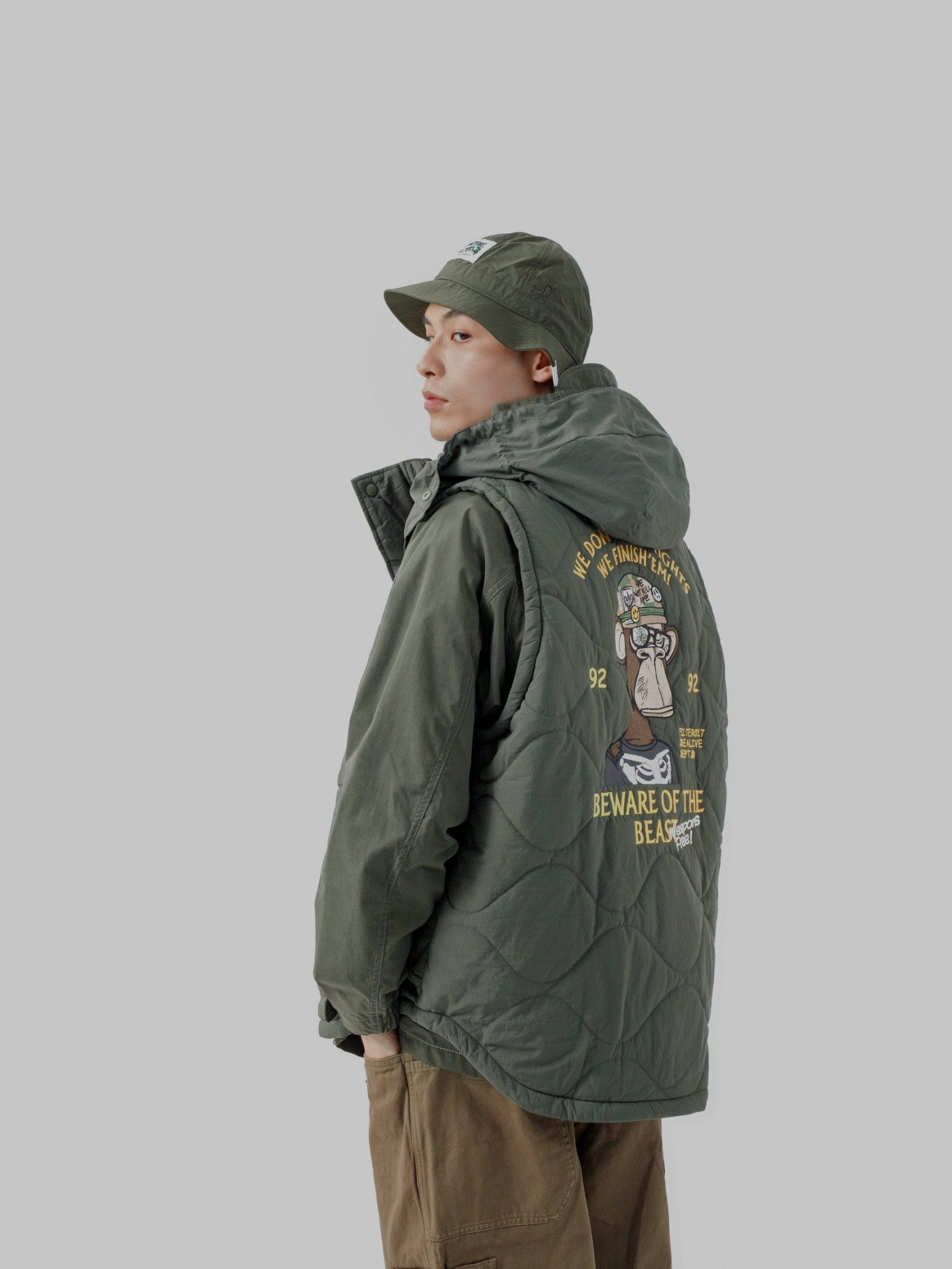 此款構築於保暖與層次造型之間的重點單品,以DARK FOREST 無聊猿圖像與意涵轉化為鮮明的軍事風格,採用細緻飽滿的大面積刺繡工藝,玩味出極具特色的主題輪廓,整體呈現帶有FILTER017® 品牌獨到詮釋的視覺語彙。
