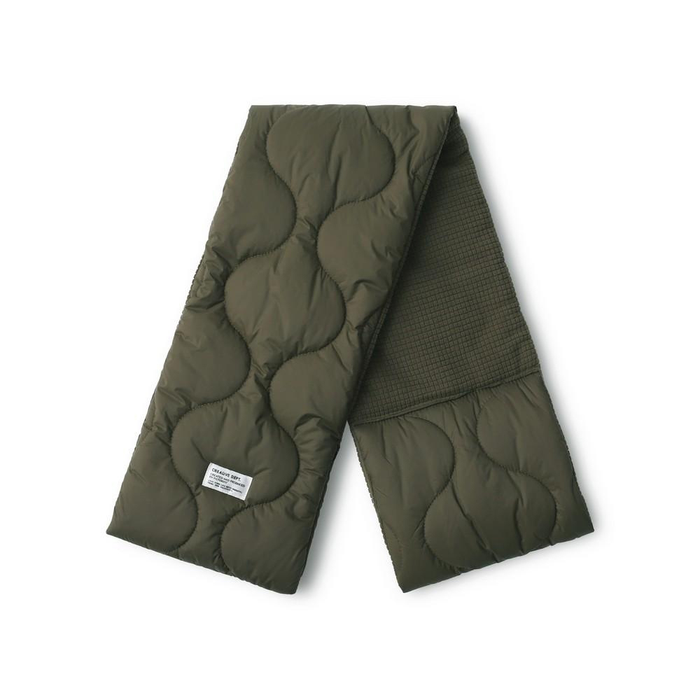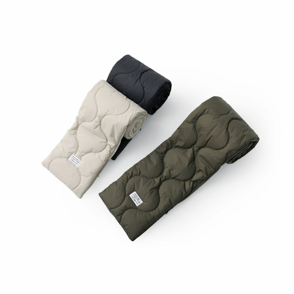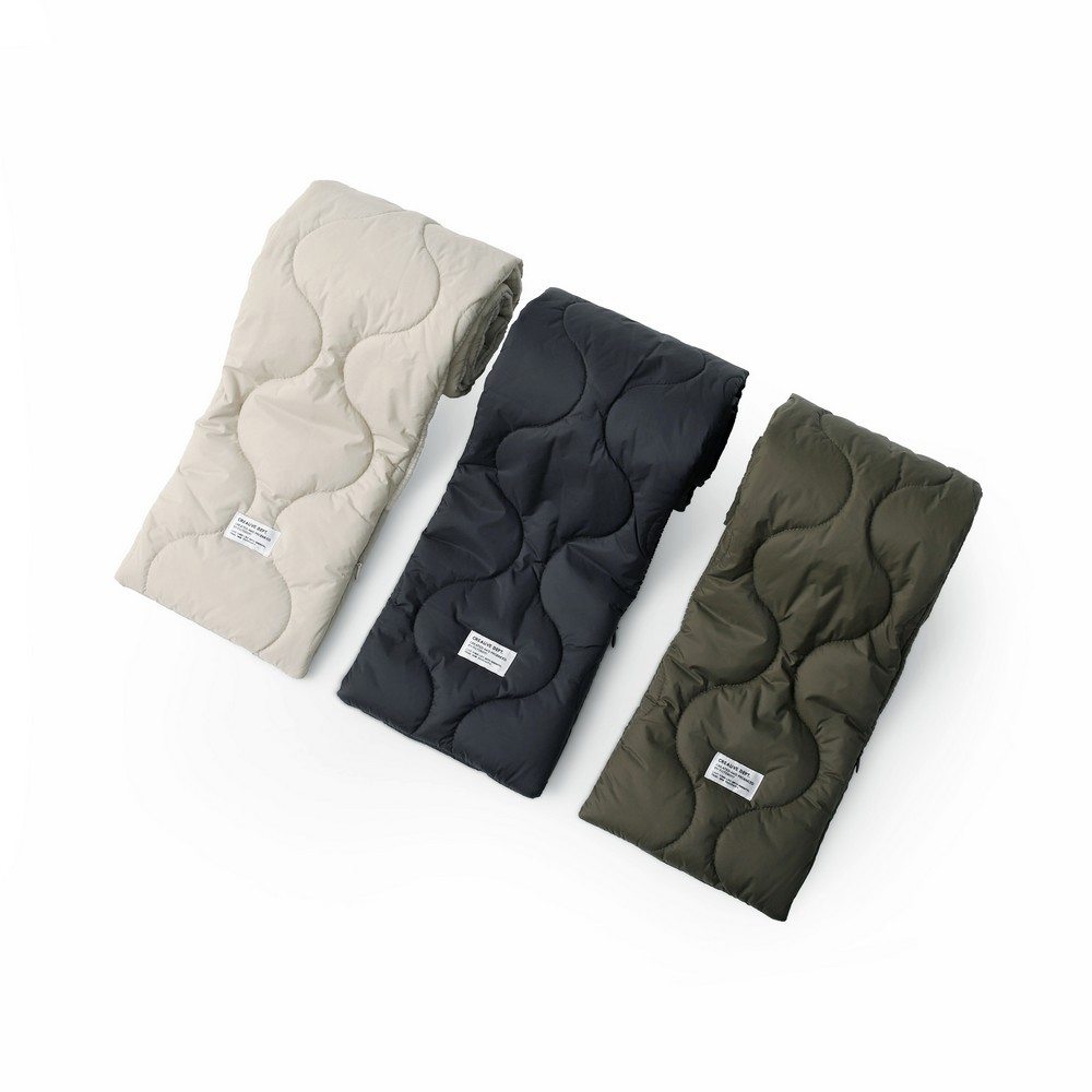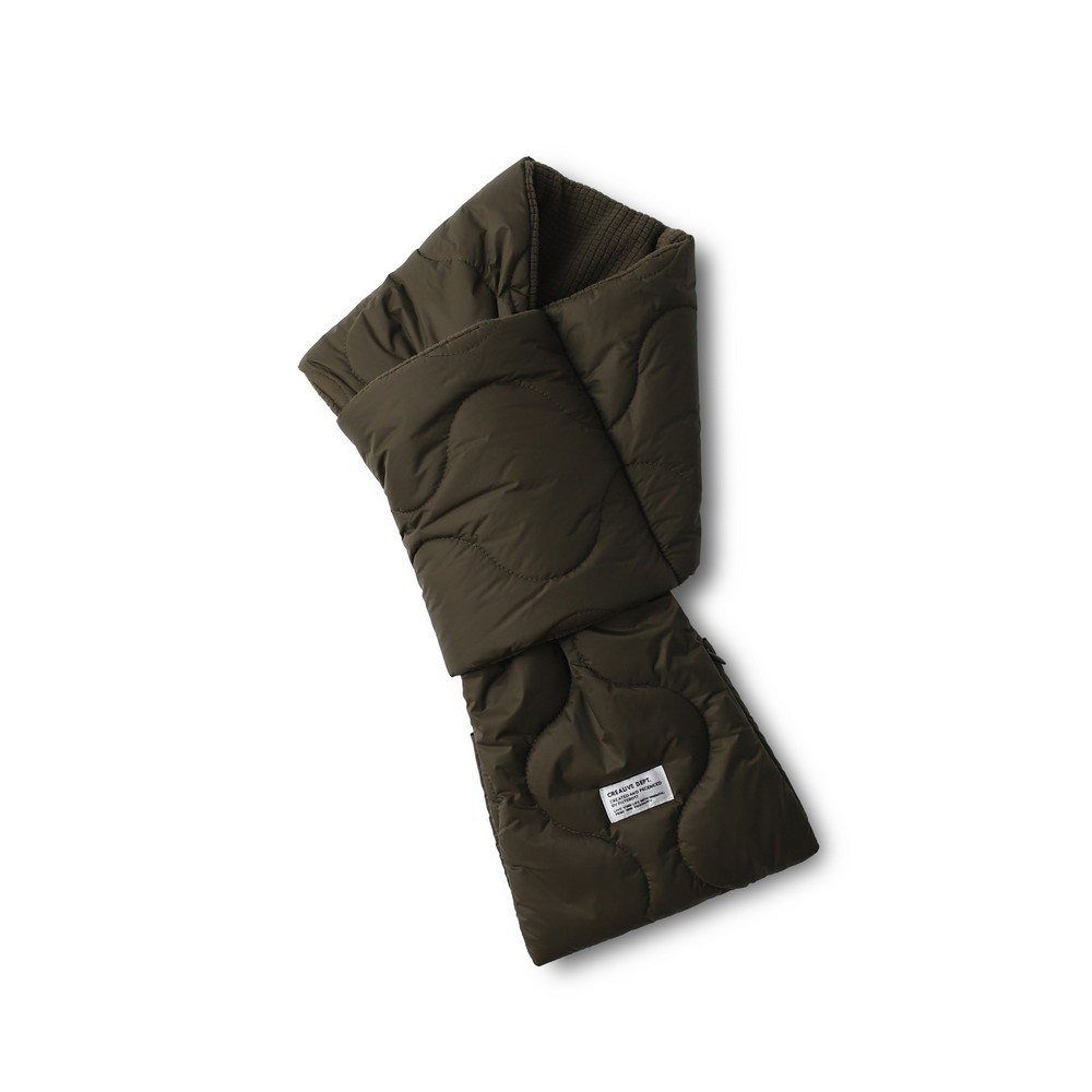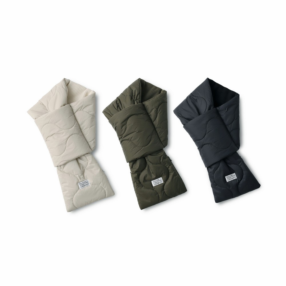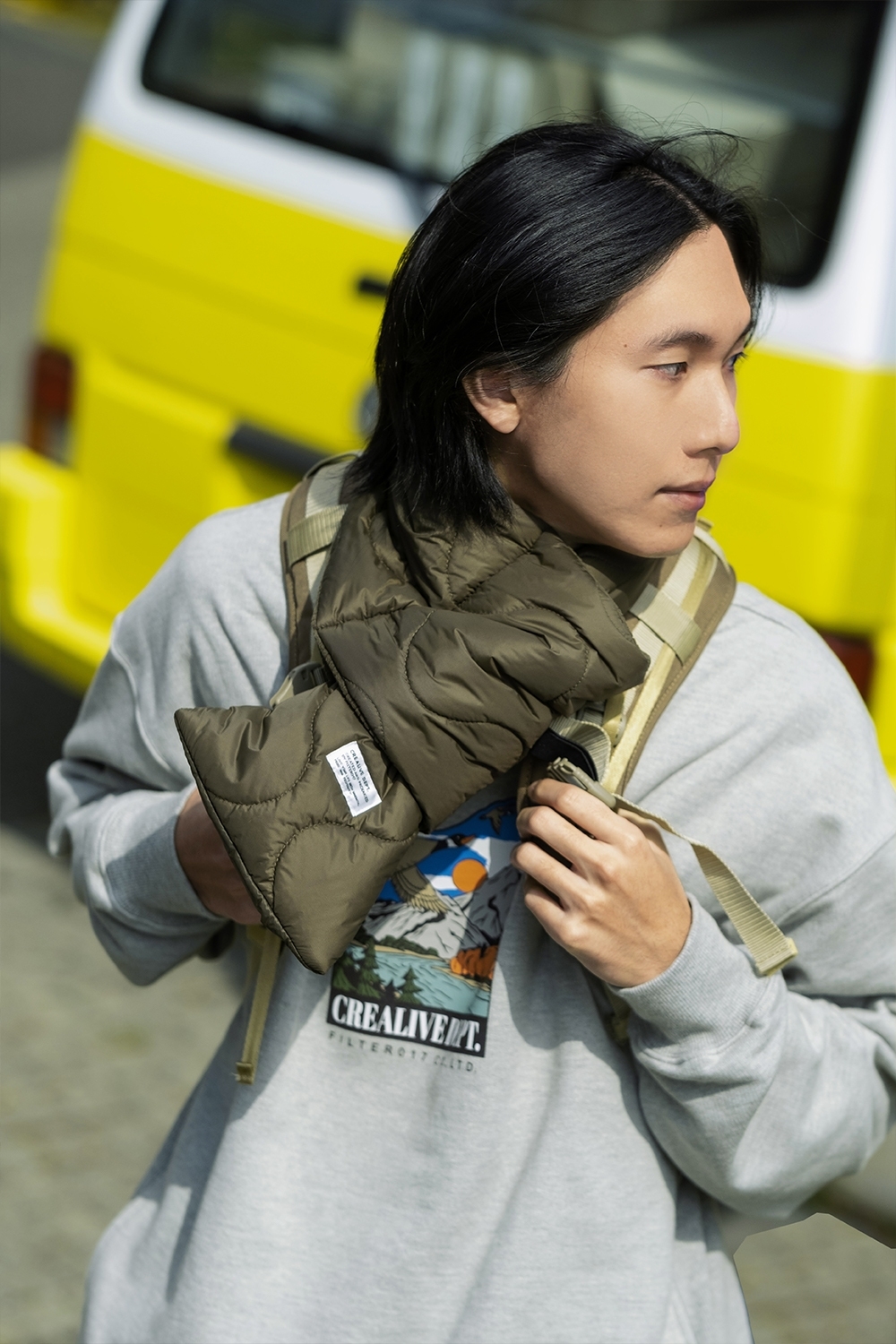 將基礎款的鋪棉圍巾融入口袋細節,並設定為適合放入零錢,悠遊卡、耳機等小物的大小,增添了攜帶隨身小物的便利性;也增加可收納的設計,未使用時可通過摺疊來減少收納的體積,軍事感十足的葫蘆紋衍縫更能作為著用時整體的細節提點。