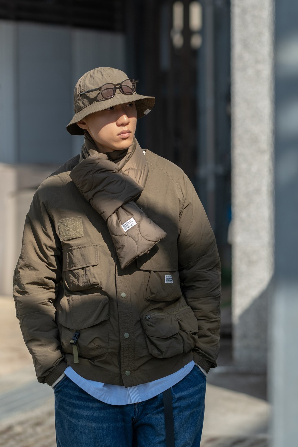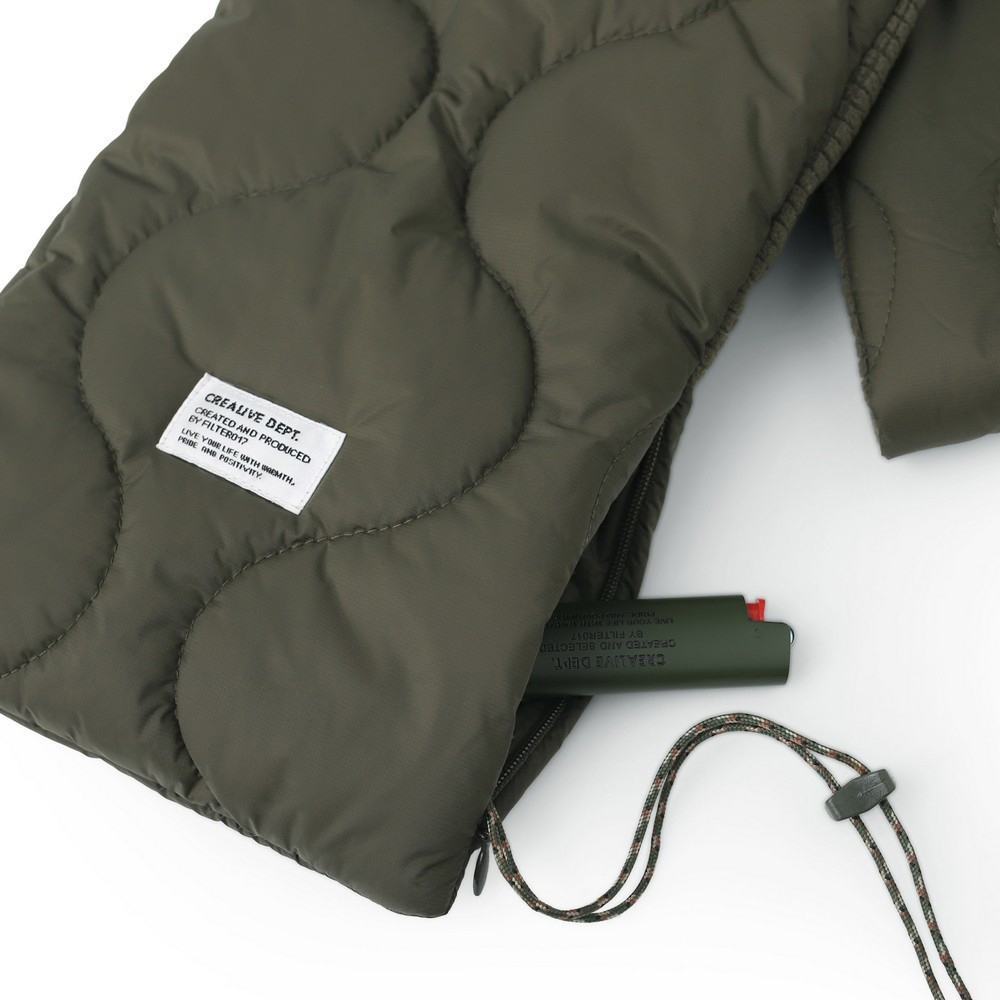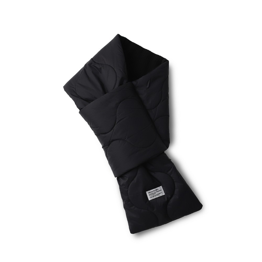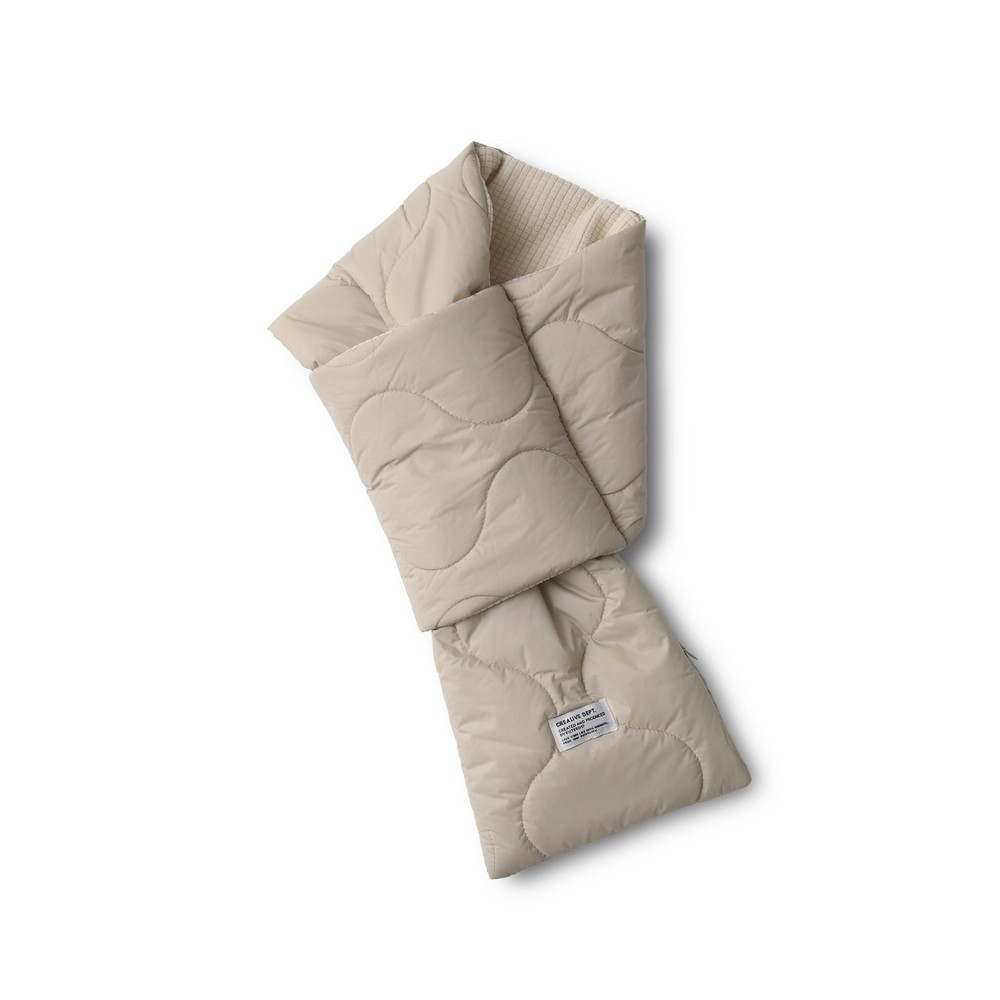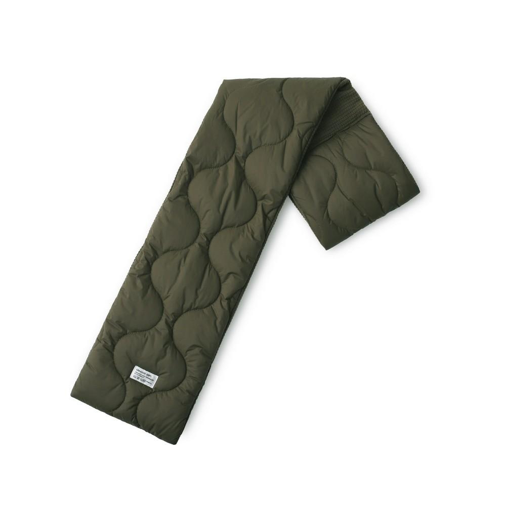將基礎款的鋪棉圍巾融入口袋細節,並設定為適合放入零錢,悠遊卡、耳機等小物的大小,增添了攜帶隨身小物的便利性;也增加可收納的設計,未使用時可通過摺疊來減少收納的體積,軍事感十足的葫蘆紋衍縫更能作為著用時整體的細節提點。