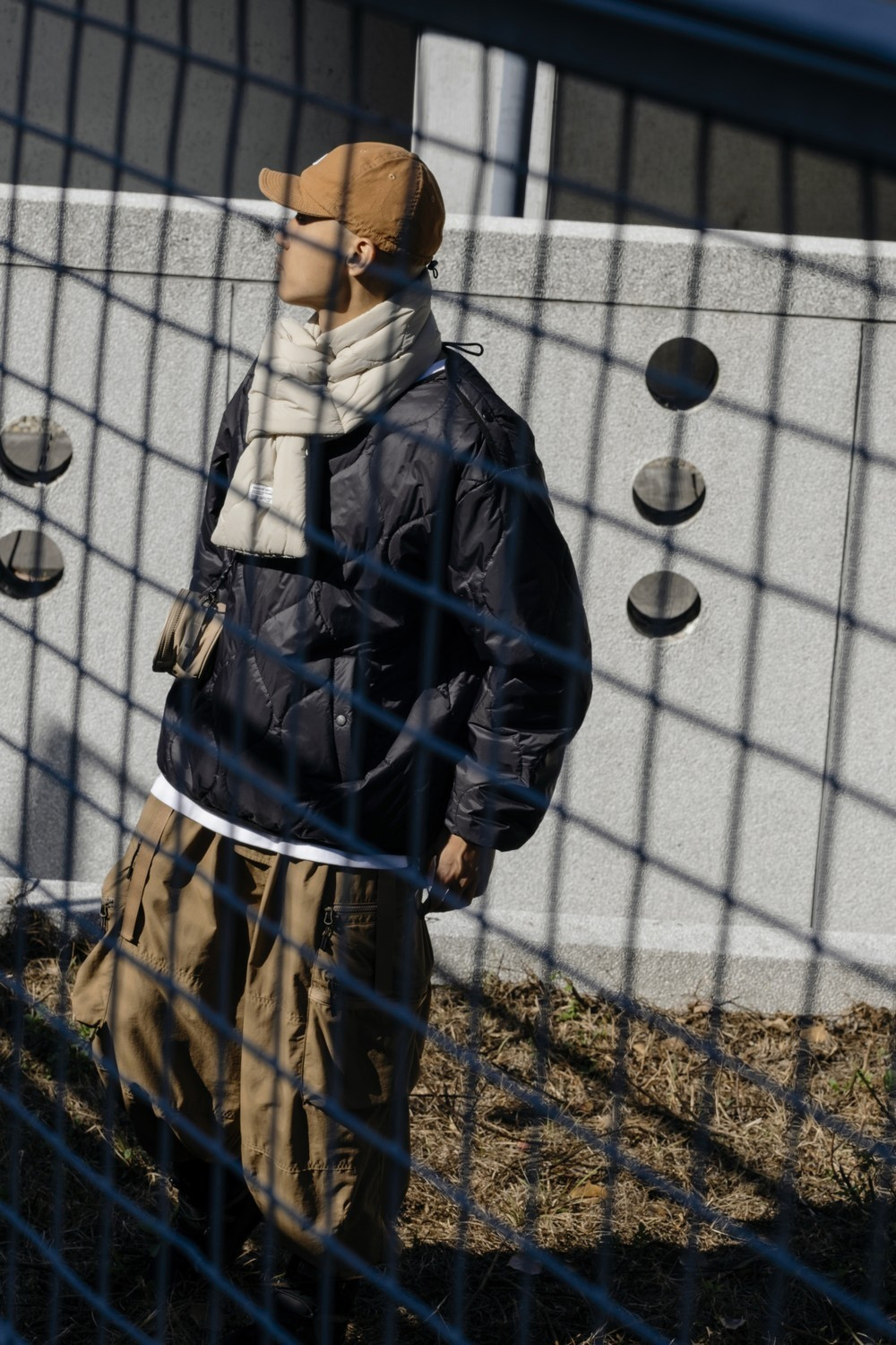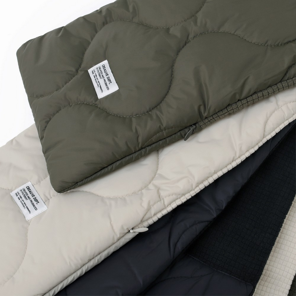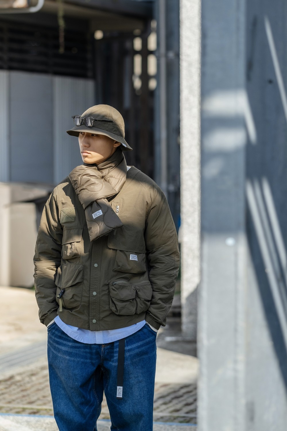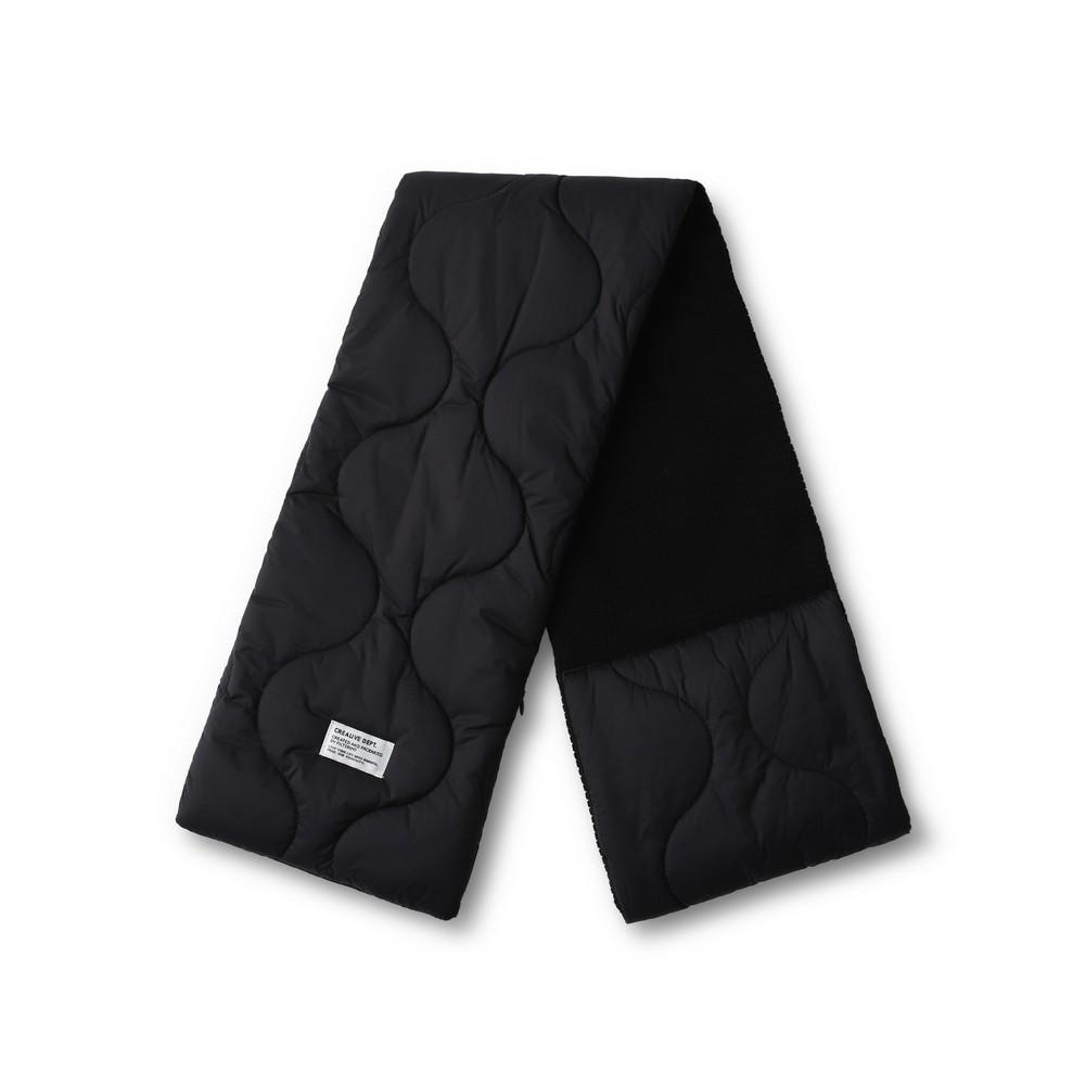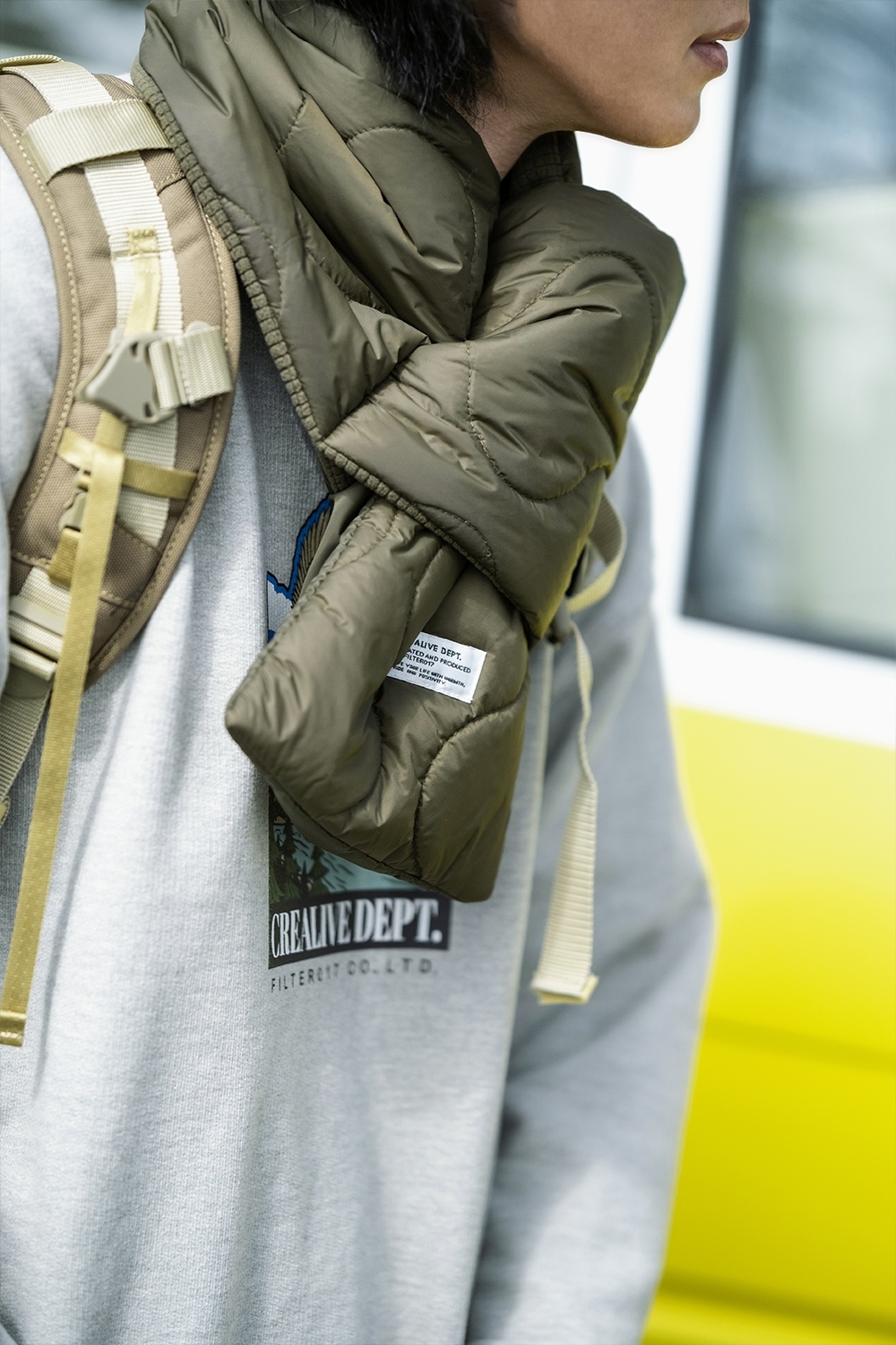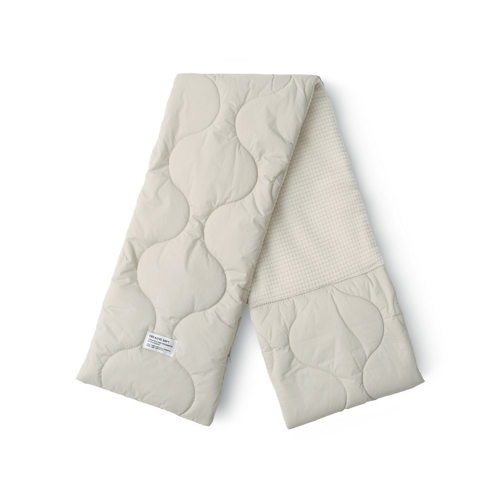 將基礎款的鋪棉圍巾融入口袋細節,並設定為適合放入零錢,悠遊卡、耳機等小物的大小,增添了攜帶隨身小物的便利性;也增加可收納的設計,未使用時可通過摺疊來減少收納的體積,軍事感十足的葫蘆紋衍縫更能作為著用時整體的細節提點。