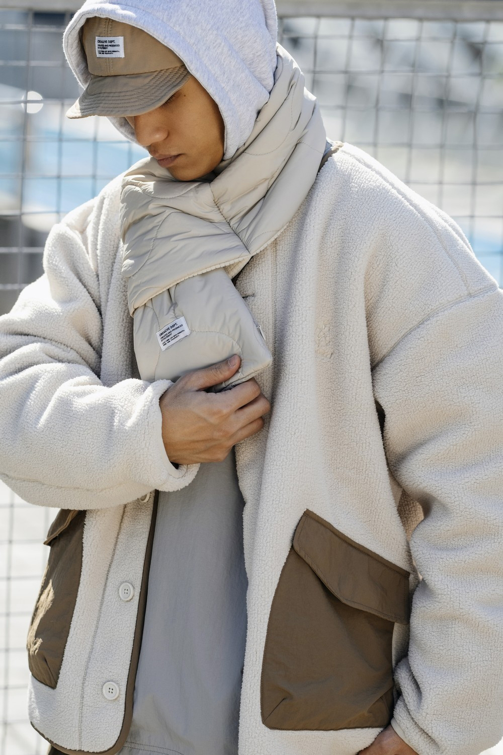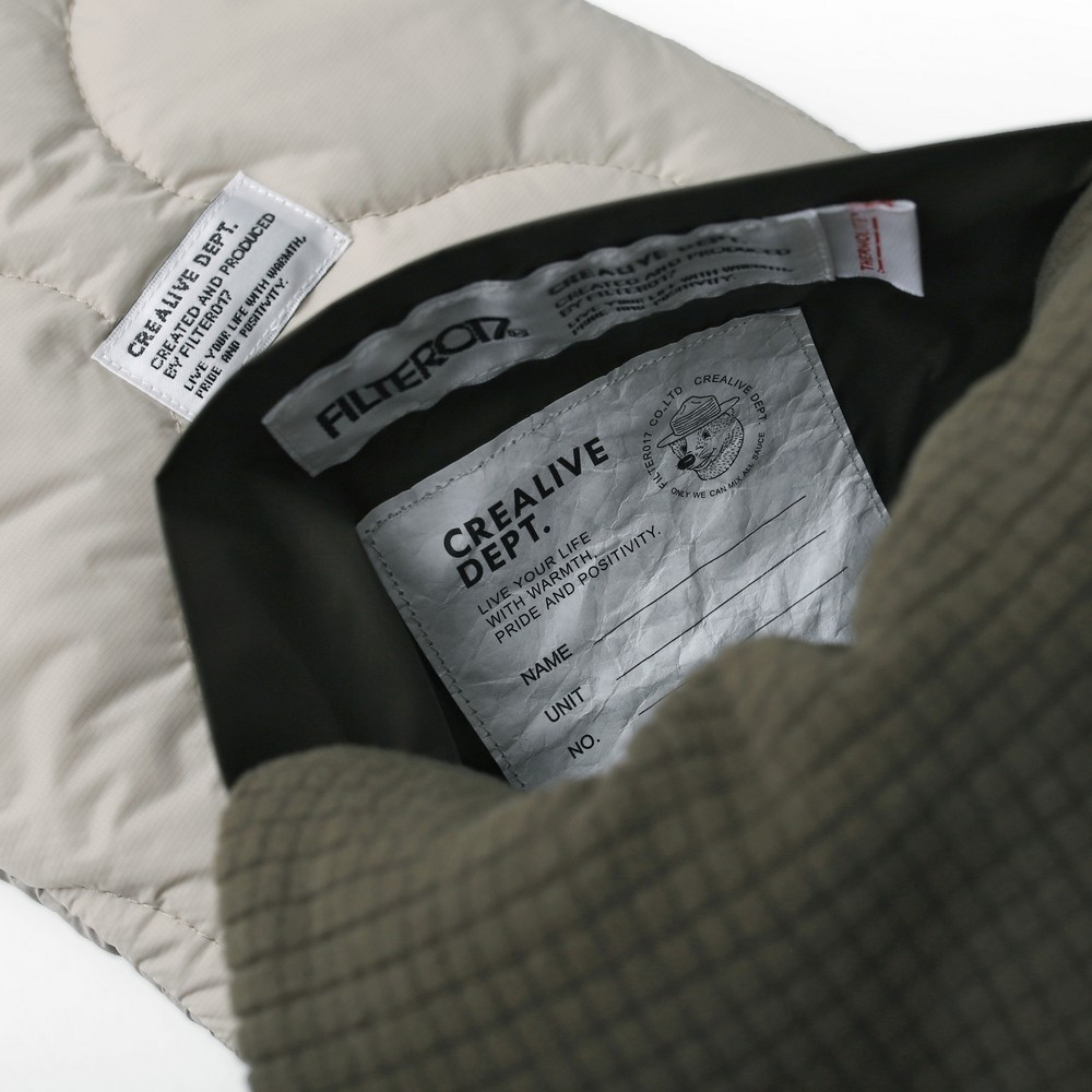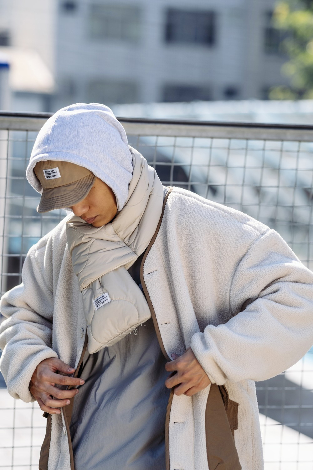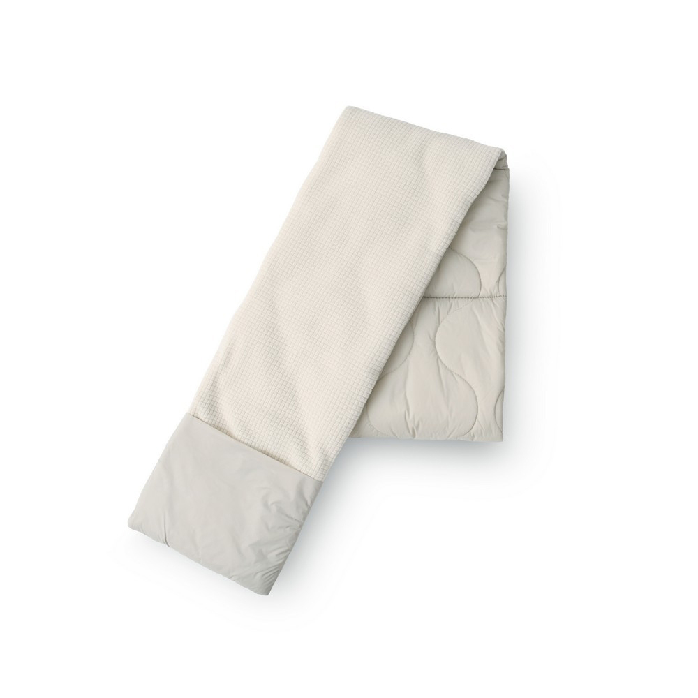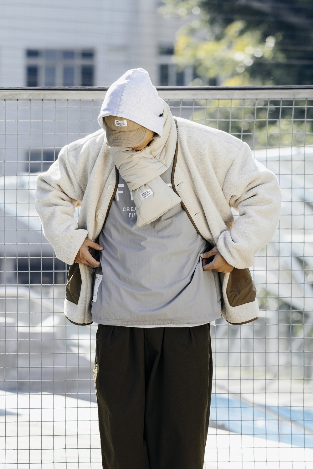 將基礎款的鋪棉圍巾融入口袋細節,並設定為適合放入零錢,悠遊卡、耳機等小物的大小,增添了攜帶隨身小物的便利性;也增加可收納的設計,未使用時可通過摺疊來減少收納的體積,軍事感十足的葫蘆紋衍縫更能作為著用時整體的細節提點。