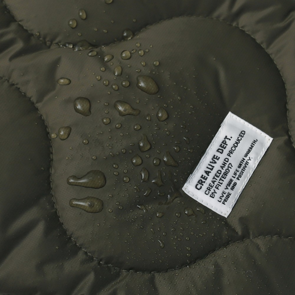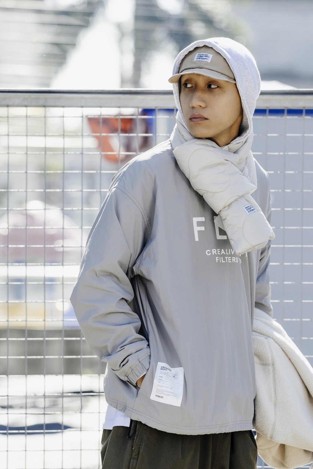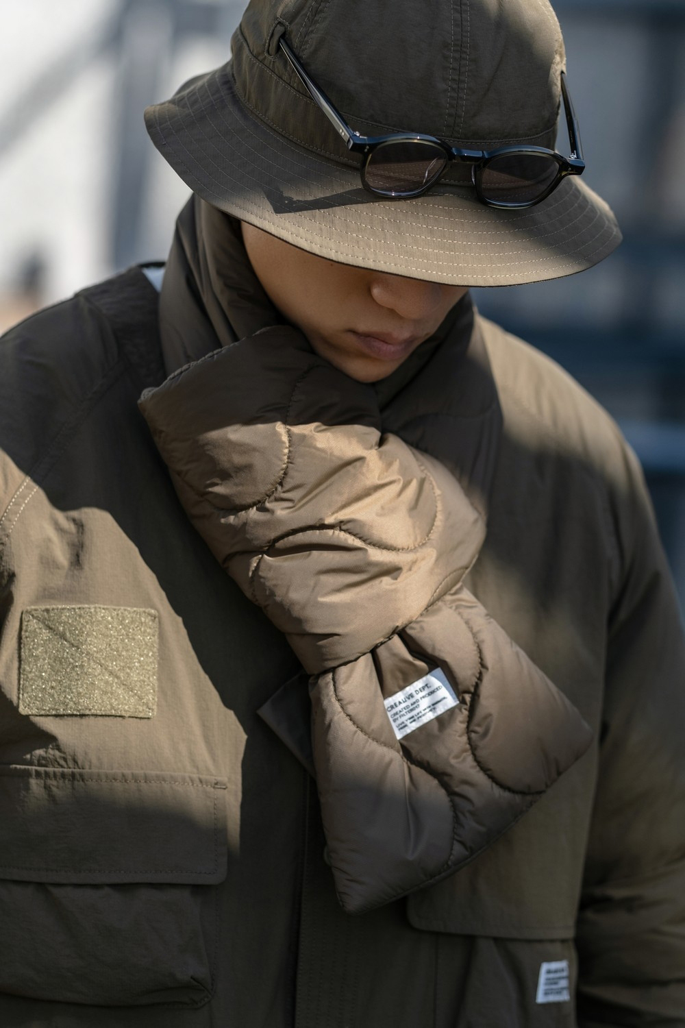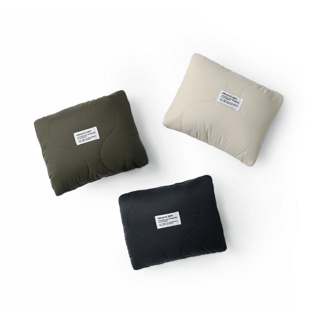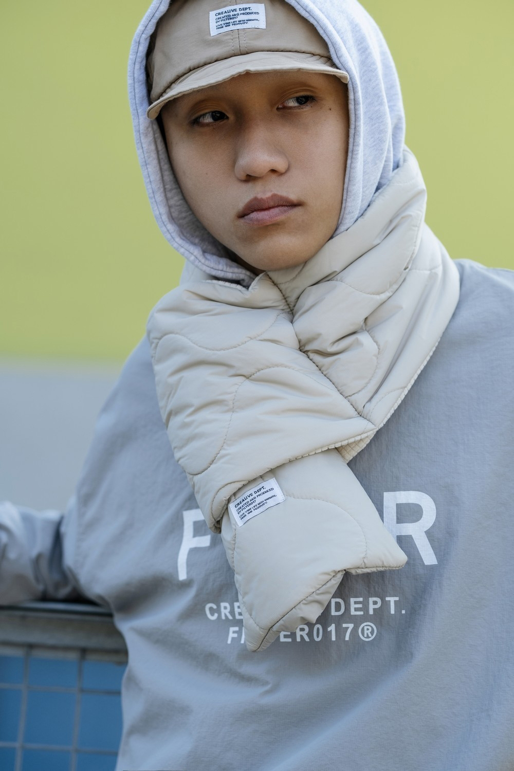 將基礎款的鋪棉圍巾融入口袋細節,並設定為適合放入零錢,悠遊卡、耳機等小物的大小,增添了攜帶隨身小物的便利性;也增加可收納的設計,未使用時可通過摺疊來減少收納的體積,軍事感十足的葫蘆紋衍縫更能作為著用時整體的細節提點。