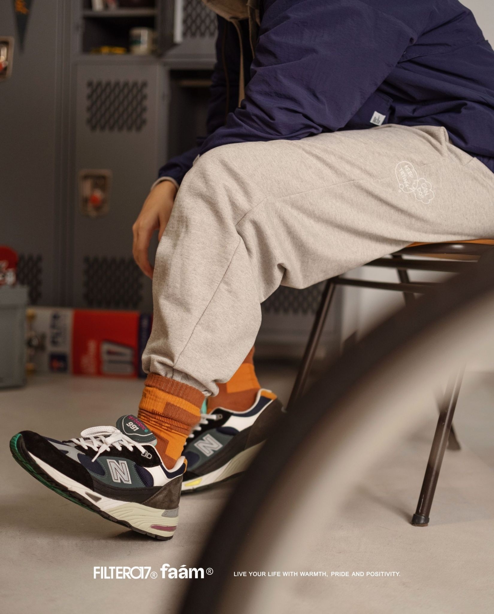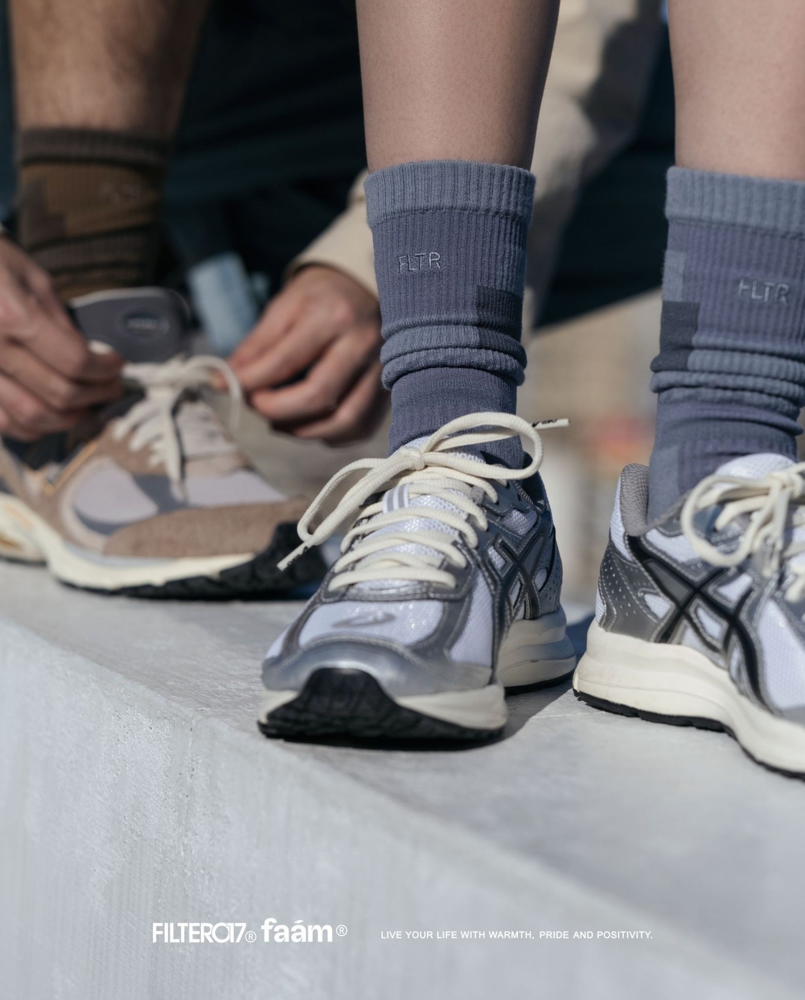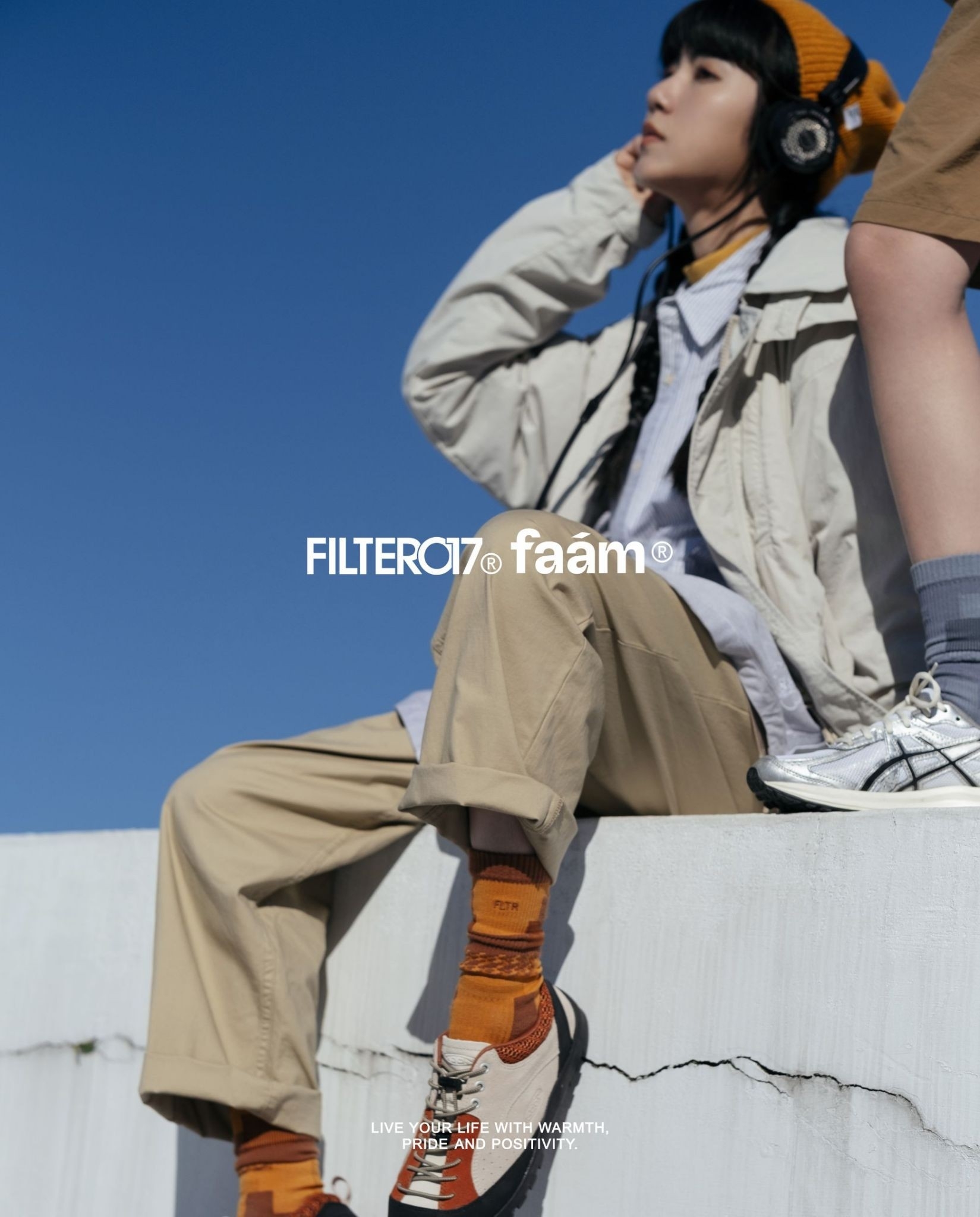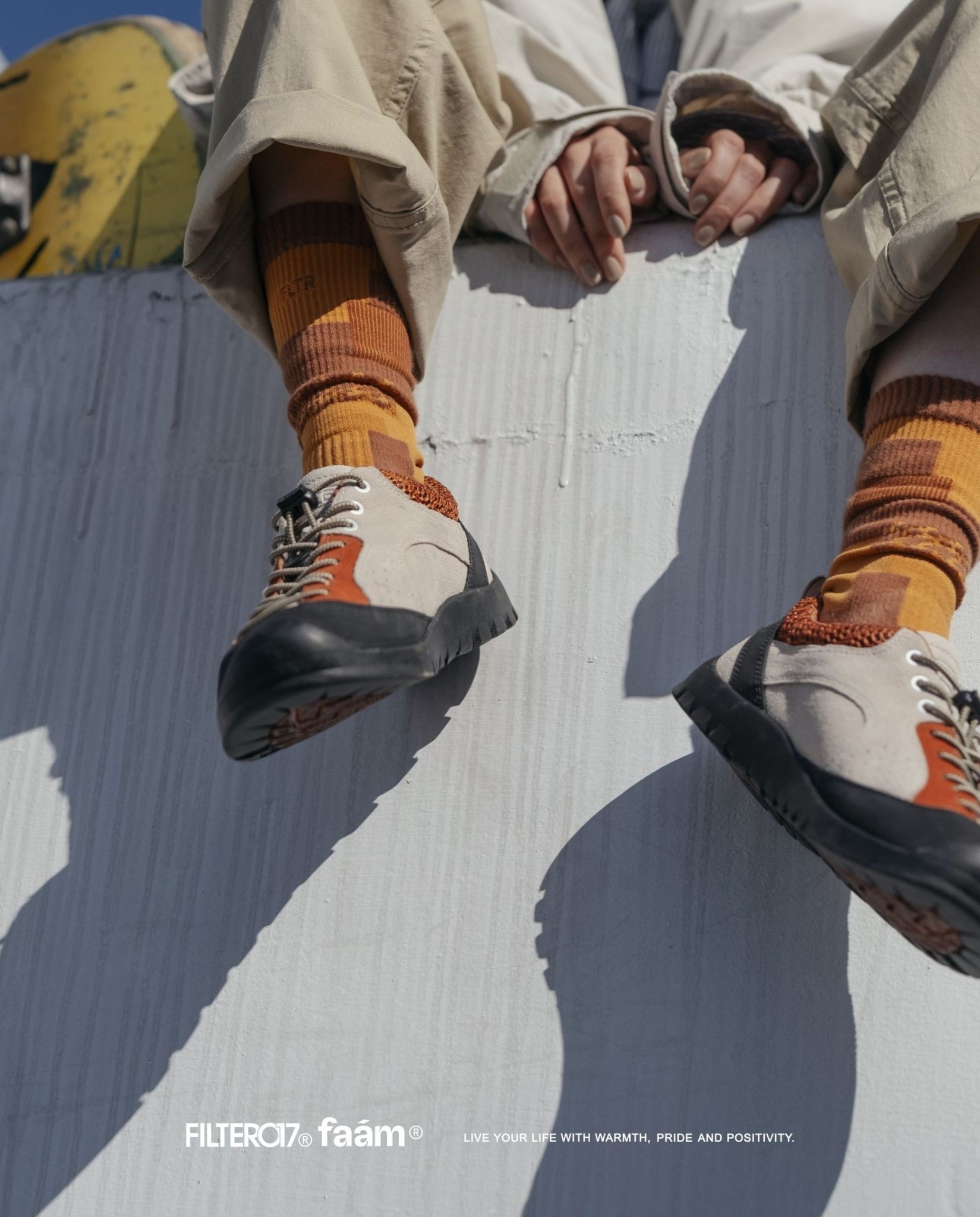 藉由織品的組織變化,使表面呈現低調且具細節的紋理,再加入色塊拼接,將襪身賦予舊布重製拼接的輪廓與視覺,充分演繹FILTER017® 深耕於各領域及次文化的品牌軸向。