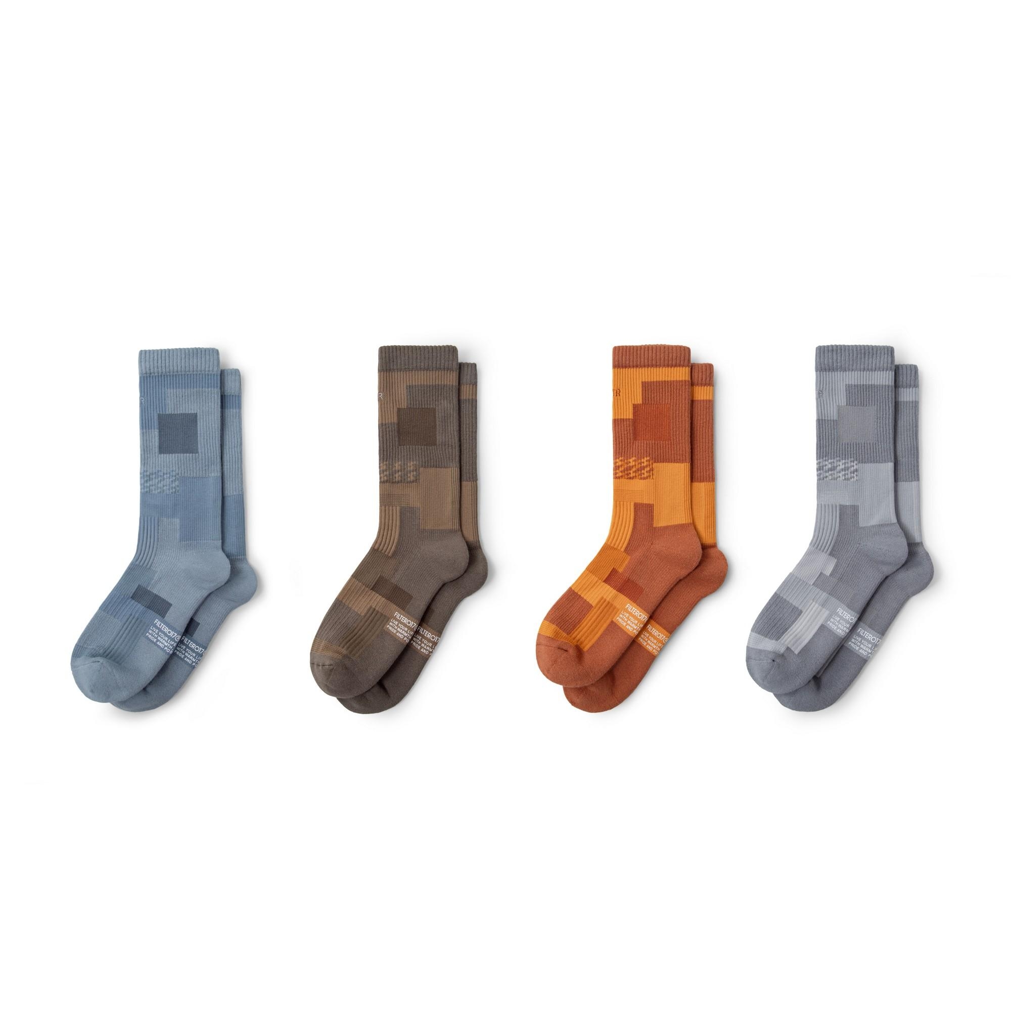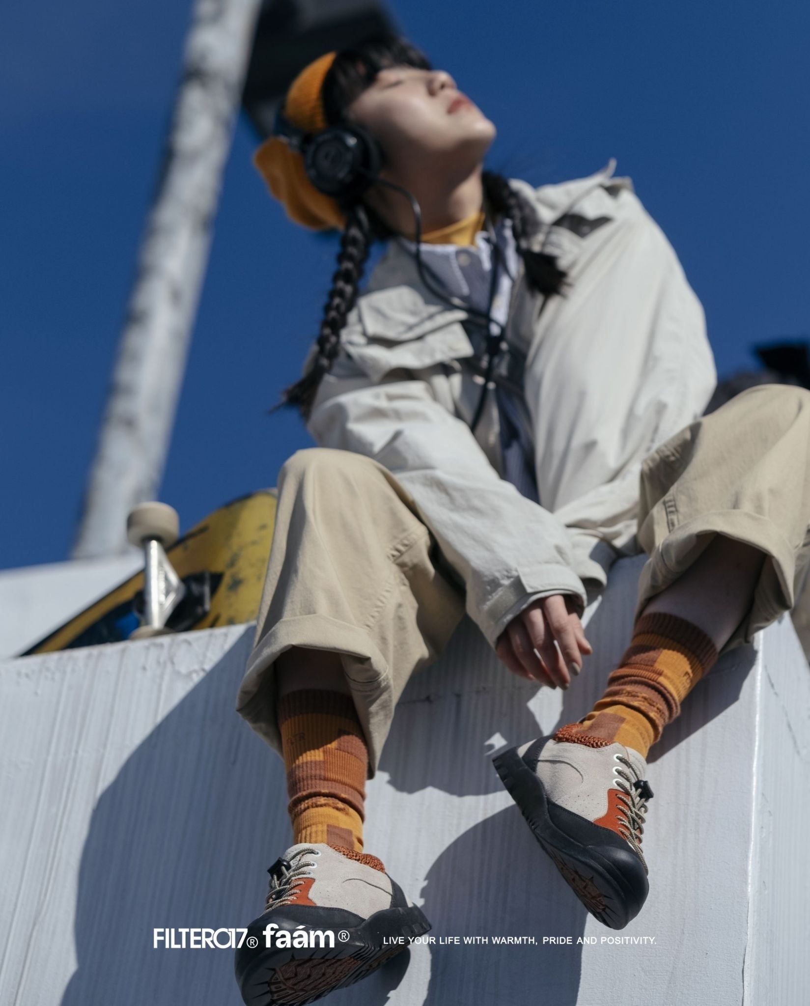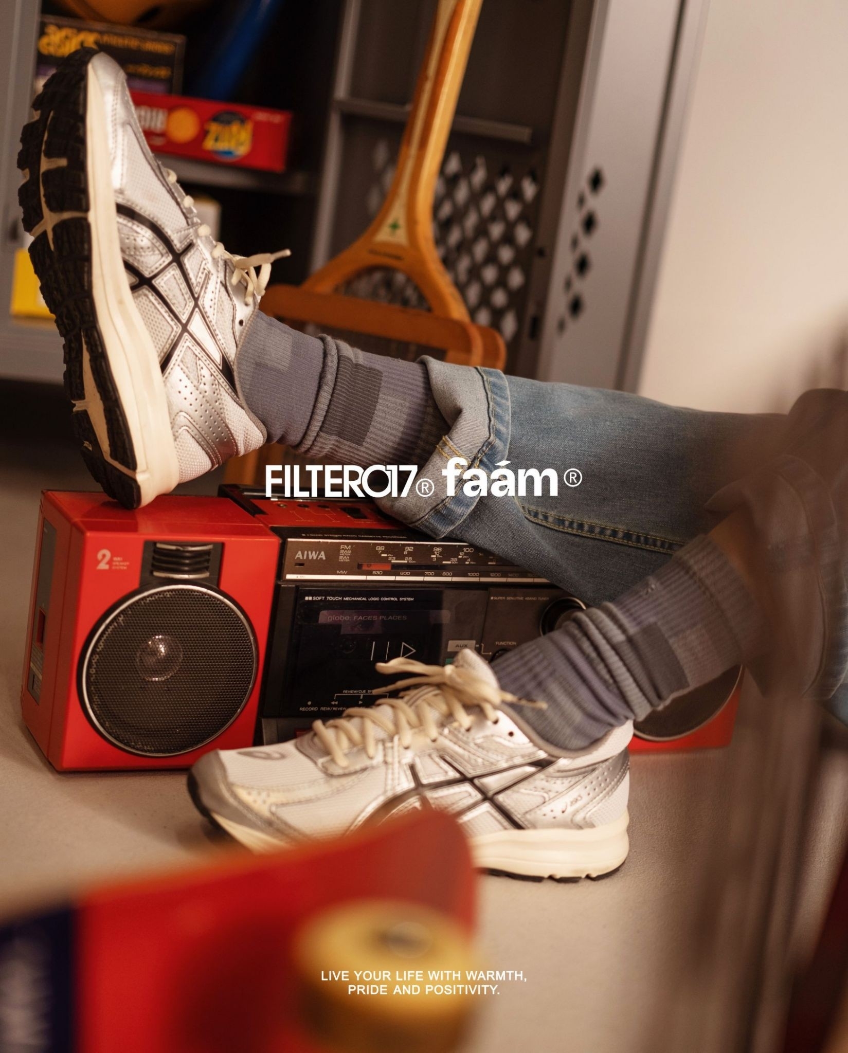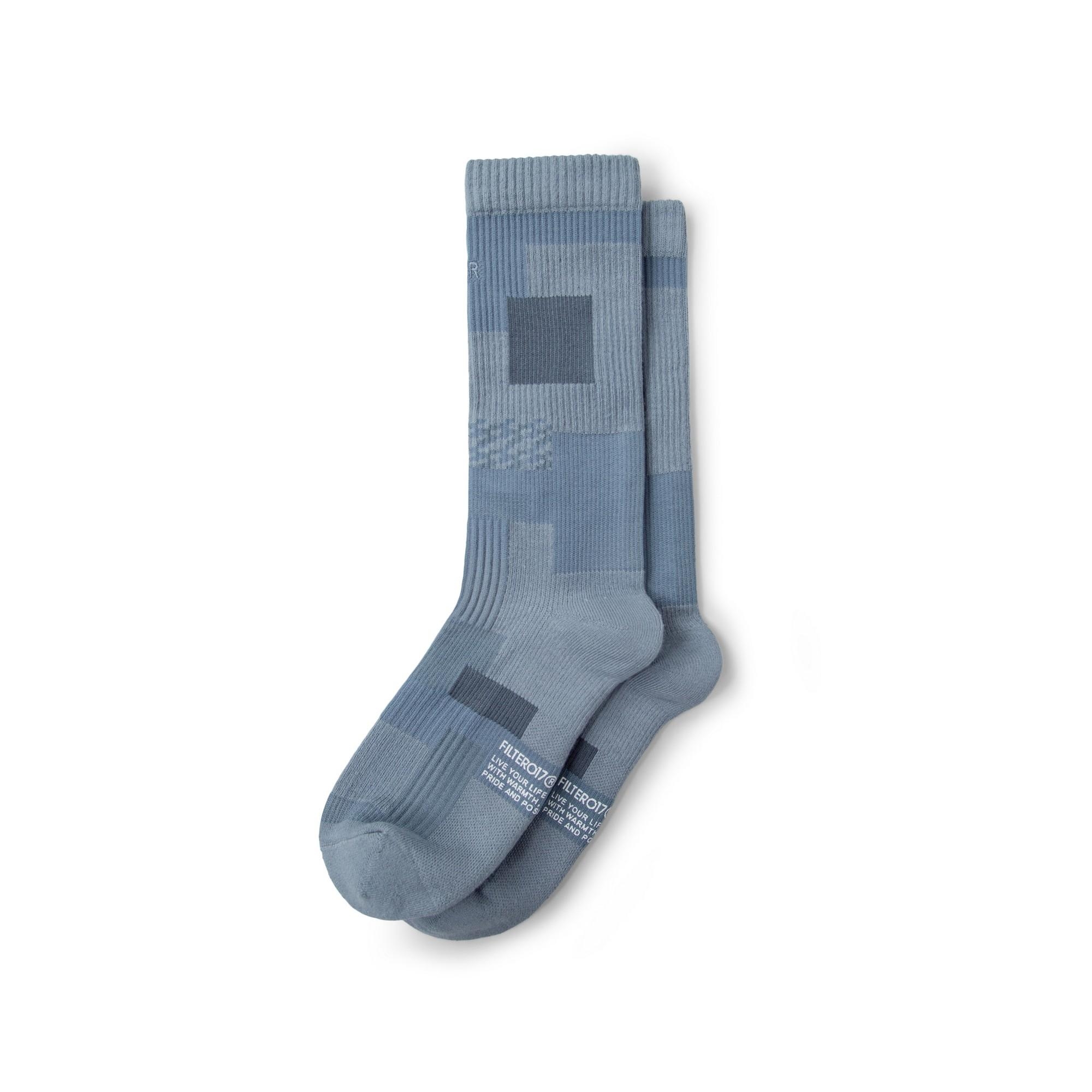 藉由織品的組織變化,使表面呈現低調且具細節的紋理,再加入色塊拼接,將襪身賦予舊布重製拼接的輪廓與視覺,充分演繹FILTER017® 深耕於各領域及次文化的品牌軸向。