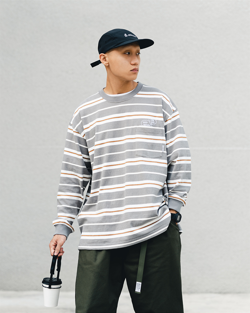 於口袋細節上以帶有80-90年代塗鴉感的美式漫畫文字刺繡做為視覺提點,寬鬆休閒的流行輪廓,是近年 City boy 街頭學院風潮下,不可或缺的基本單品。