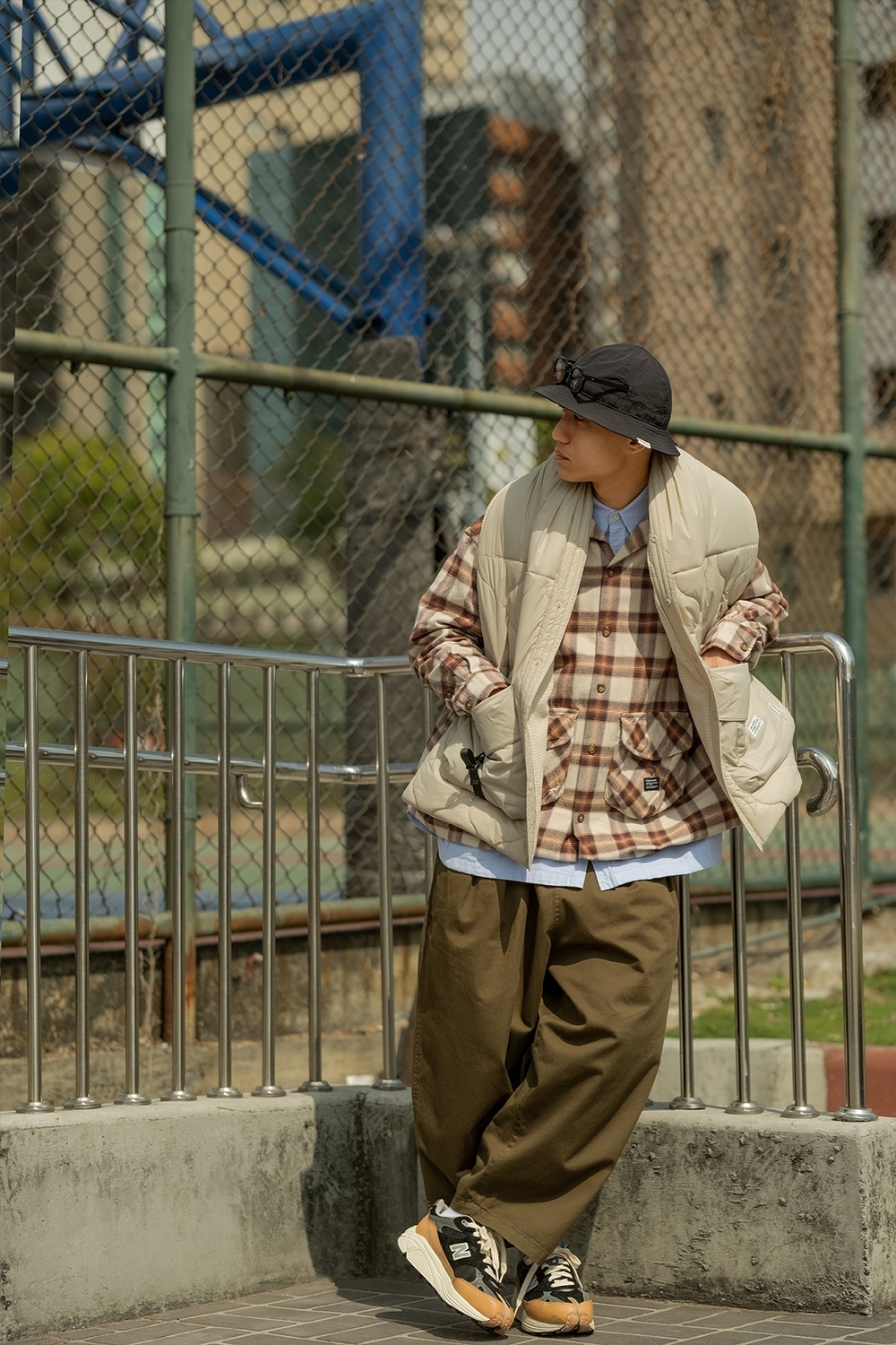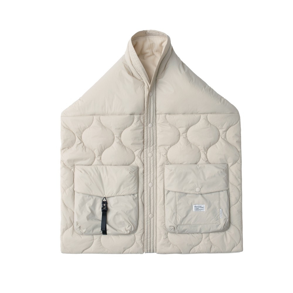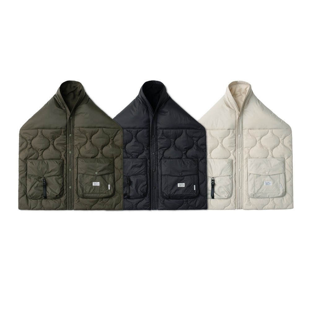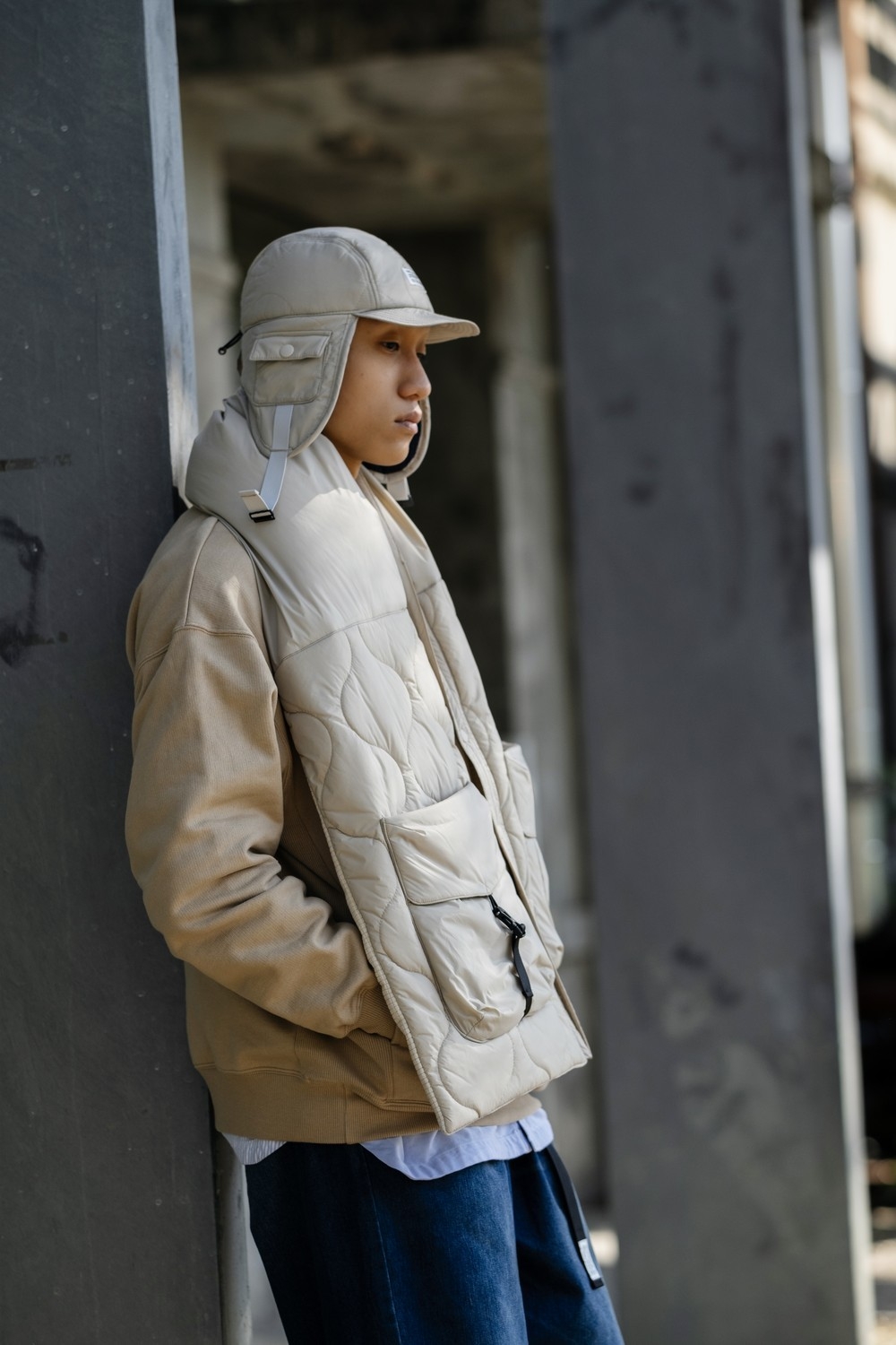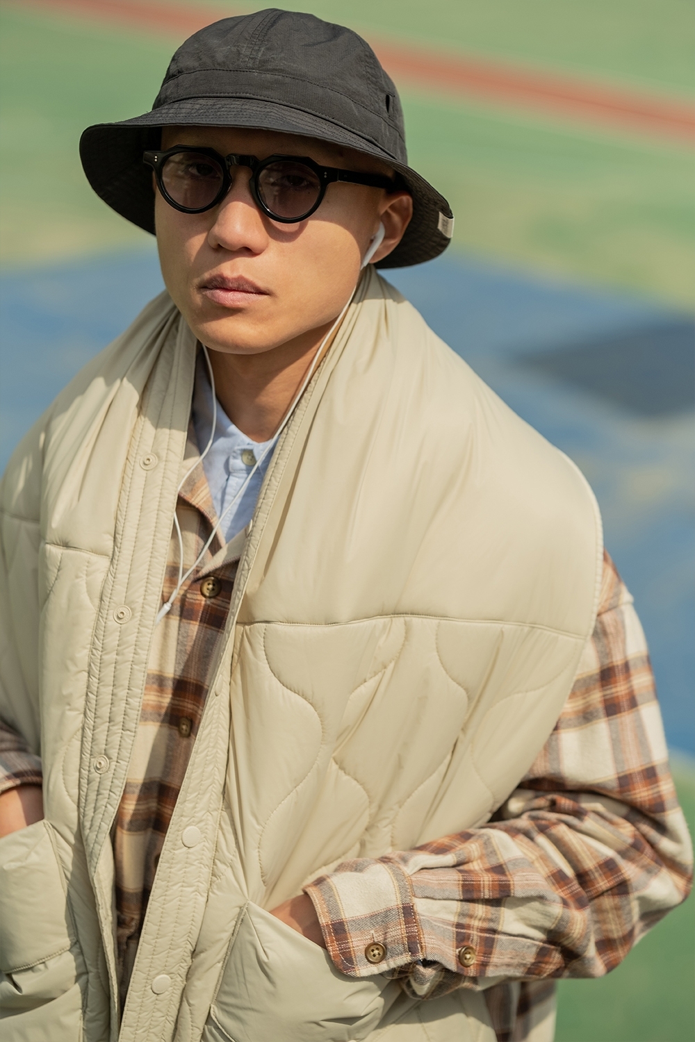 以圍巾與披肩使用機能與造型混合的新型態保暖單品,不對稱設計的口袋配置呈現視覺豐富性,左側口袋由巡洋艦外套中的指南針口袋汲取靈感,為造型層次提升,同時增添收納與保暖實用度。右側口袋則搭載貫穿本季視覺系統特色的YKK®扣具,本體以衍縫工法並考究改良軍工裝傳統製衣細節,巧妙演繹帶有軍事風格卻不過於硬核沉重的輕戶外休閒風格,為實用性與造型考量上兼具的重點單品。