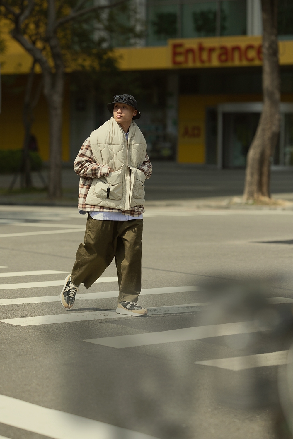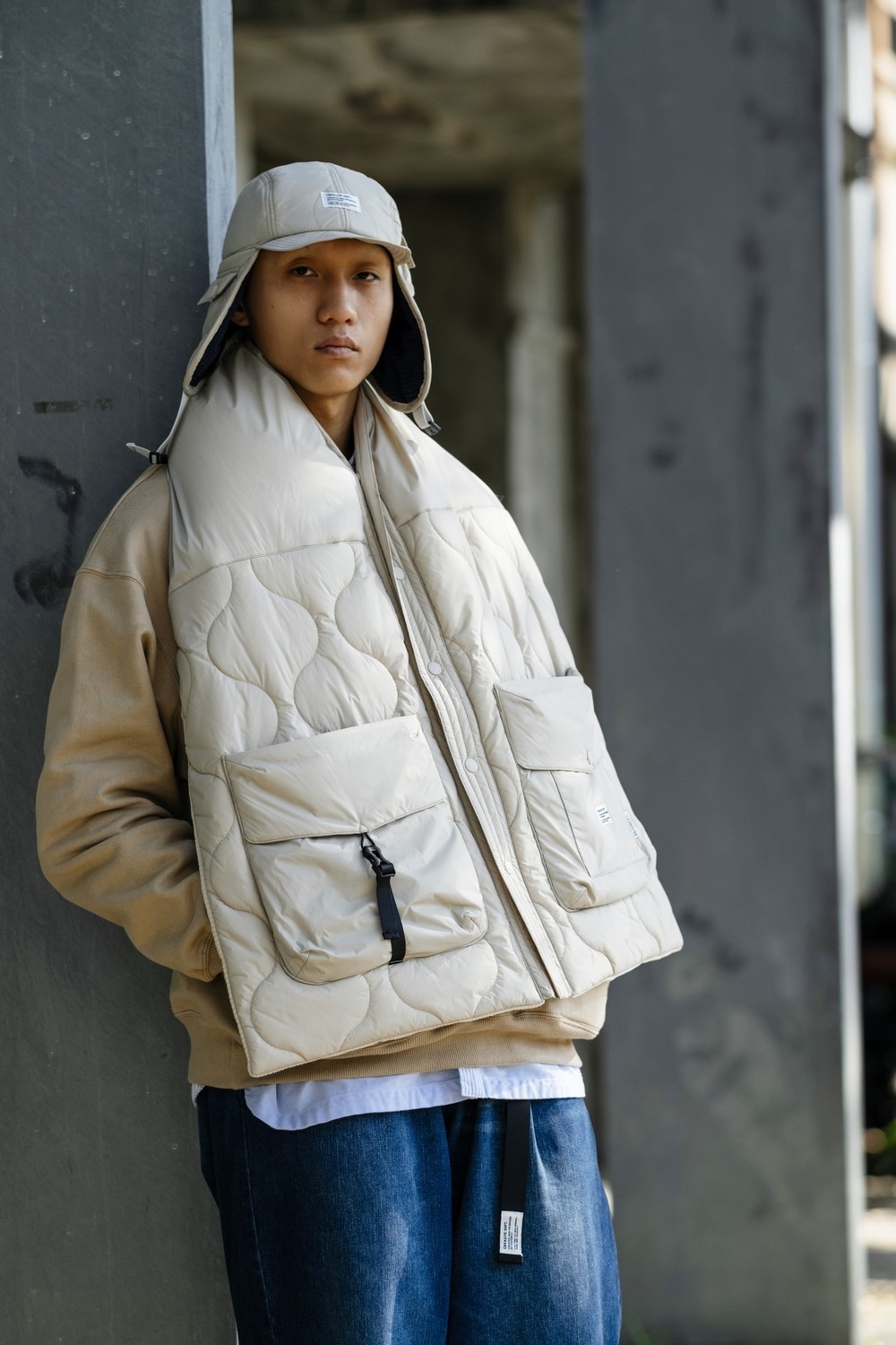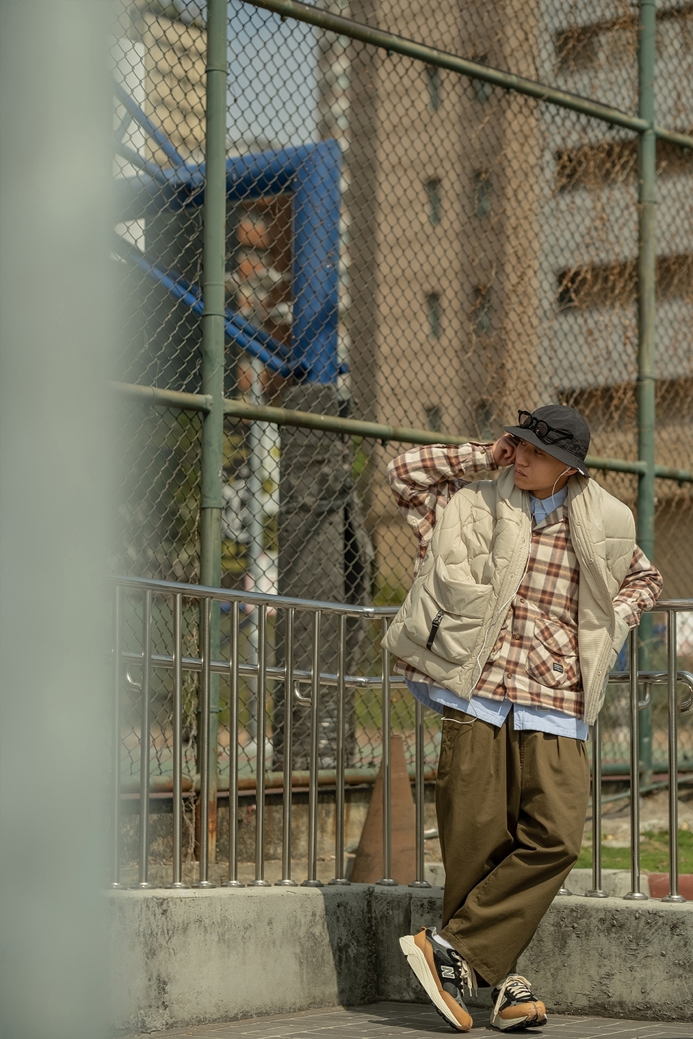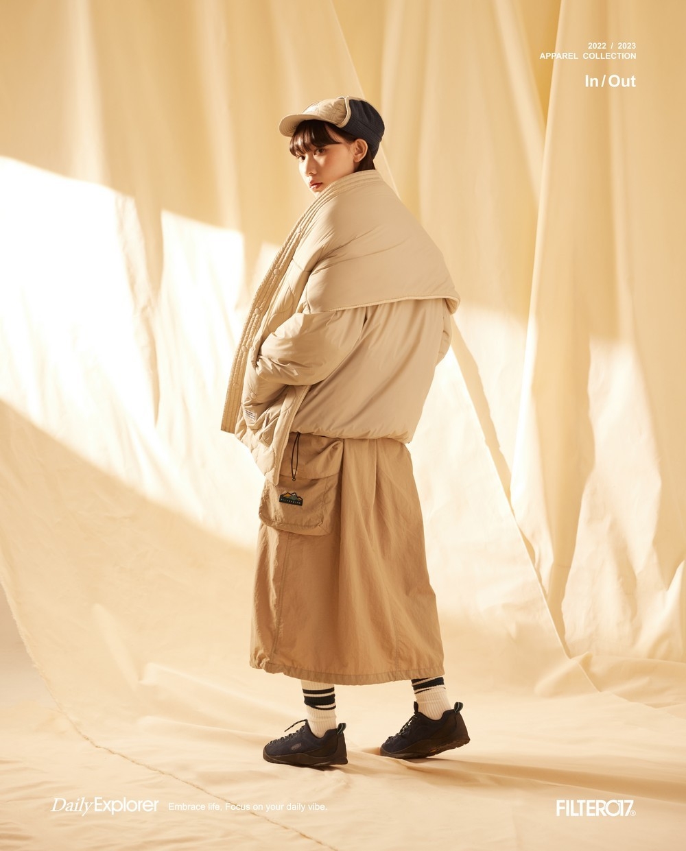 以圍巾與披肩使用機能與造型混合的新型態保暖單品,不對稱設計的口袋配置呈現視覺豐富性,左側口袋由巡洋艦外套中的指南針口袋汲取靈感,為造型層次提升,同時增添收納與保暖實用度。右側口袋則搭載貫穿本季視覺系統特色的YKK®扣具,本體以衍縫工法並考究改良軍工裝傳統製衣細節,巧妙演繹帶有軍事風格卻不過於硬核沉重的輕戶外休閒風格,為實用性與造型考量上兼具的重點單品。