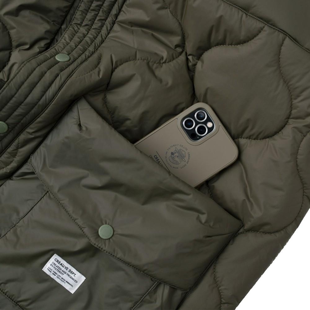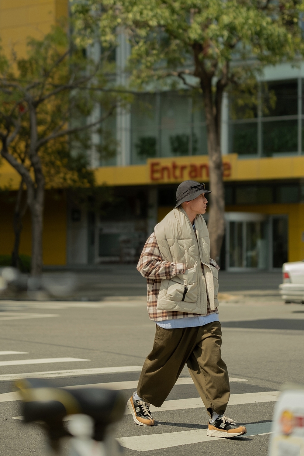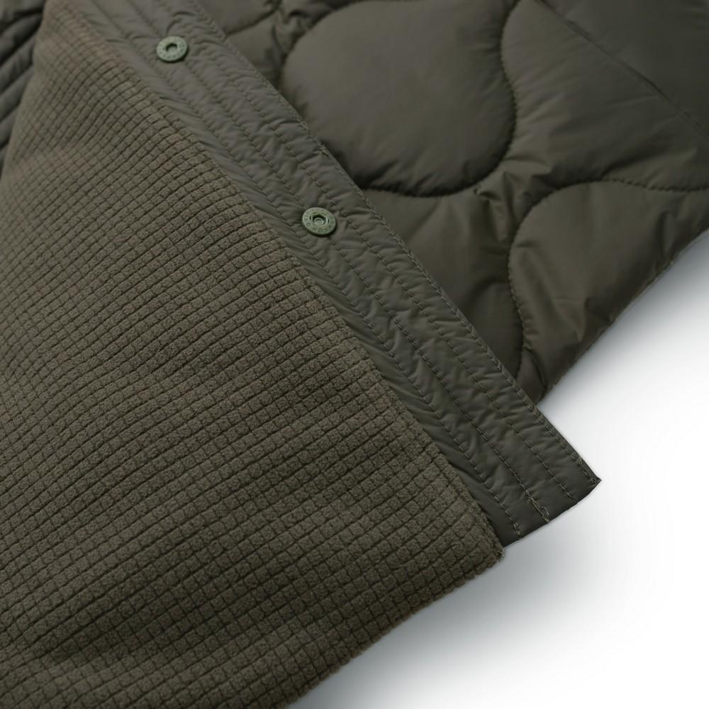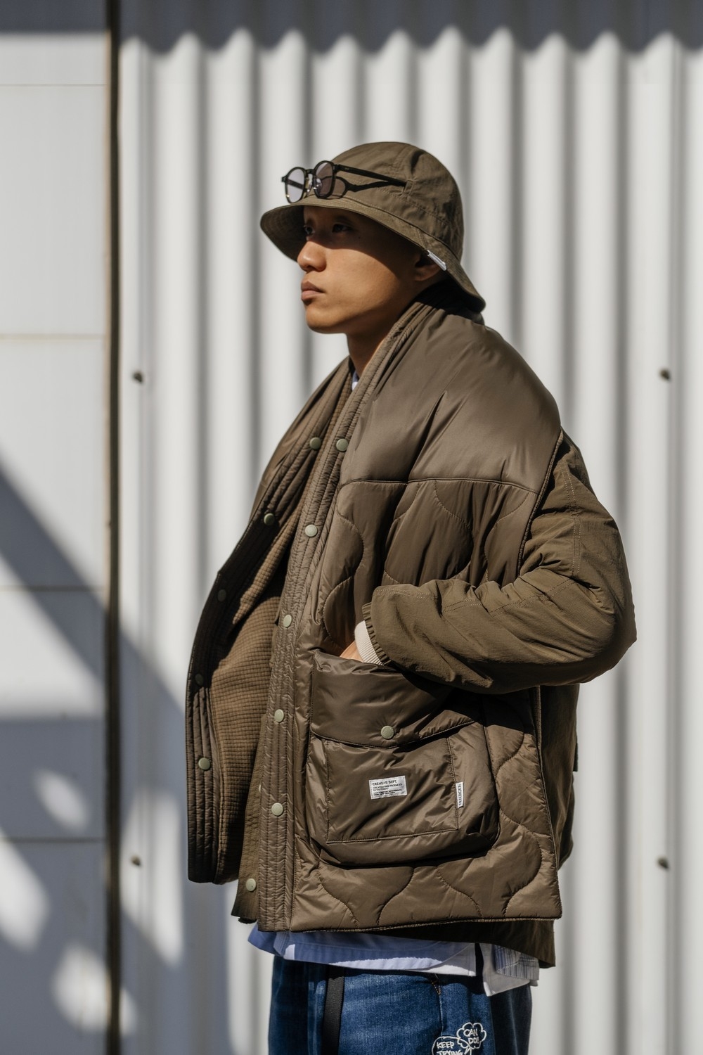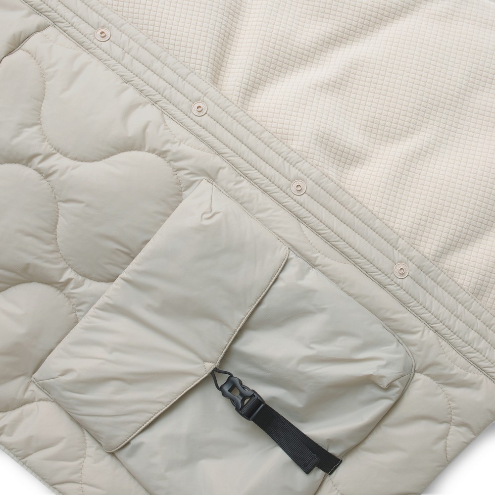以圍巾與披肩使用機能與造型混合的新型態保暖單品,不對稱設計的口袋配置呈現視覺豐富性,左側口袋由巡洋艦外套中的指南針口袋汲取靈感,為造型層次提升,同時增添收納與保暖實用度。右側口袋則搭載貫穿本季視覺系統特色的YKK®扣具,本體以衍縫工法並考究改良軍工裝傳統製衣細節,巧妙演繹帶有軍事風格卻不過於硬核沉重的輕戶外休閒風格,為實用性與造型考量上兼具的重點單品。