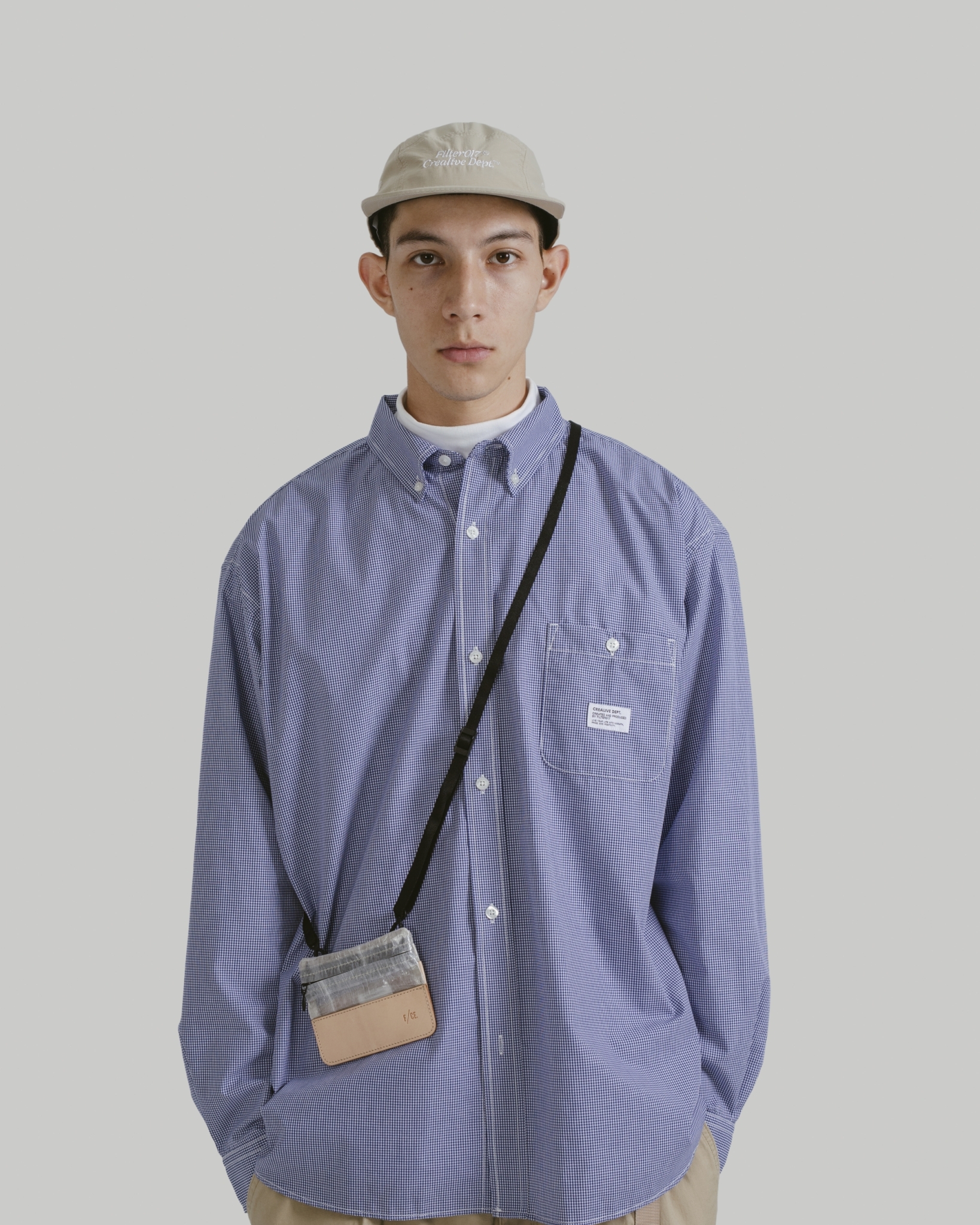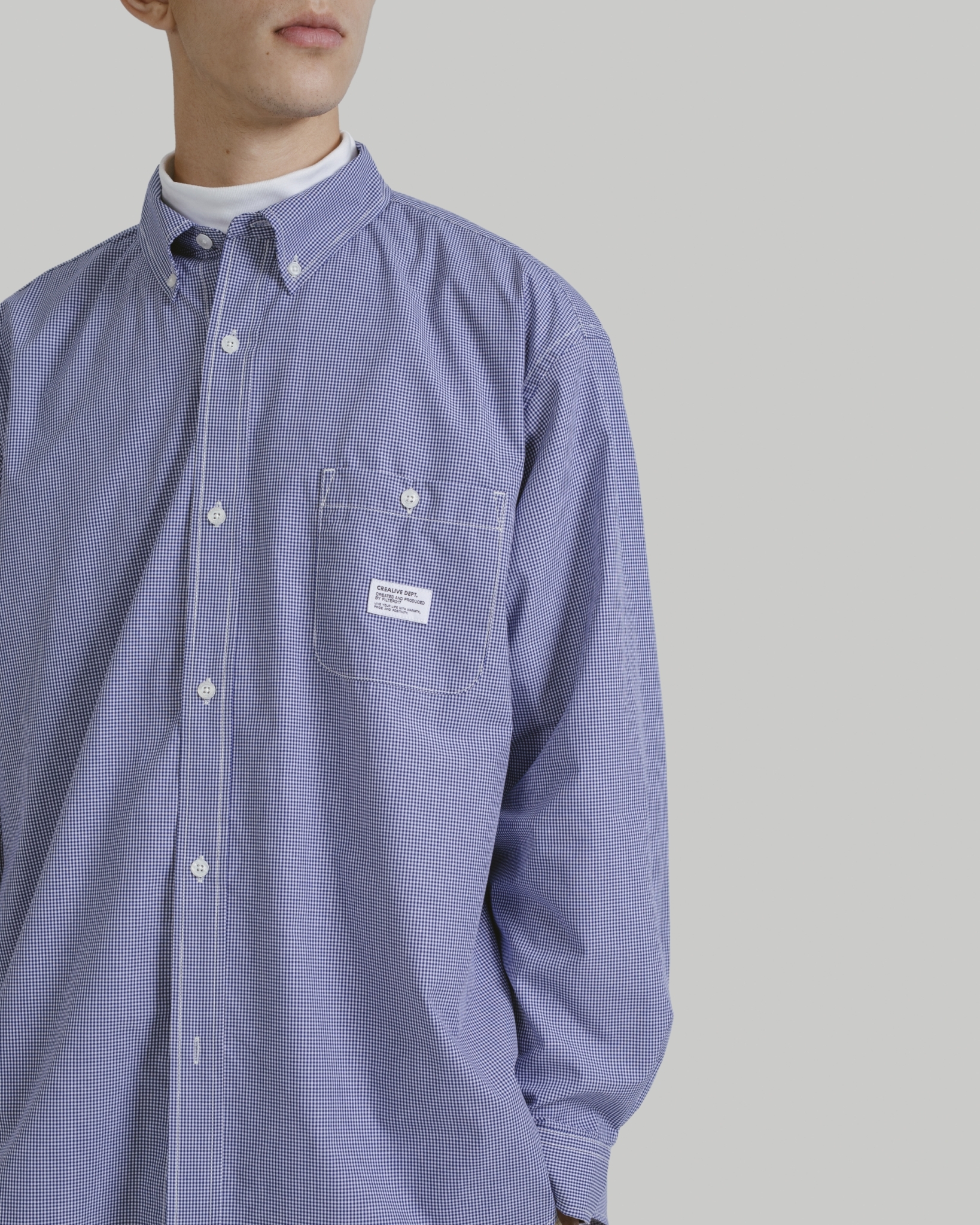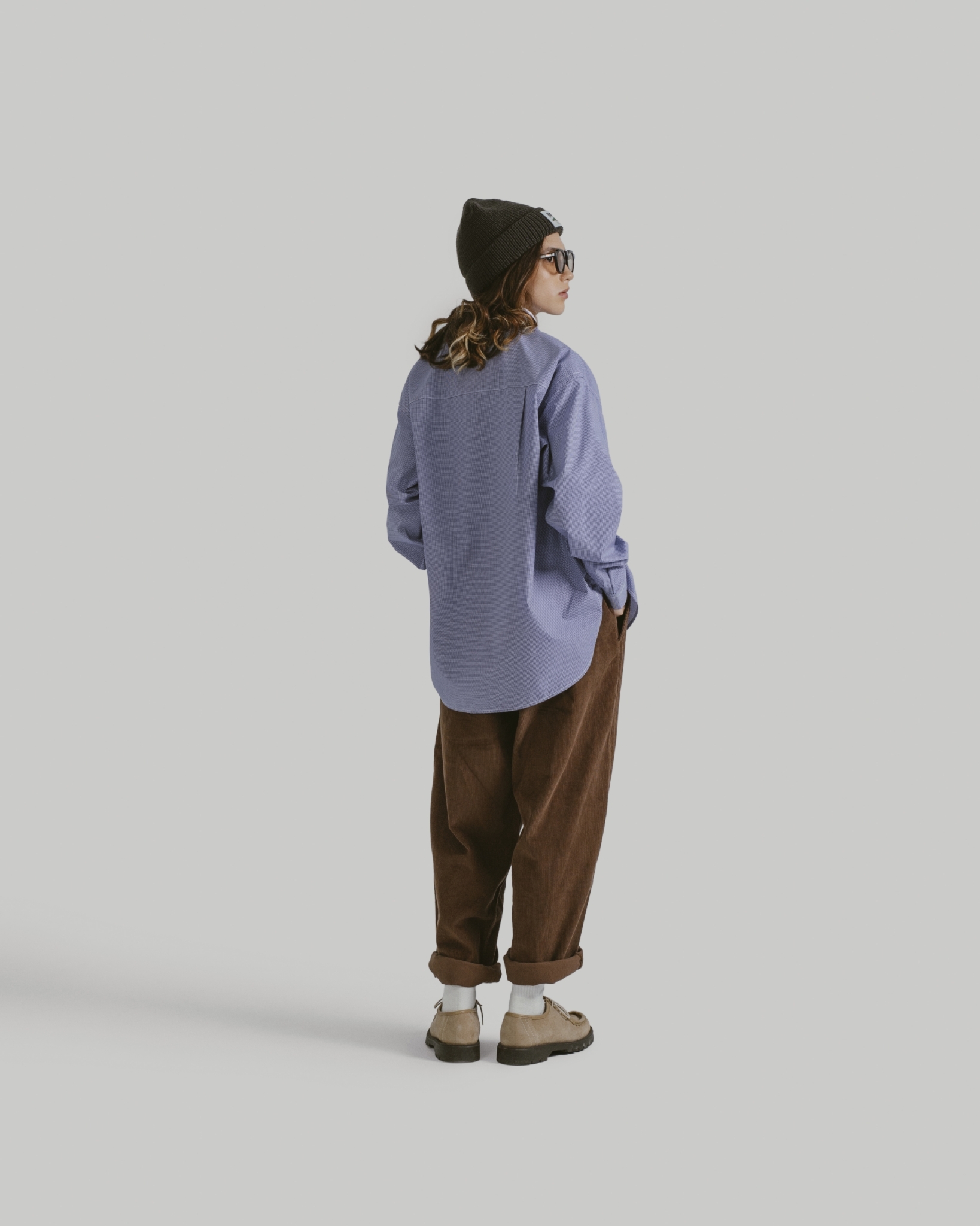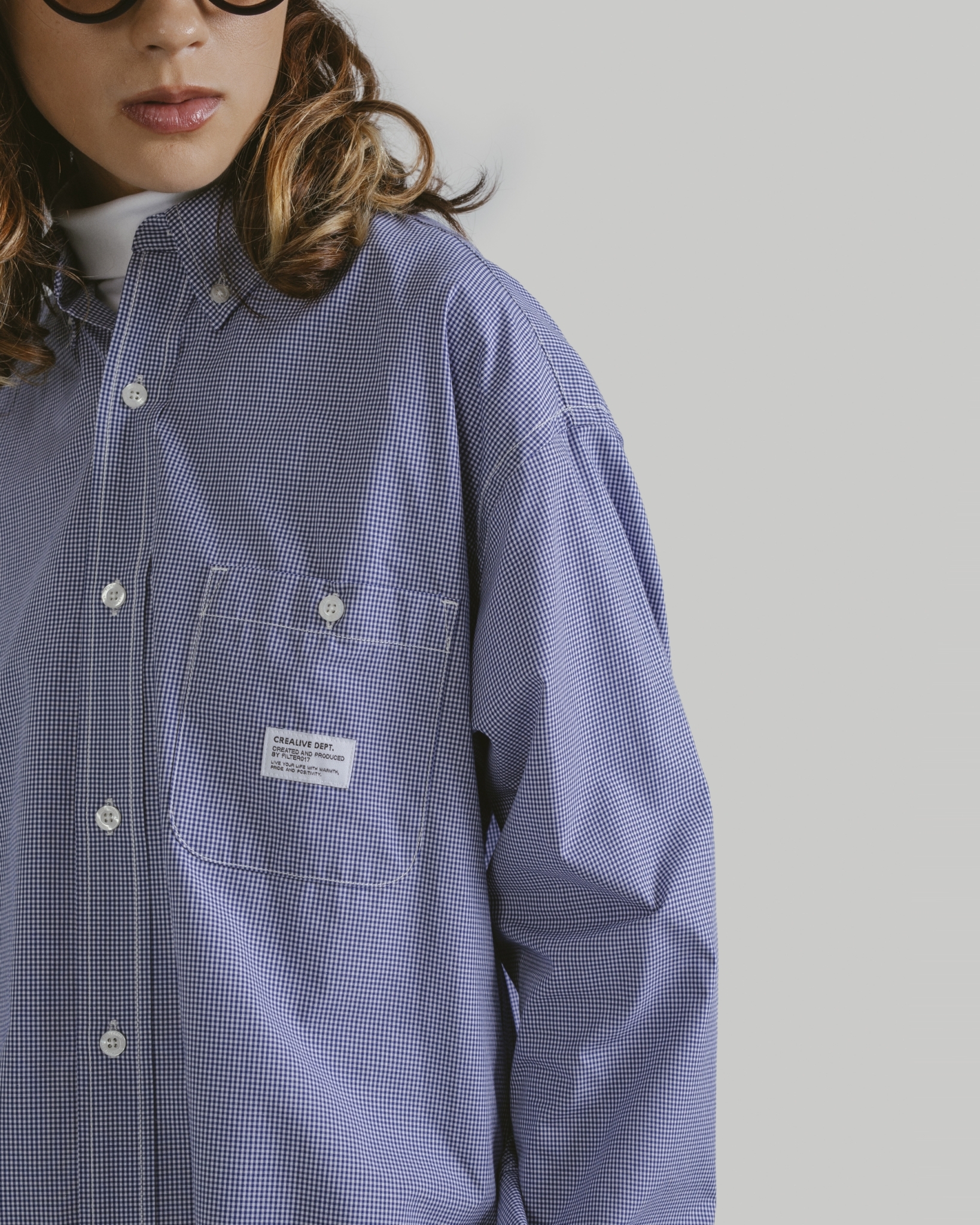 "Gingham"此種格紋源起於17世紀,以兩色線紗經由經、緯交織後呈現中間色調,為規律的三色格紋排列。此款襯衫以寬版輪廓版型為基礎,前短後長的下擺於兩側開衩以三角裁片加固,加上左右肩胛處以活折剪裁,增添行動時的延展空間使之更加舒適,並特選質感極佳的混紡面料與訂製鈕扣製作,為日常穿搭輕鬆營造豐富層次感。