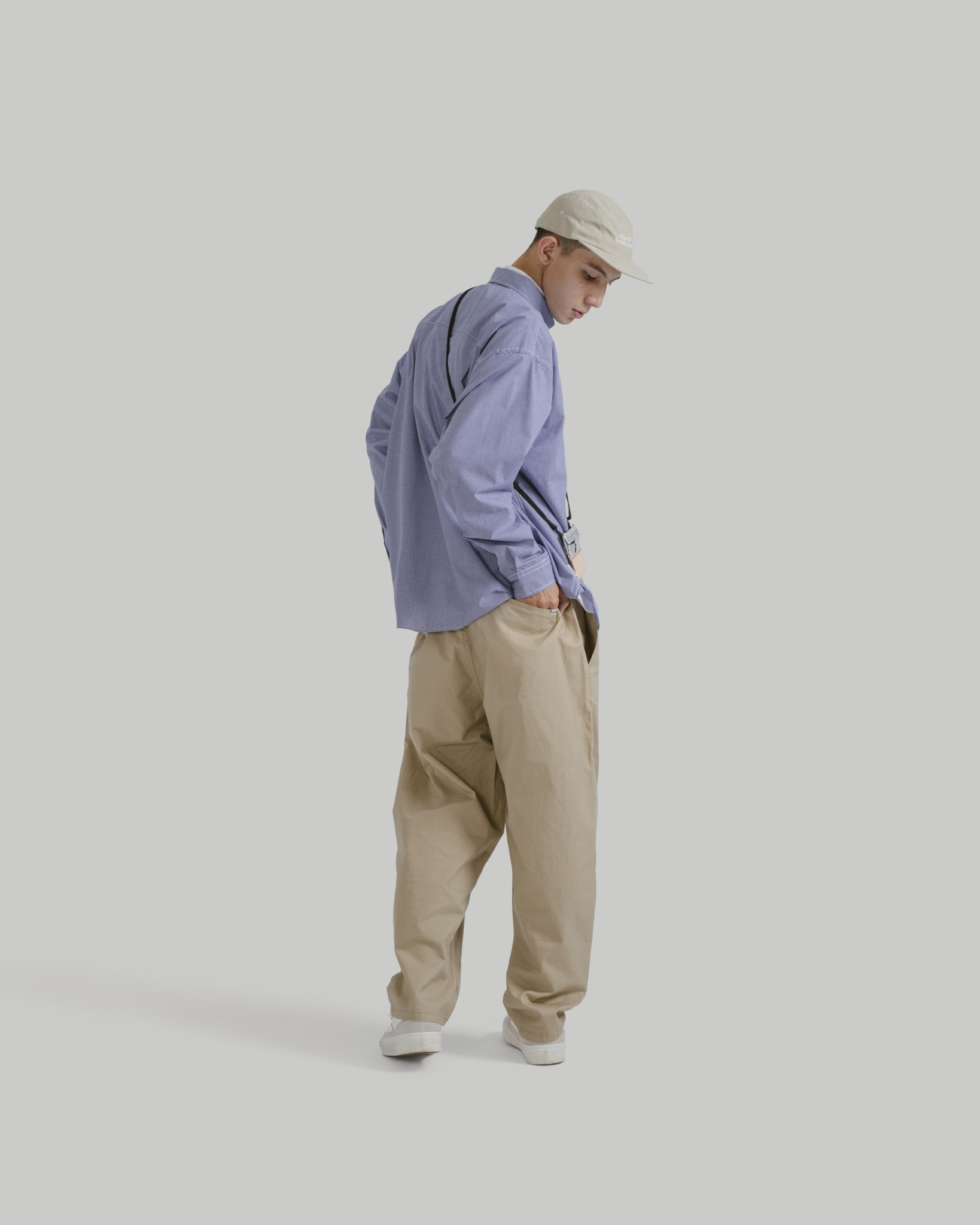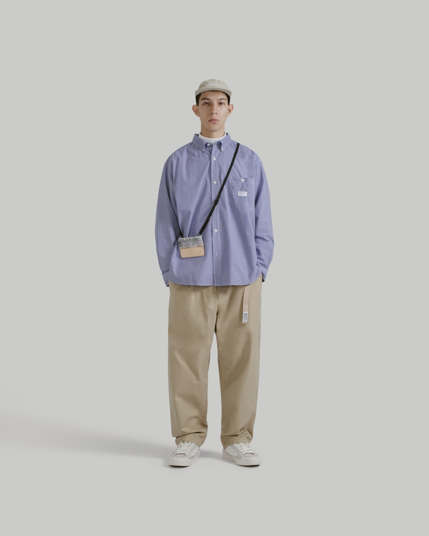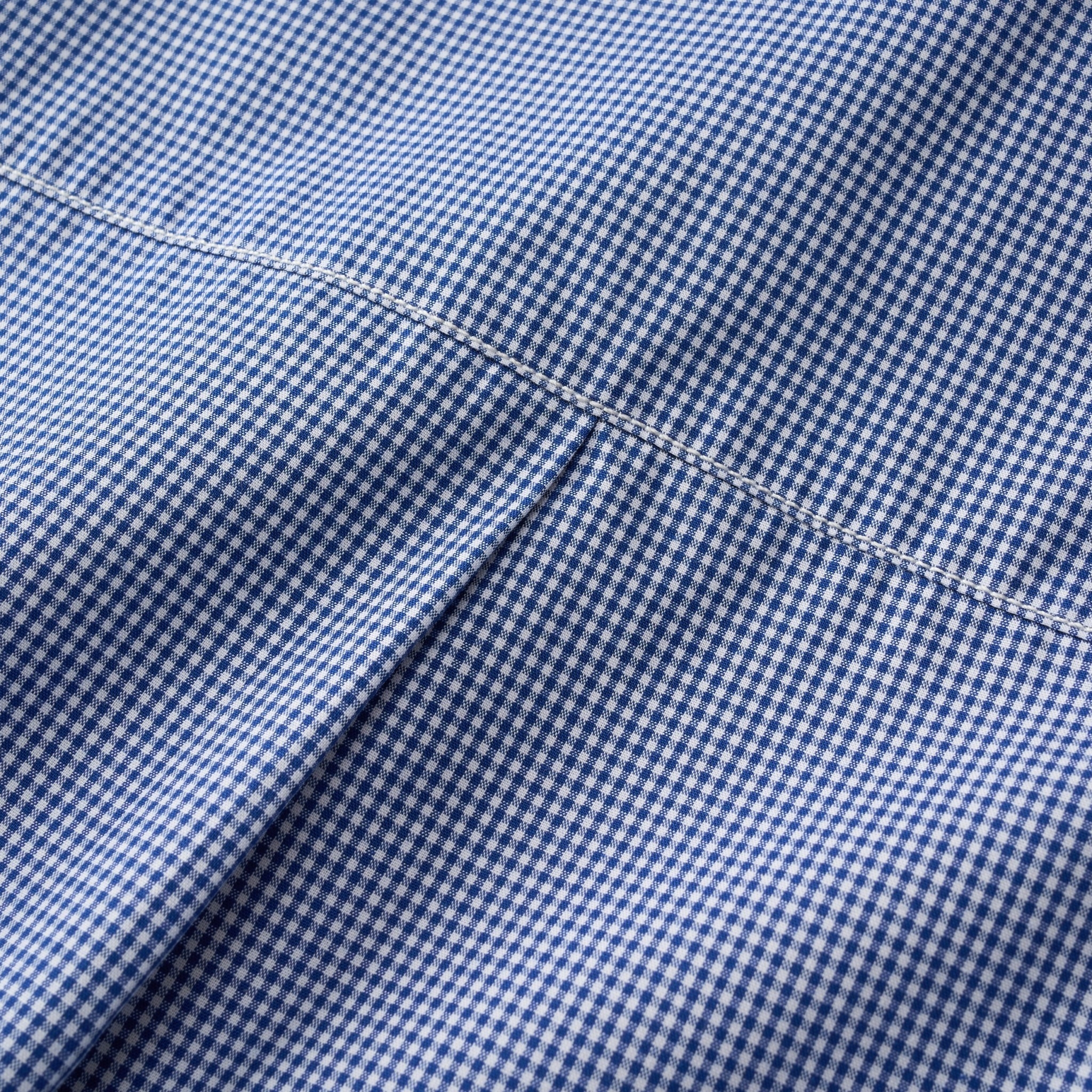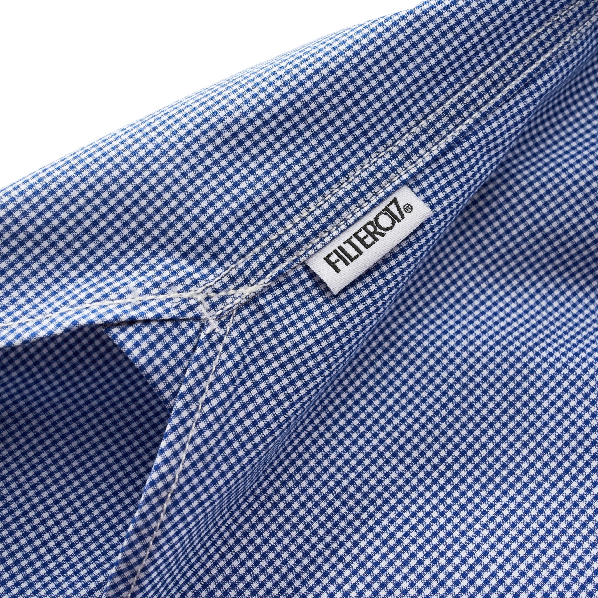 "Gingham"此種格紋源起於17世紀,以兩色線紗經由經、緯交織後呈現中間色調,為規律的三色格紋排列。此款襯衫以寬版輪廓版型為基礎,前短後長的下擺於兩側開衩以三角裁片加固,加上左右肩胛處以活折剪裁,增添行動時的延展空間使之更加舒適,並特選質感極佳的混紡面料與訂製鈕扣製作,為日常穿搭輕鬆營造豐富層次感。