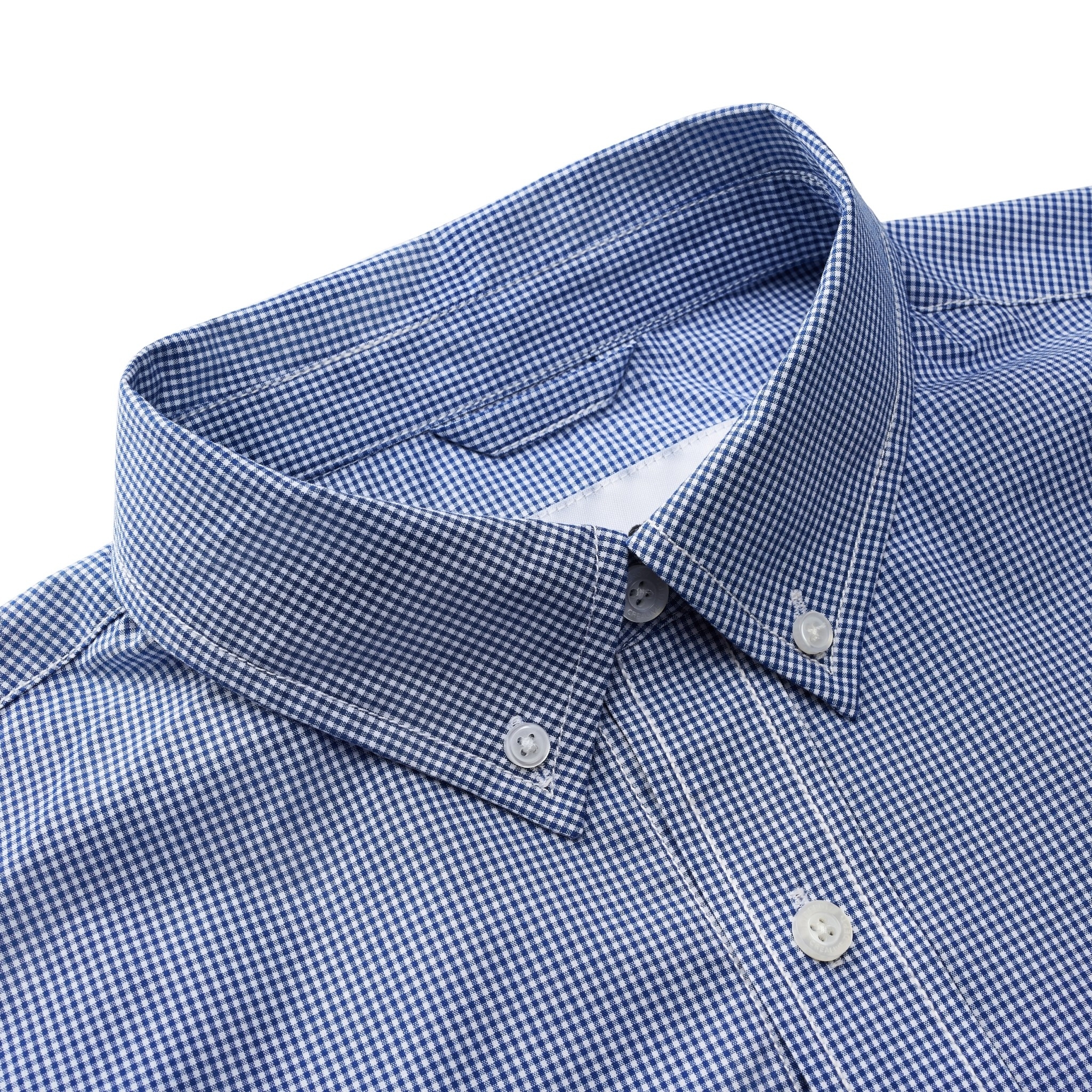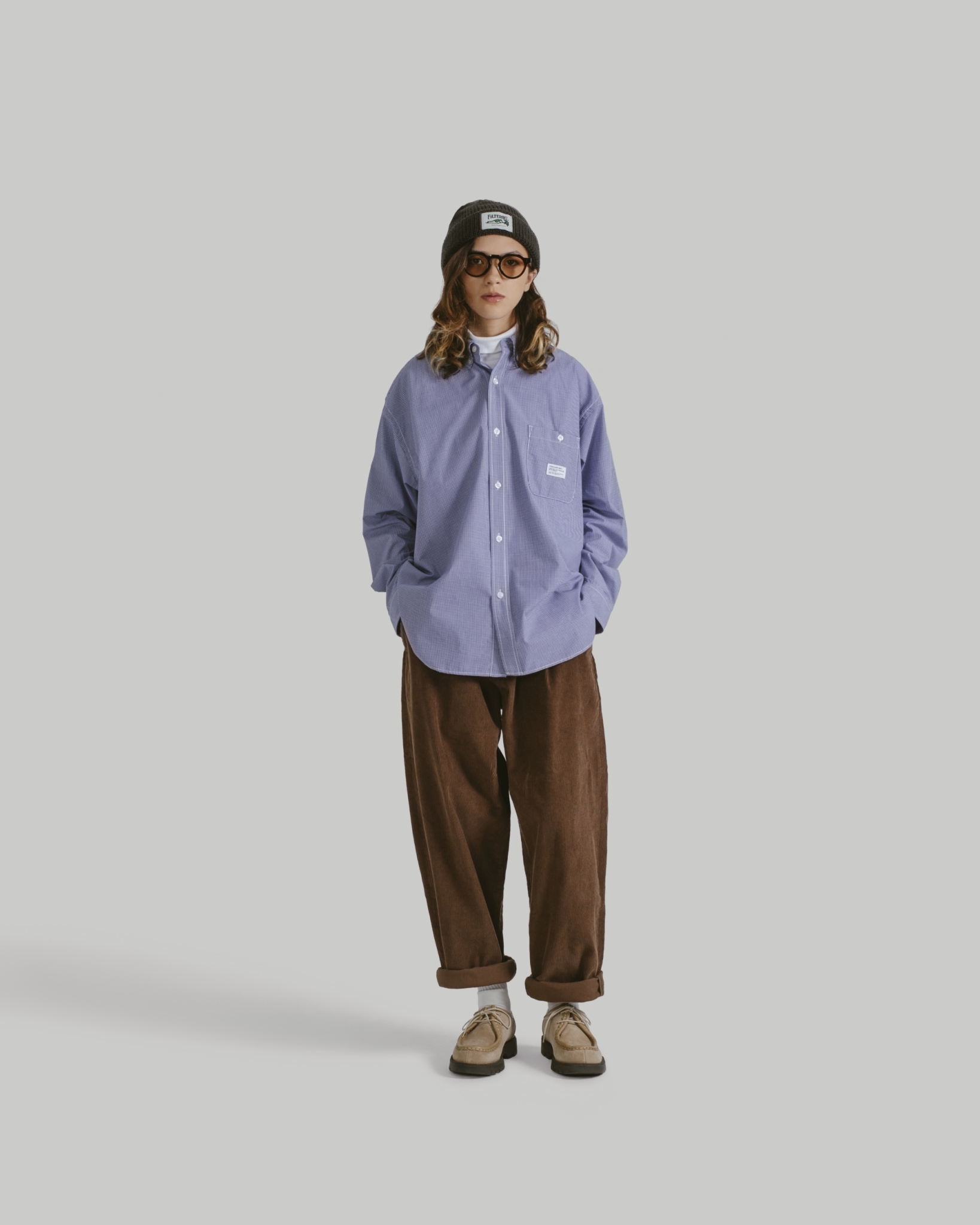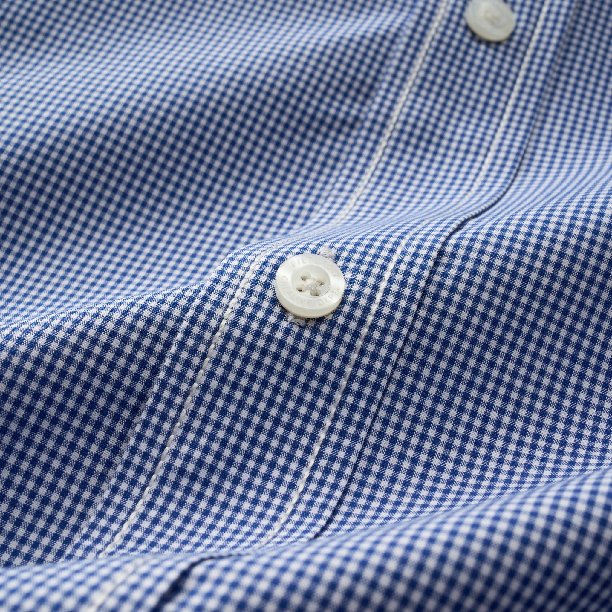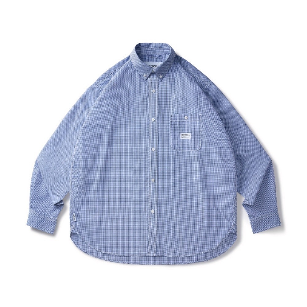 "Gingham"此種格紋源起於17世紀,以兩色線紗經由經、緯交織後呈現中間色調,為規律的三色格紋排列。此款襯衫以寬版輪廓版型為基礎,前短後長的下擺於兩側開衩以三角裁片加固,加上左右肩胛處以活折剪裁,增添行動時的延展空間使之更加舒適,並特選質感極佳的混紡面料與訂製鈕扣製作,為日常穿搭輕鬆營造豐富層次感。