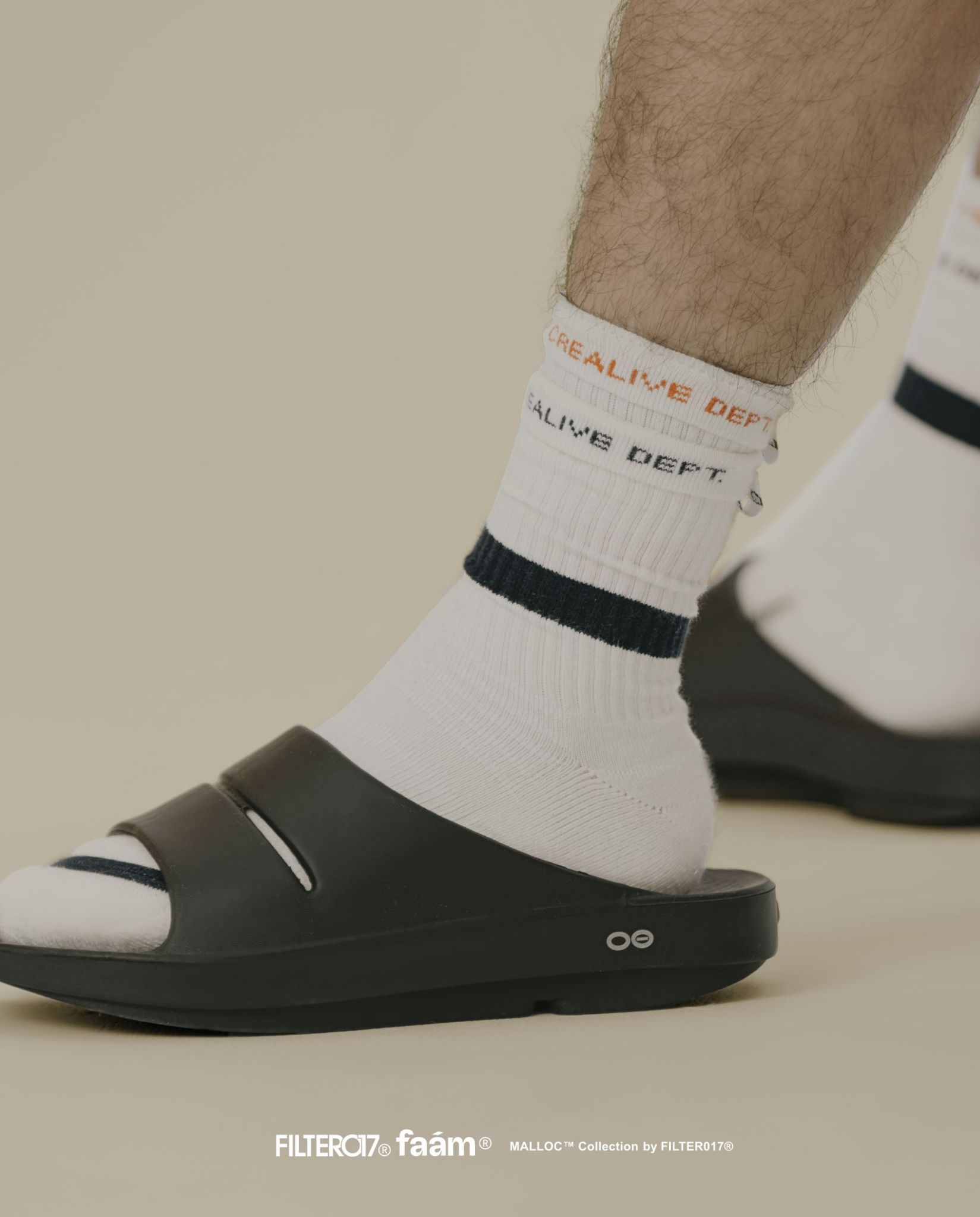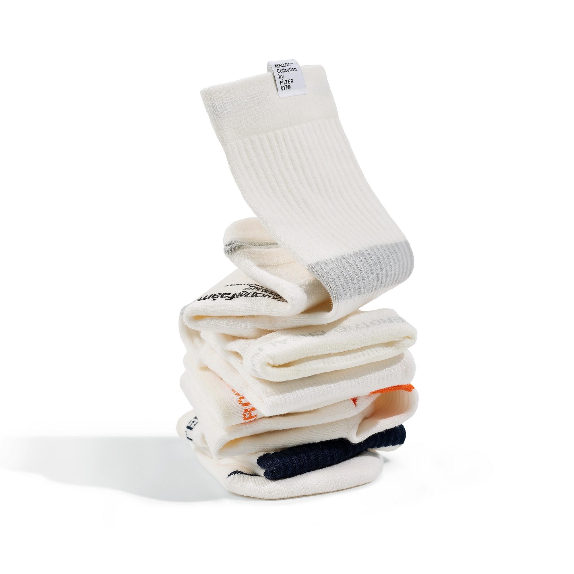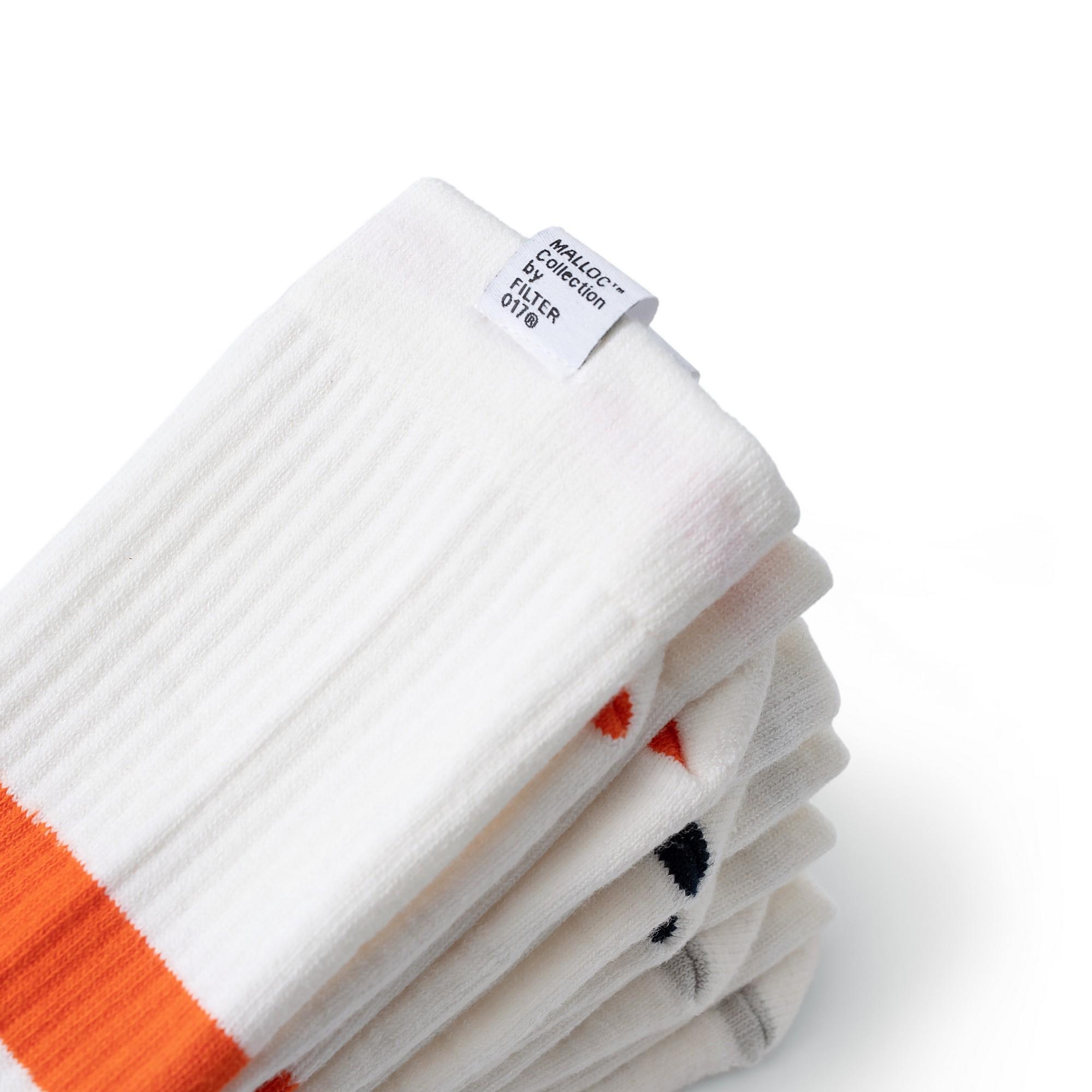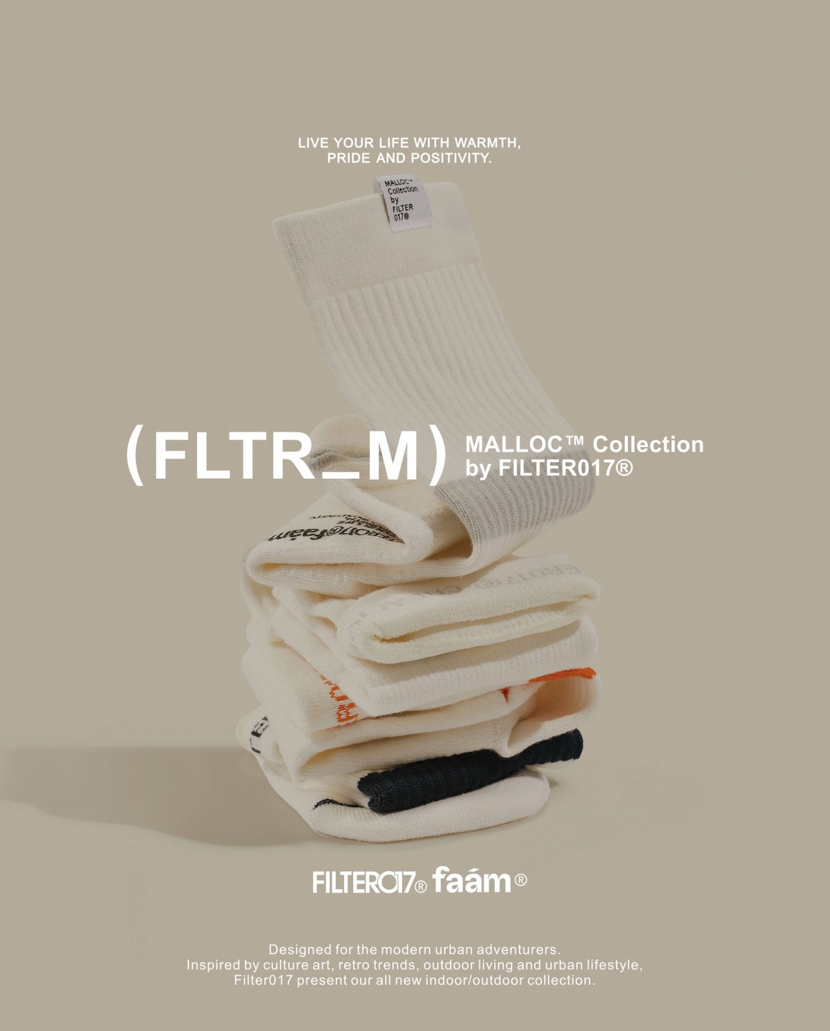 本次復刻新作用選用象牙白作為襪身本體,以MALLOC™ 織標及襪底印刷詮釋聯名細節,襪管內側提花FILTER017® 品牌字樣,著用時可反摺增加外觀搭配上的視覺靈活性。