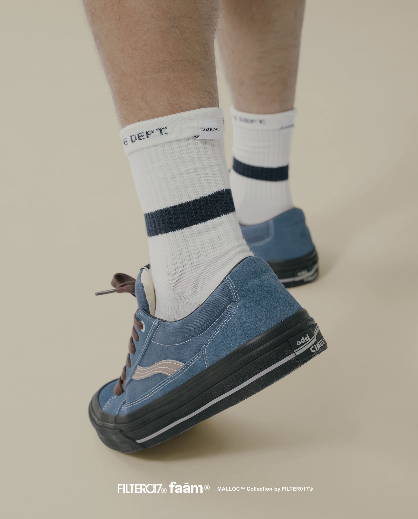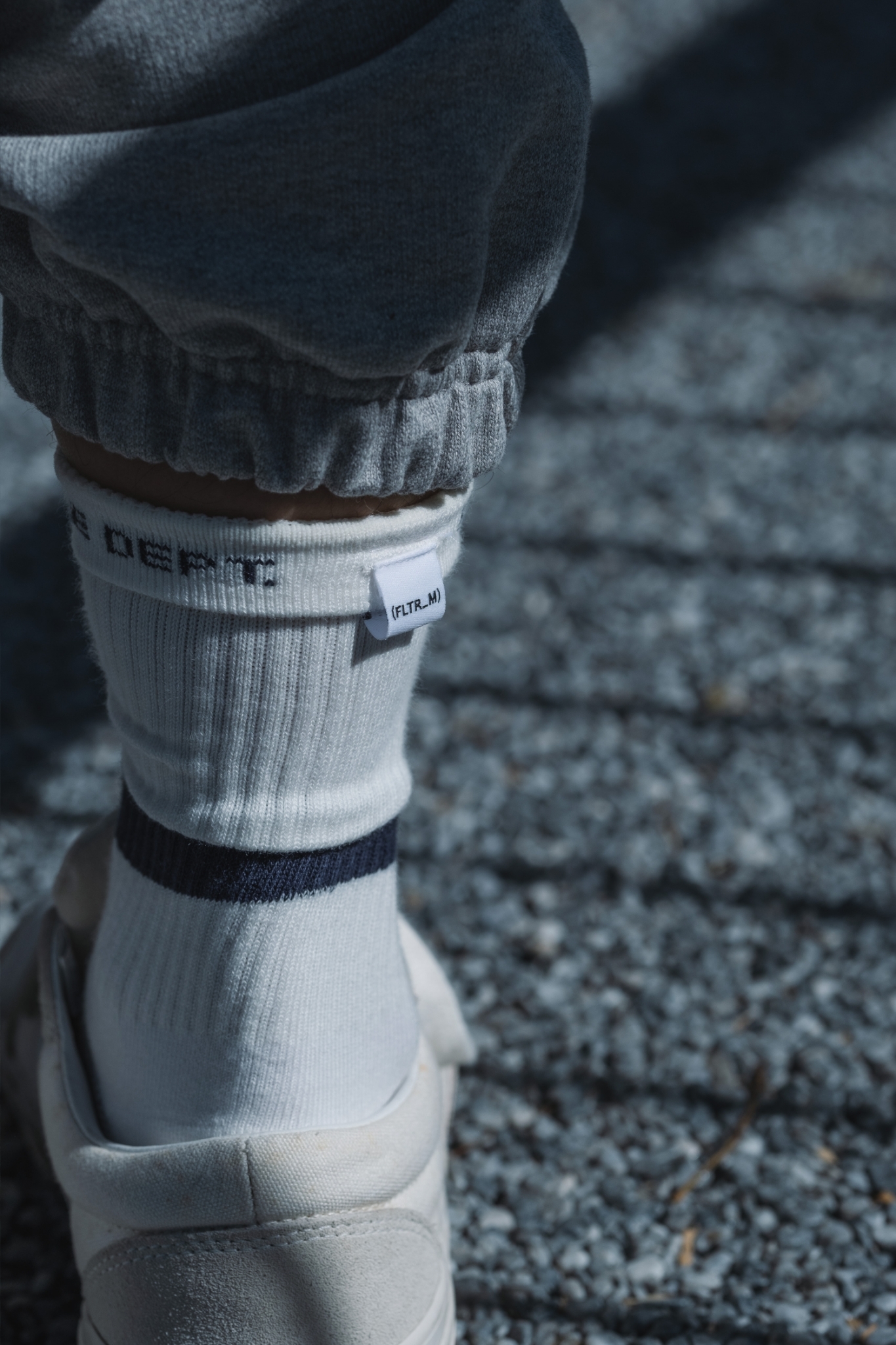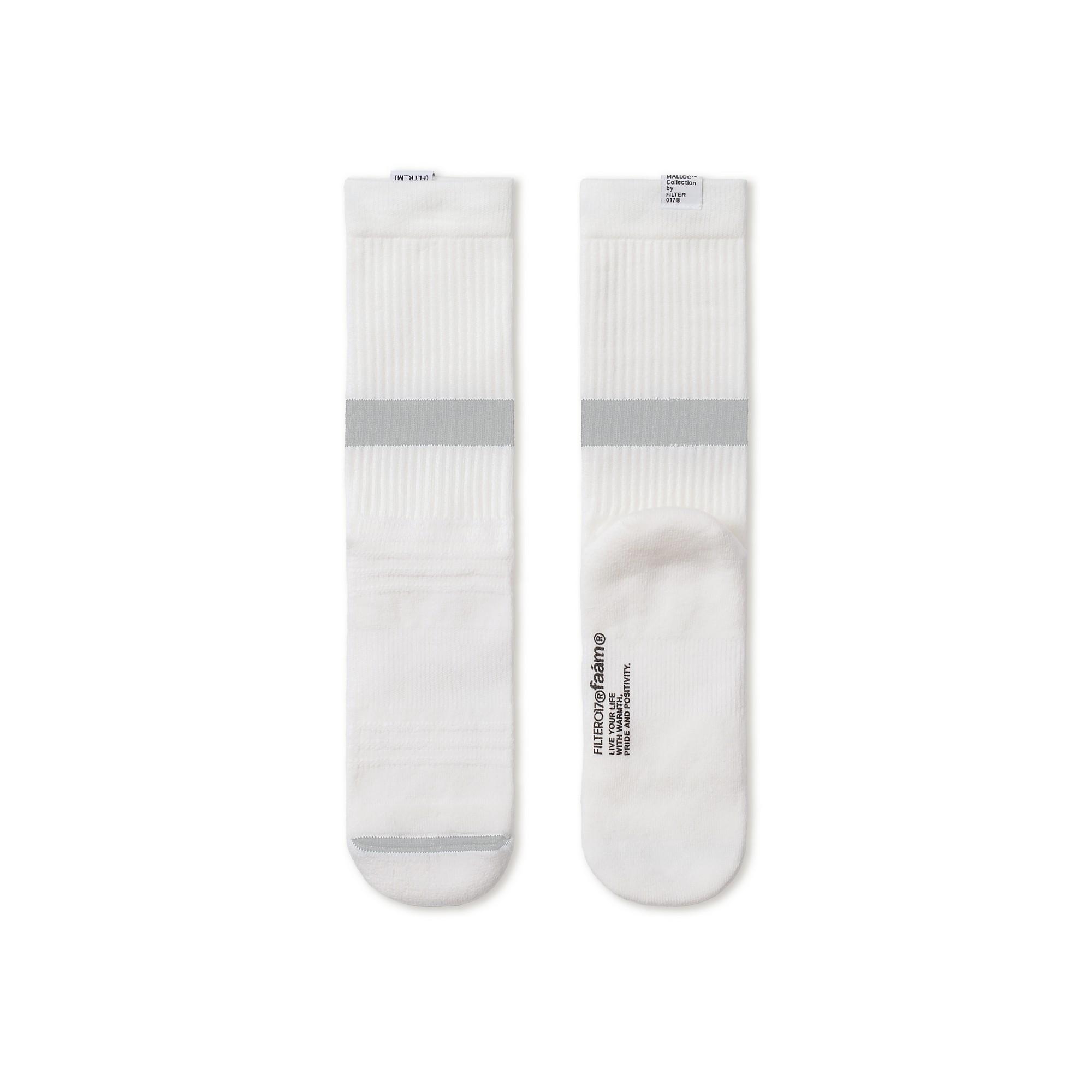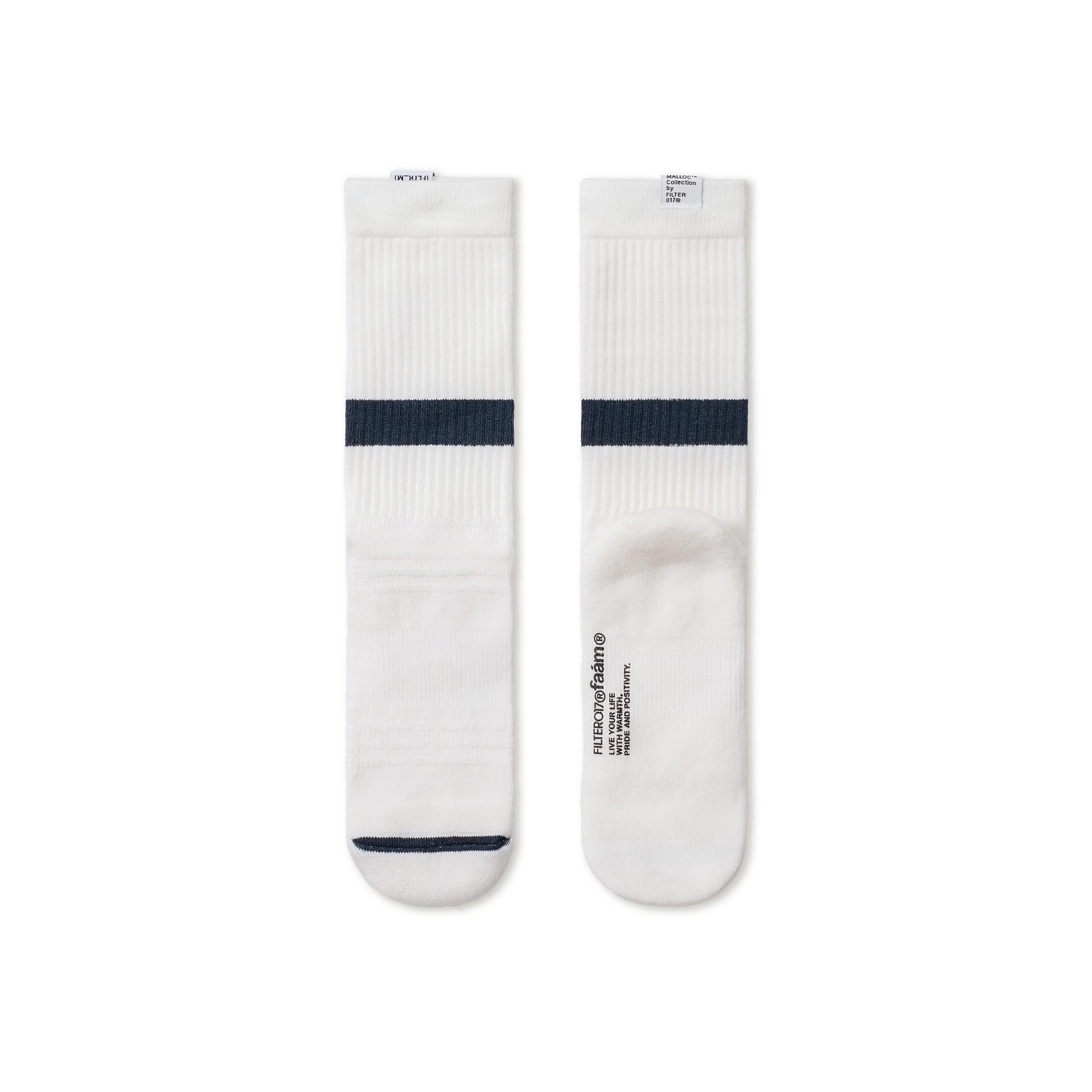 本次復刻新作用選用象牙白作為襪身本體,以MALLOC™ 織標及襪底印刷詮釋聯名細節,襪管內側提花FILTER017® 品牌字樣,著用時可反摺增加外觀搭配上的視覺靈活性。