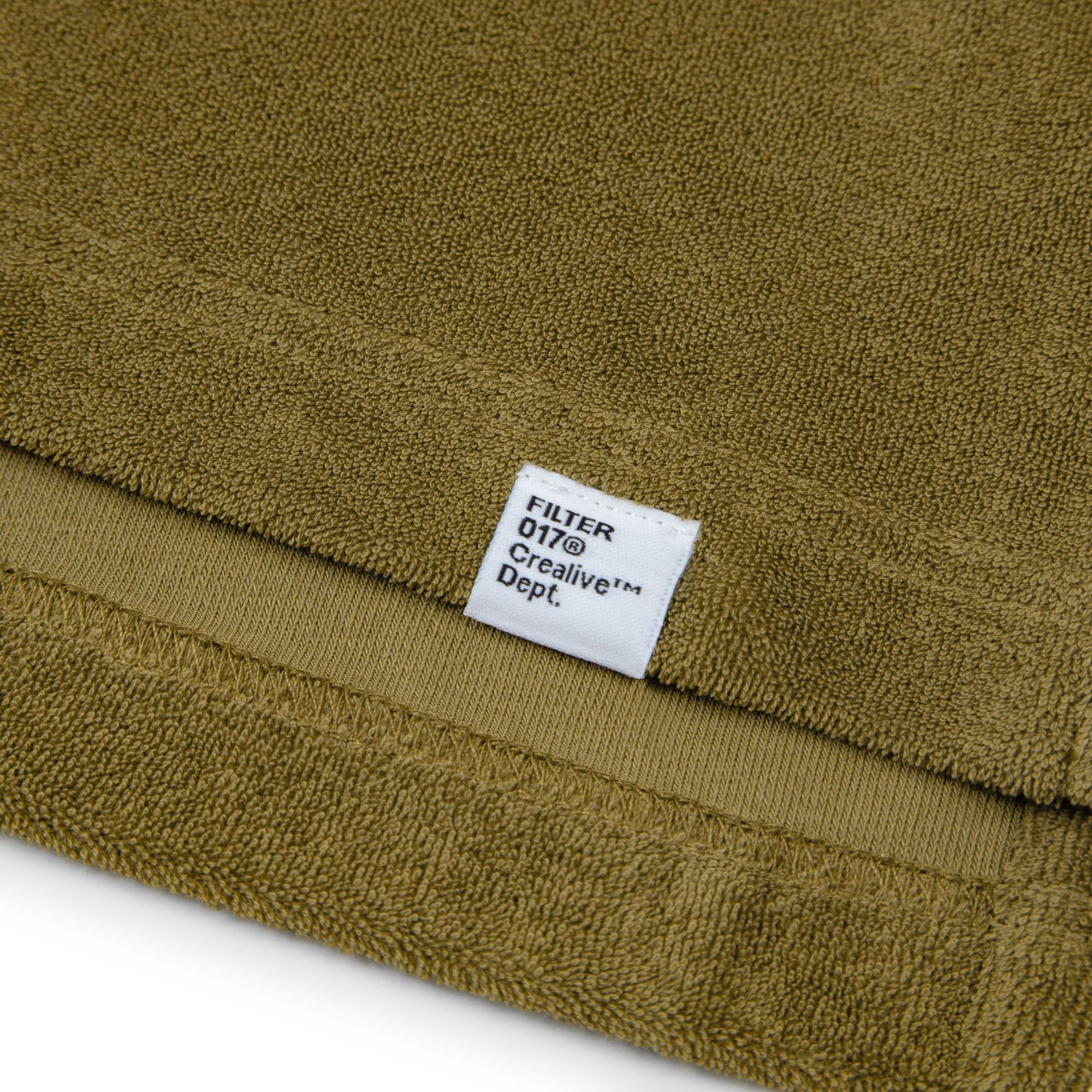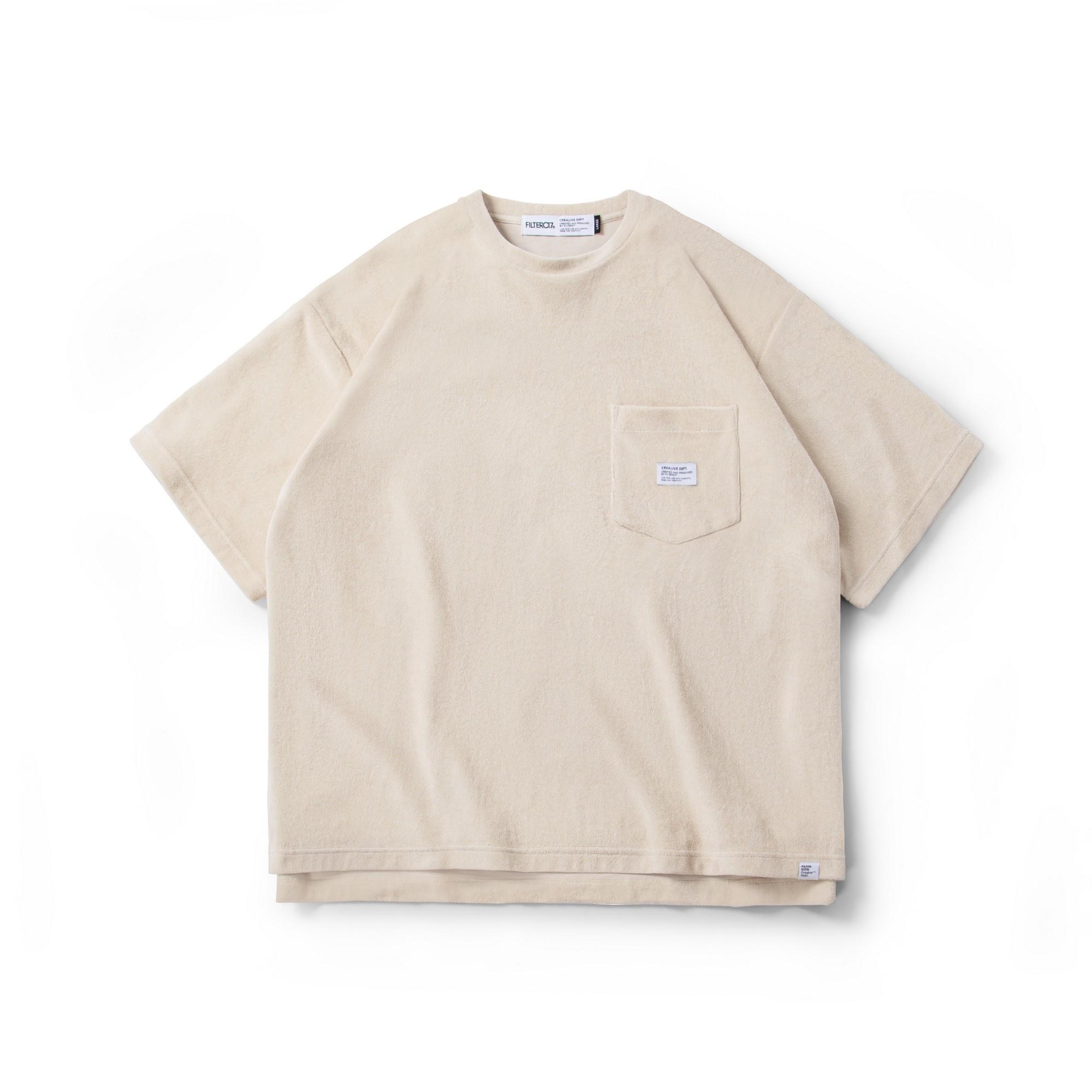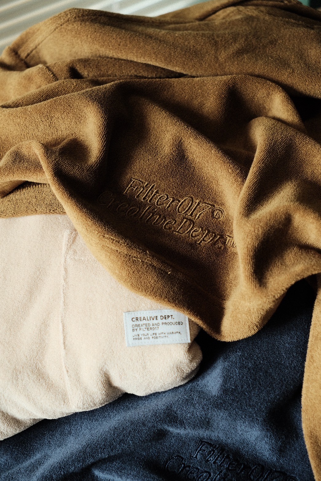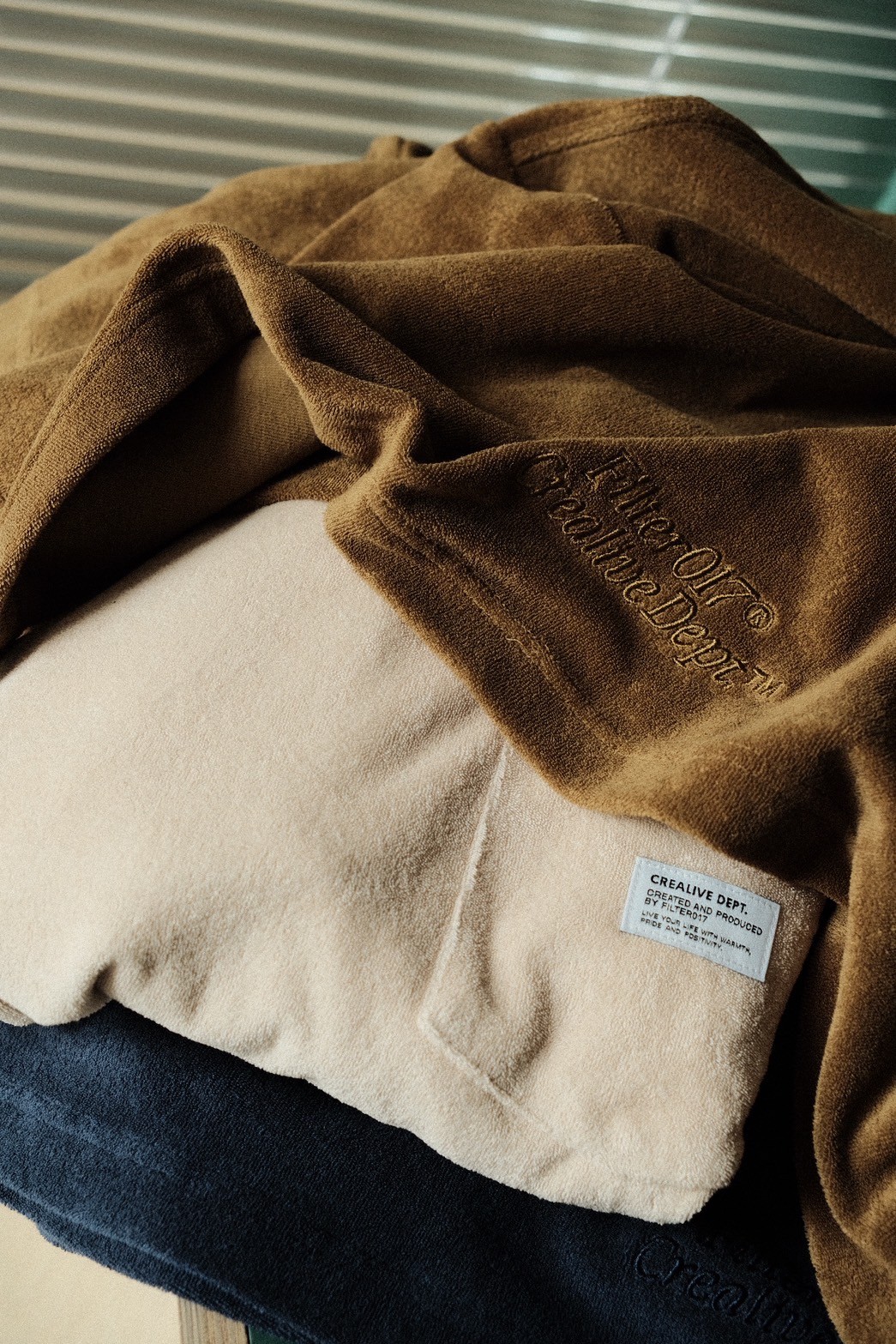 材質選用純棉毛巾布料製作,布料表面由細毛圈狀的組織構成,具有親膚、透氣、抗皺等特性,符合亞洲氣候需求,柔軟質地更是讓視覺上帶有自然垂墜感的鬆弛氛圍,無論在日常休閒或戶外皆能帶來絕佳的穿著體驗。