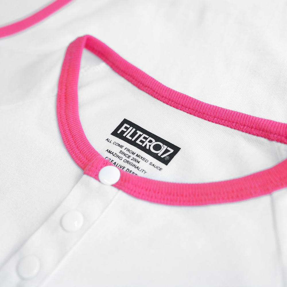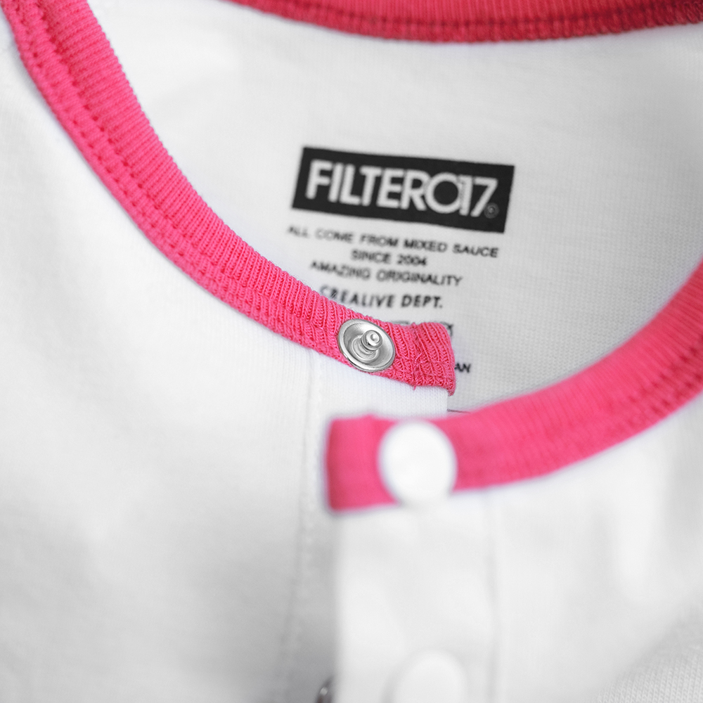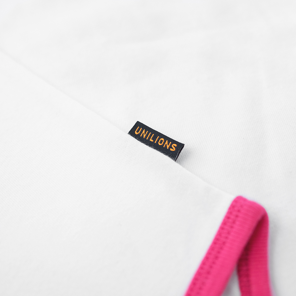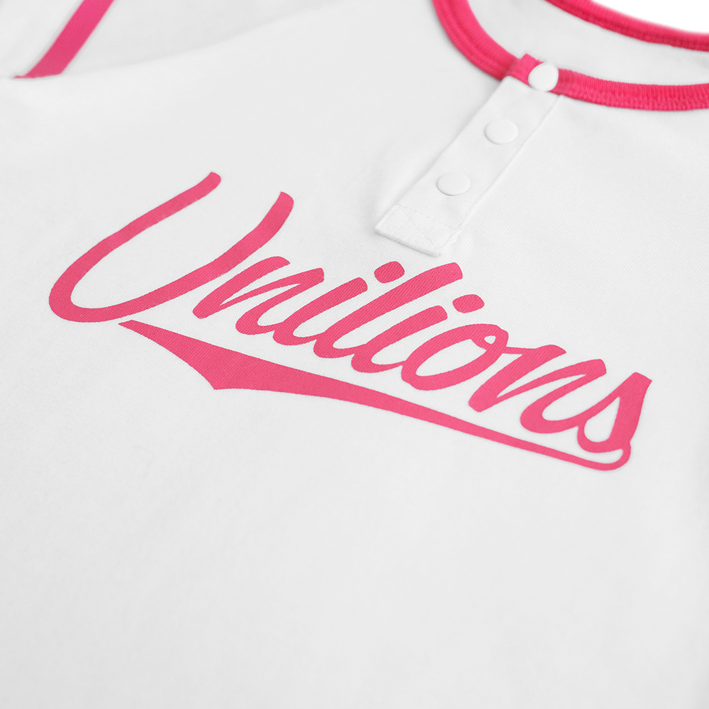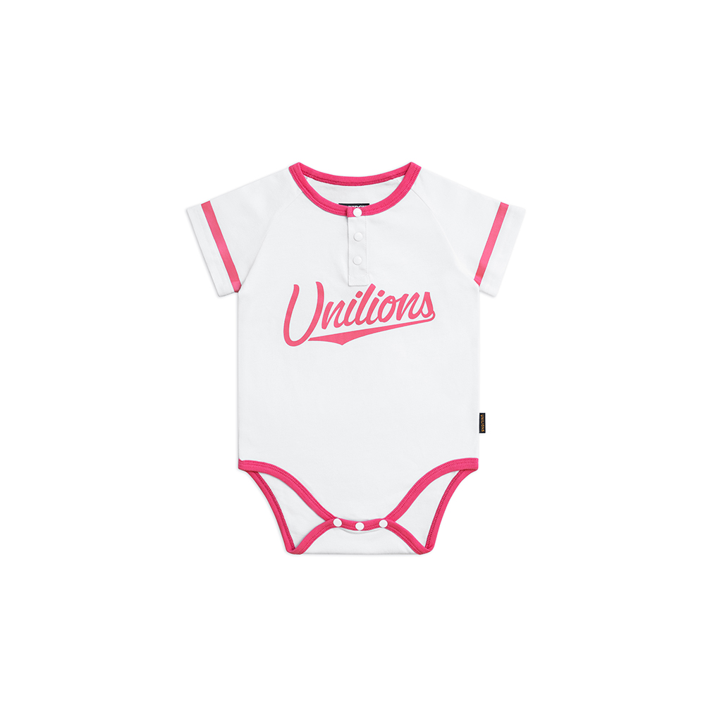 本款嬰兒包屁衣設計以女孩球衣延伸,配色以純白與粉紅作搭配,