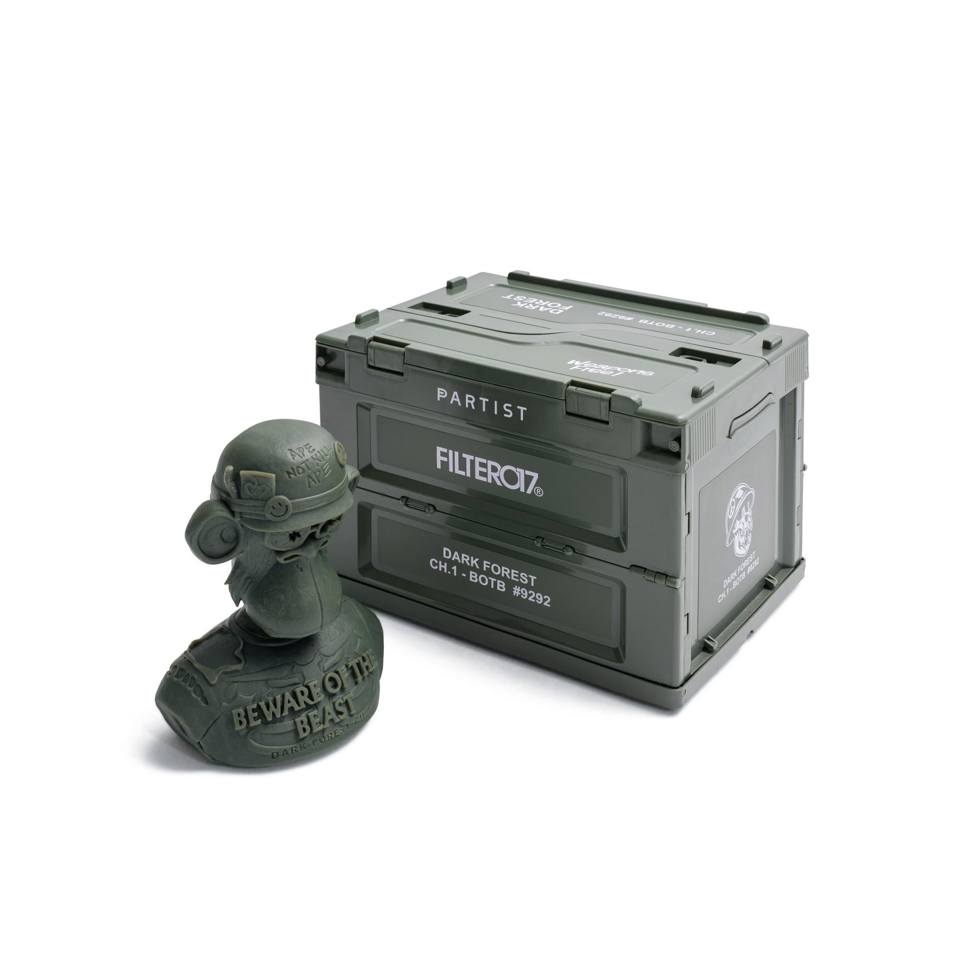 本軍箱精裝限定版附加以FILTER017® 品牌28L戰術收納箱裝載包裝無聊猿搪膠戰爭胸像本體。胸像本體高約11英吋,巨大厚實的分量質感,適合作為空間擺件,特別委託台灣知名設計師玩具單位IN TOY ( @intoyinc2020 ) 技術協力,以藝術收藏為製作標準的限量誠意之作,為本系列最具代表性單品。