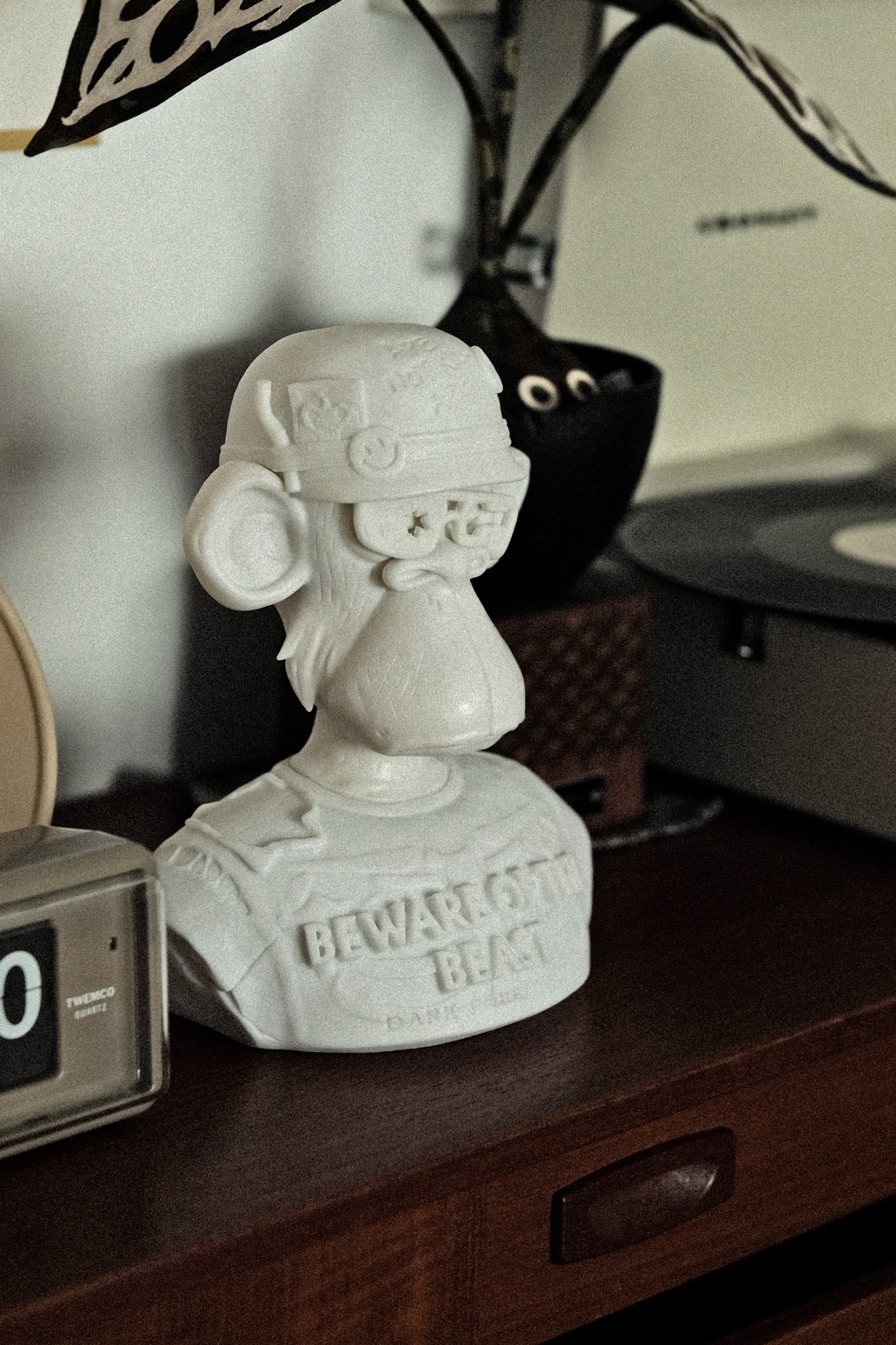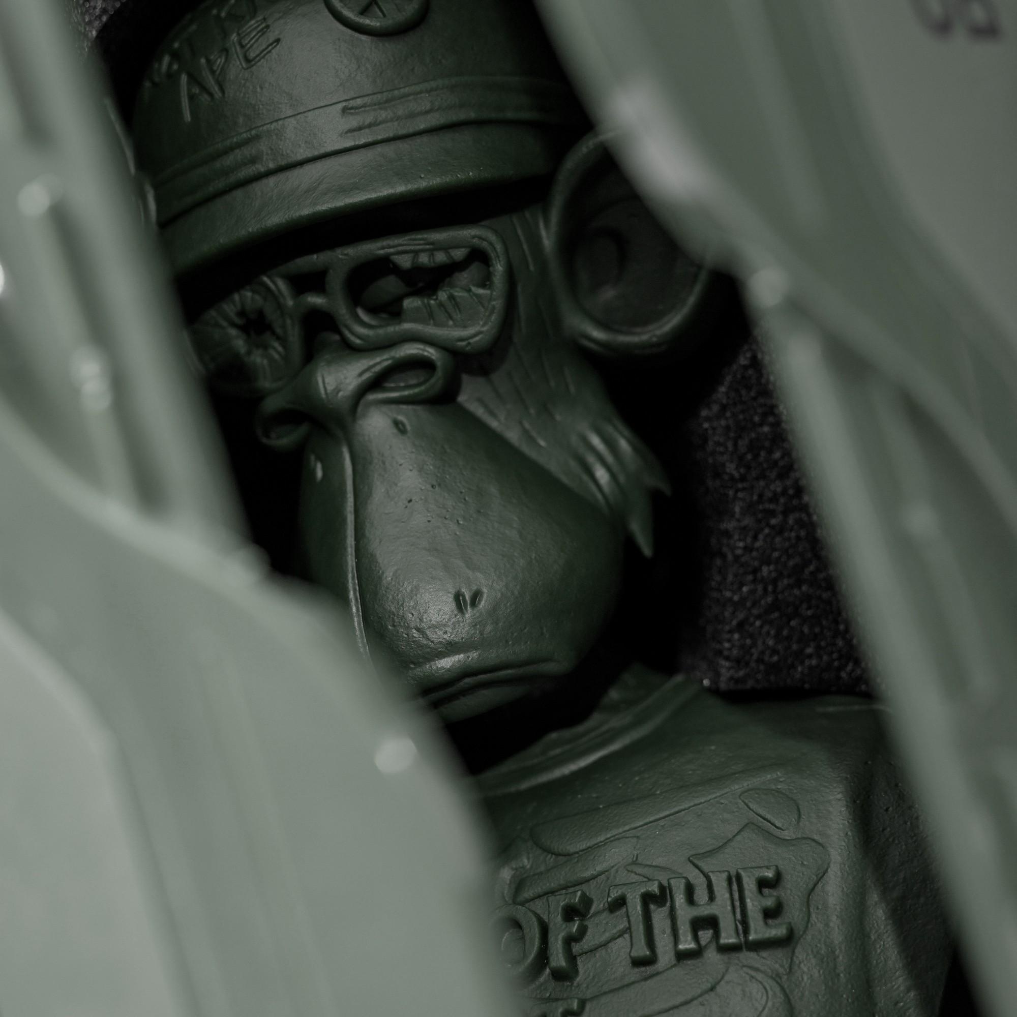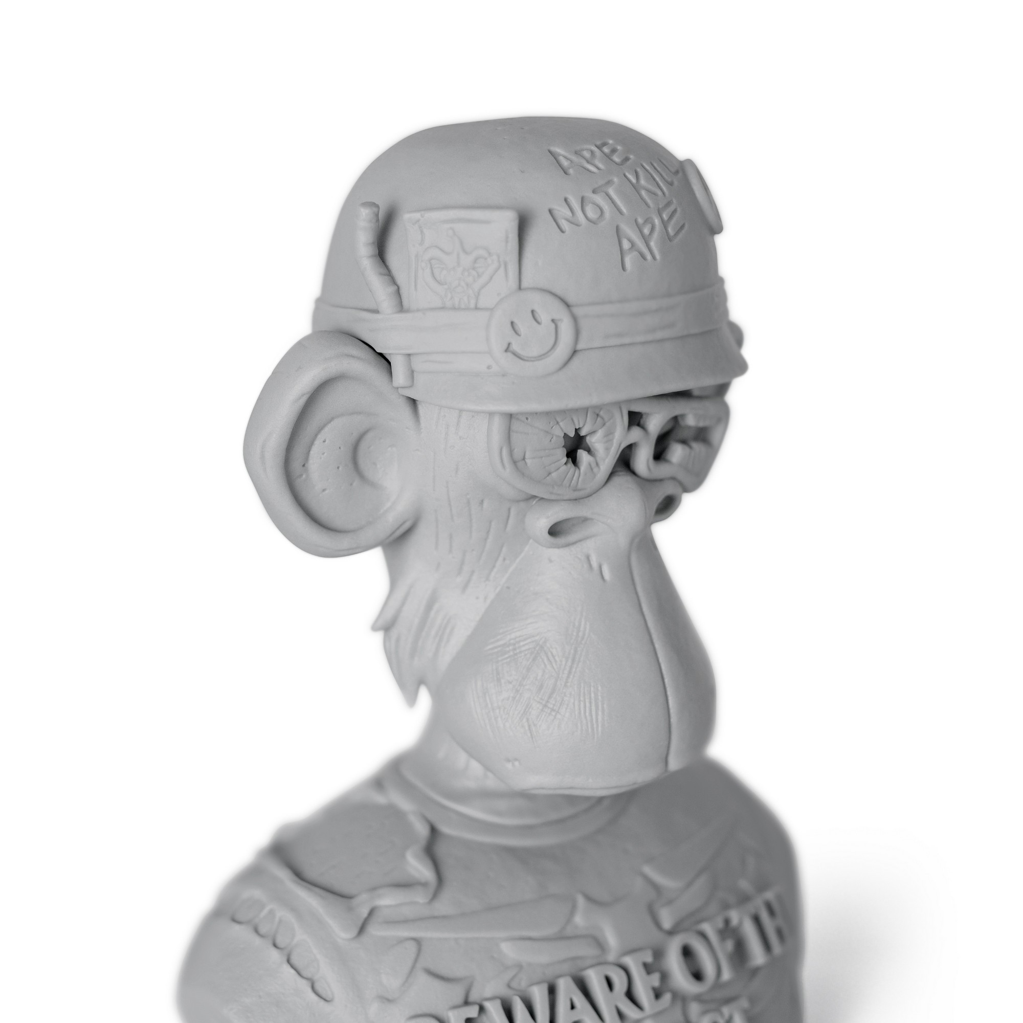 完美3D立體化還原呈現主題角色之無聊猿造型,考究經典戰爭紀念胸像形式,以PVC搪膠模擬混泥土灌漿雕塑材質,細膩仿真的碎石裂痕與氣孔,真實還原歷經戰事與歲月洗禮的斑駁痕跡,前後胸身刻劃硬朗俐落的英文字樣更加提點出本次主題核心與視覺重點。