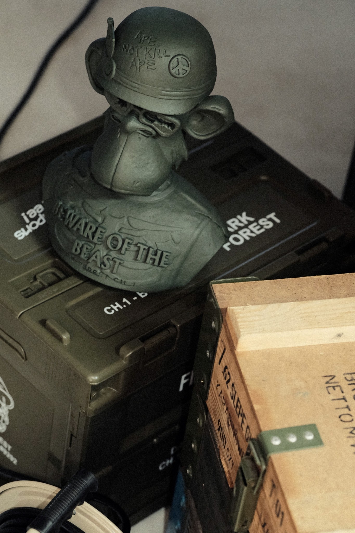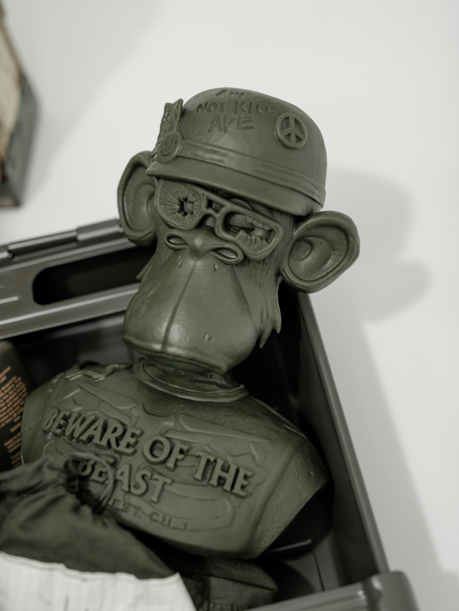 作品別具時代意義,其中巧妙致敬Rise of The Planet of The Apes 、Full Metal Jacket 等經典電影元素,藉由潮流、次文化流行符號與黑色幽默的手法包裝,詮釋反映當下這個煙硝四起的動盪世代與緊繃的世界局勢,同時也反諷與調侃對於Web3 與NFT 潮流大起大落的現象,