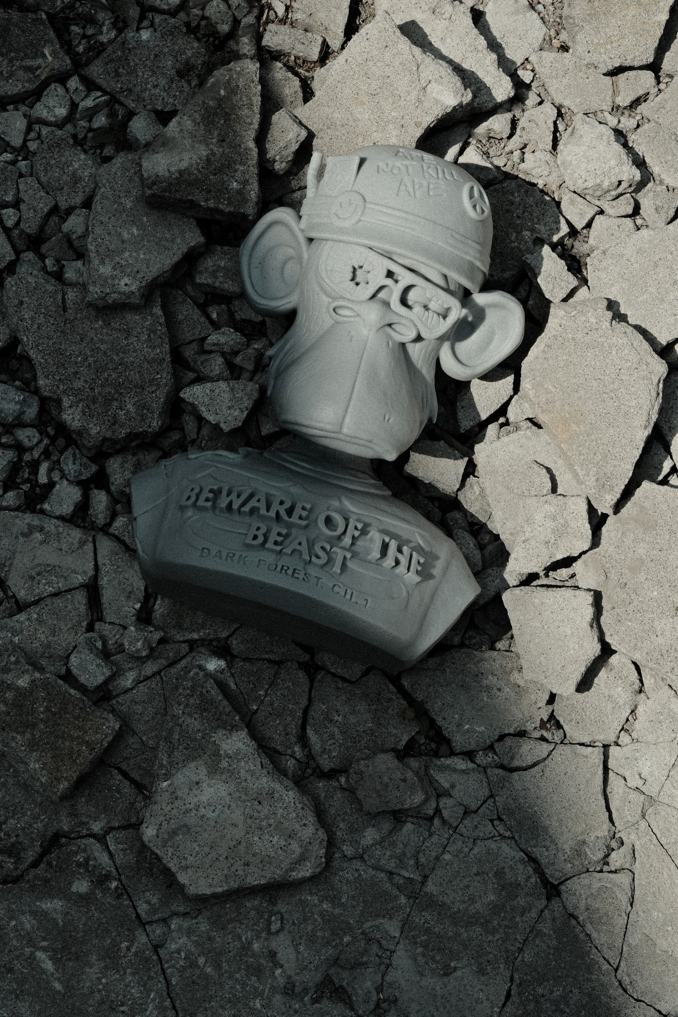 BAYC#9292 這隻「無聊猿」透過FILTER017® 擅長的元素混合語彙,保留原作特色為前提下進行重繪創作。以「黑暗森林法則」與反戰議題為核心靈感,重新演繹出這隻沒有武器(非主動侵略攻擊),暗喻正當防衛、小心掩護躲藏卻仍然受到攻擊而鼻青臉腫的無聊猿型態。