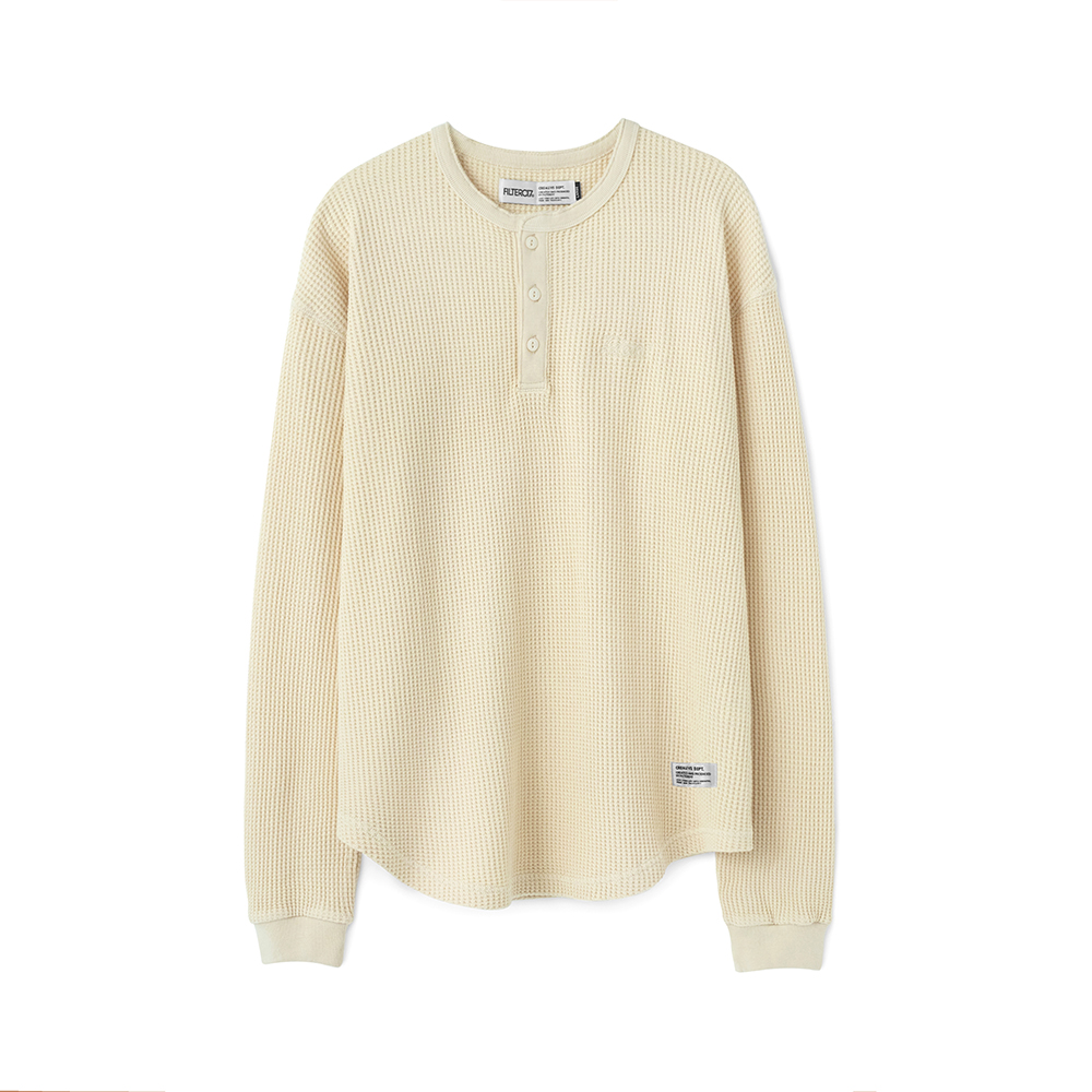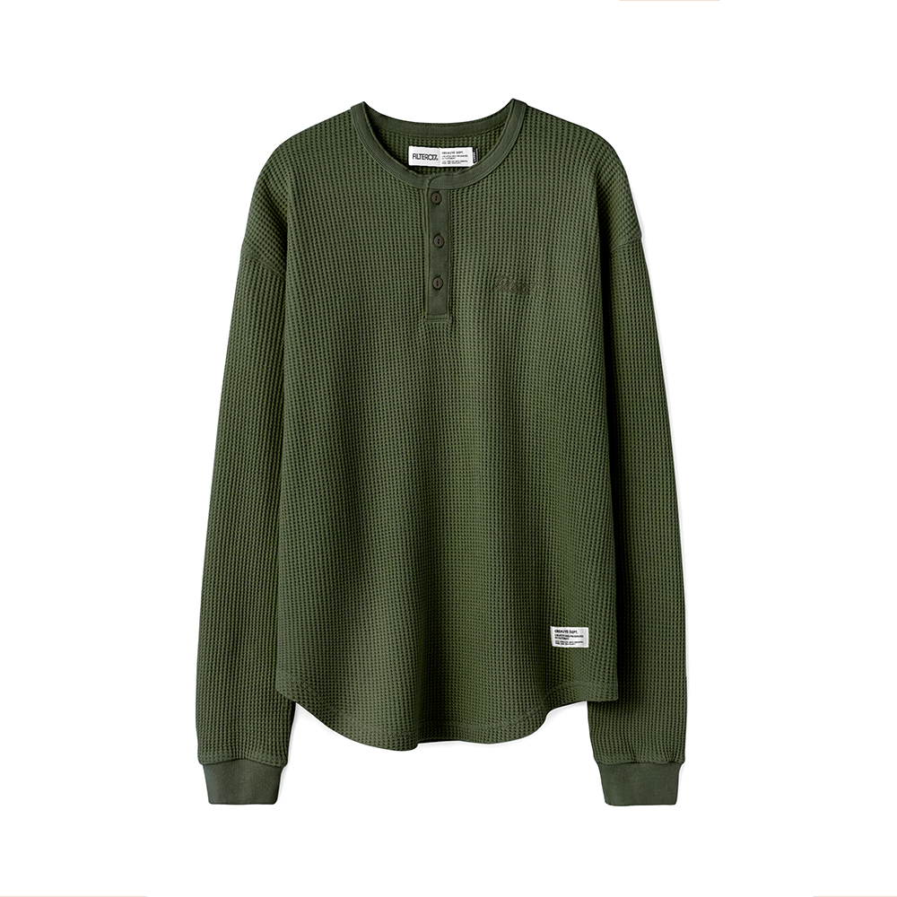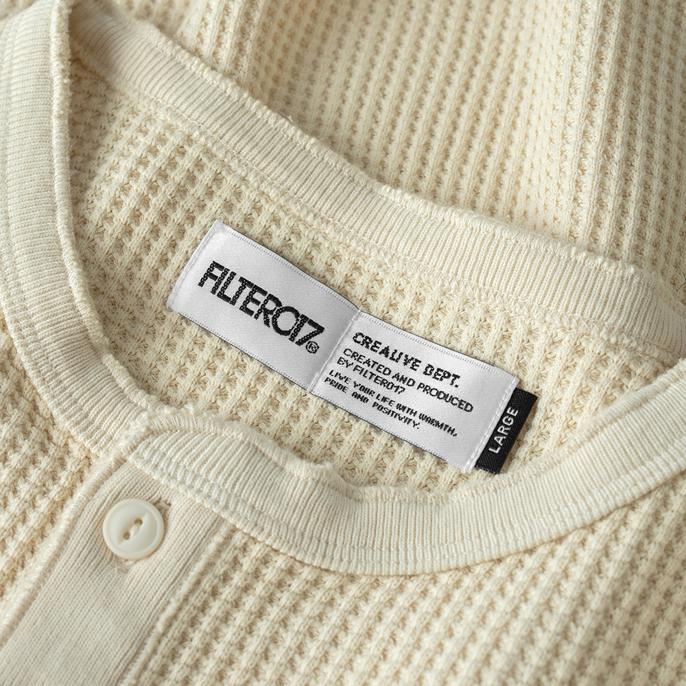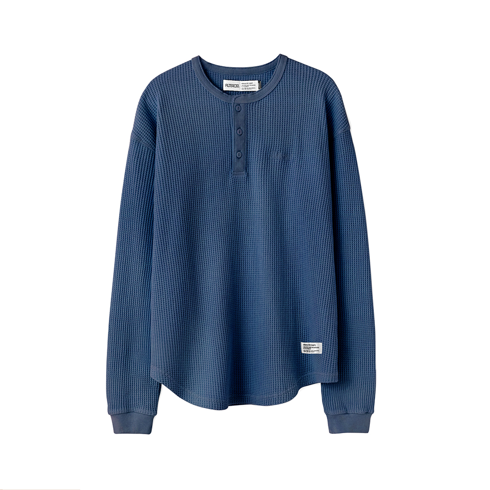 此次 Filter017® 精選優質華夫格面料,在相對基礎又具特殊性的素面材質上,搭配以復古經典的亨利領做為視覺提點,呈現俐落簡單且容易搭配的必備基本單品,稍稍偏長的衣長剪裁無論作為秋冬內搭層次或是單穿、外罩造型都十分適合