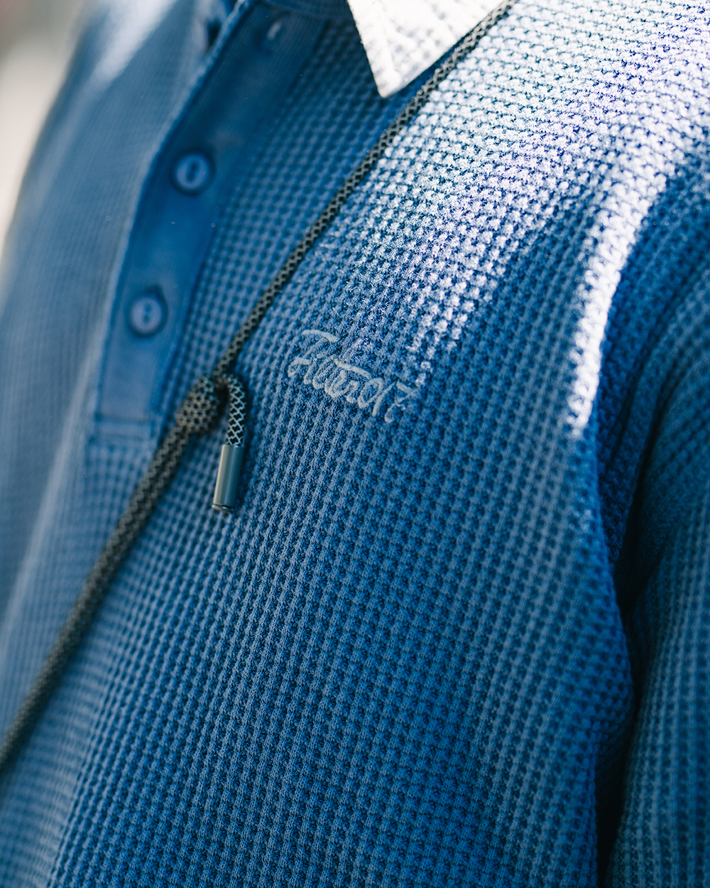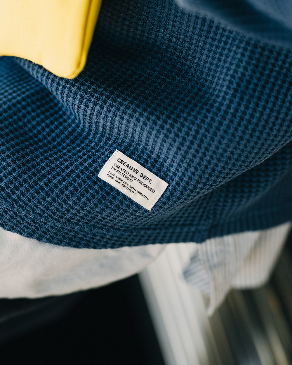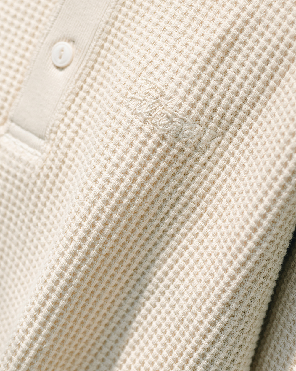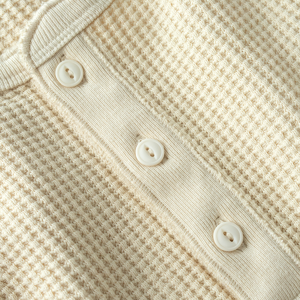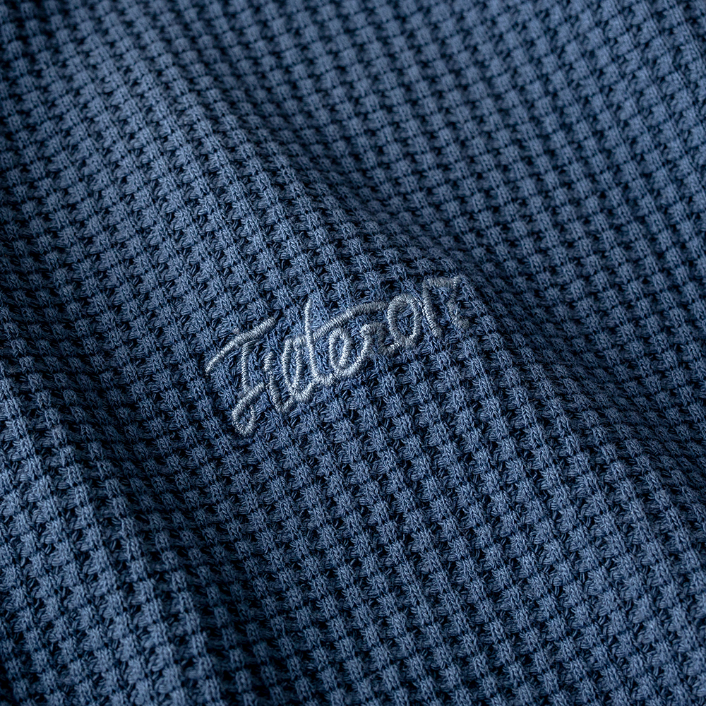 純棉製成的華夫格面料,最初的起源來自於比利時一種名叫華夫餅的點心,透由特別的傳統織法加工製作,使其呈現獨特的格紋質感,除了藉此織法使織物更加透氣、速乾,並同時保有親膚舒適又增具保暖效果的特性。
