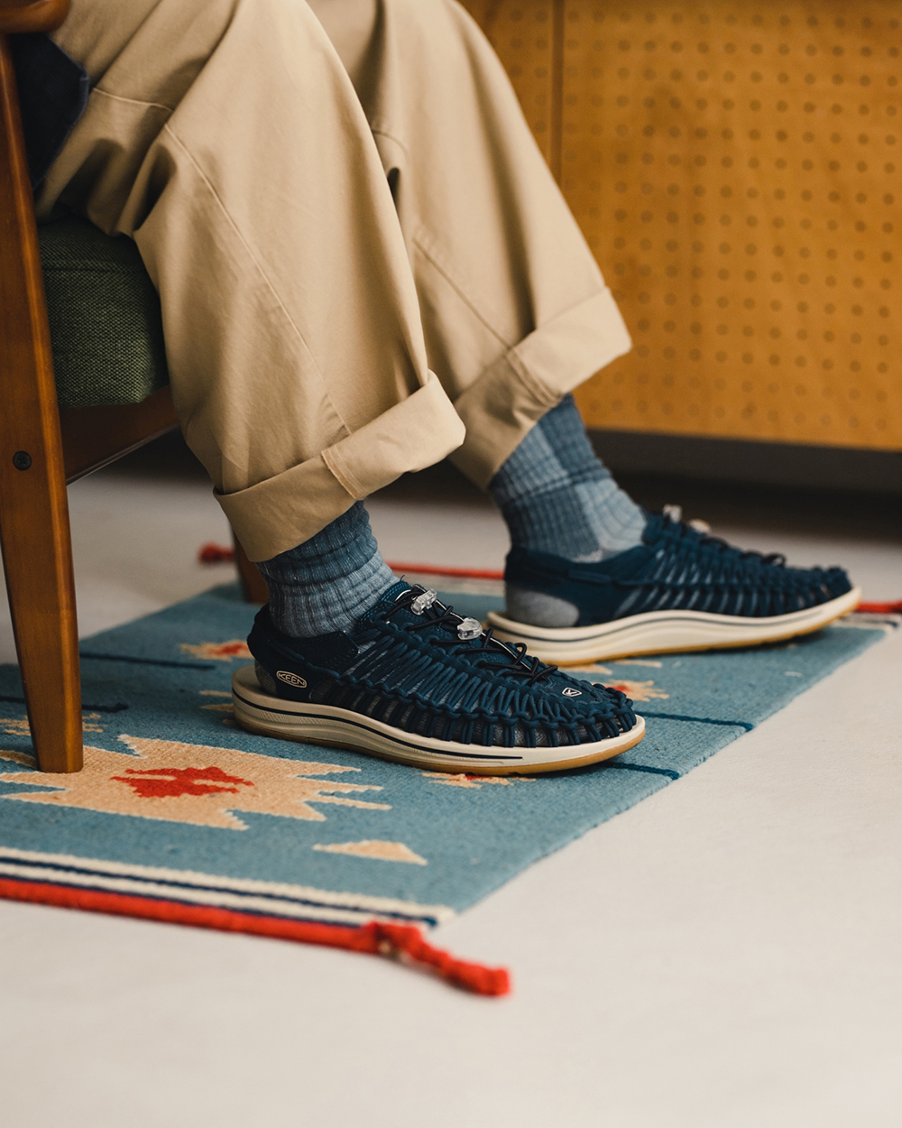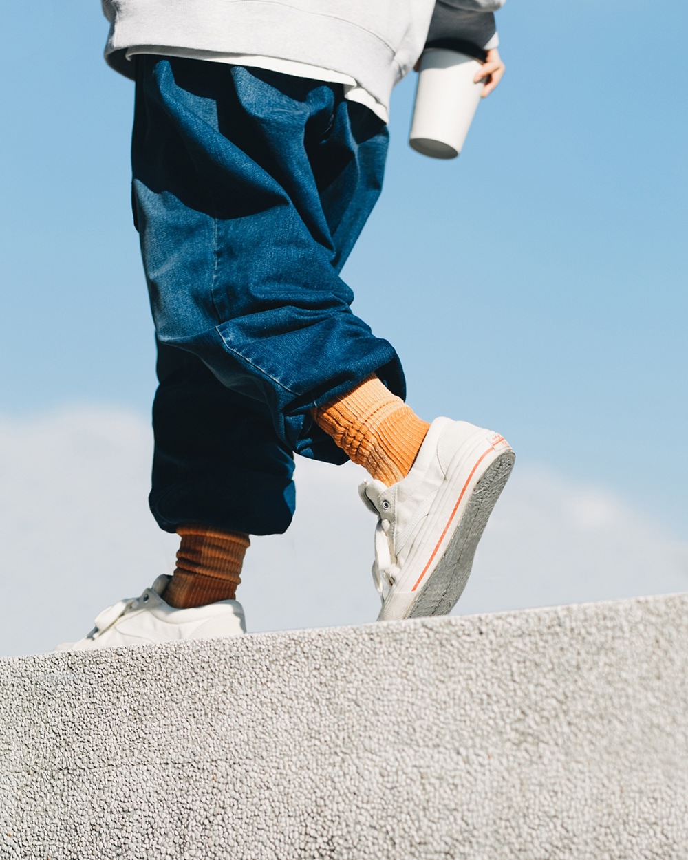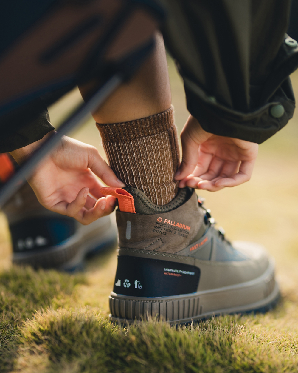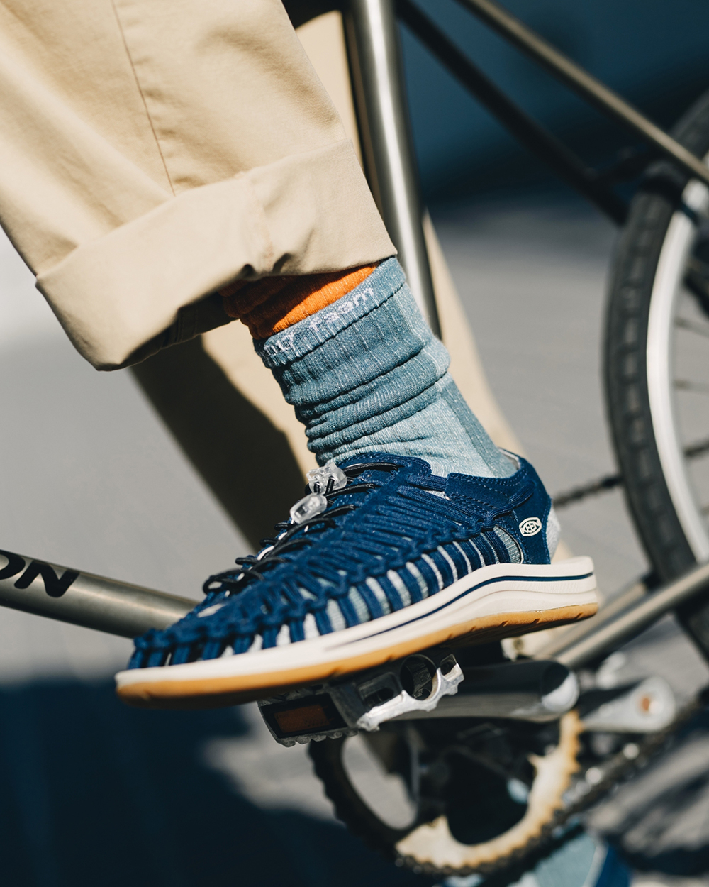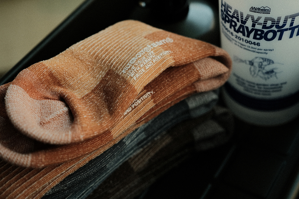 視覺設計呈現靈感源於洗鍊舊化的丹寧面料,陳藉由羊毛胚紗色及織品結構,營造出水洗落色的氛圍,並於襪身加入色塊拼接,使襪身表面富有古布拼接的輪廓與視覺,充分詮釋演繹出Filter017® 於復古流行與戶外休閒的品牌軸向。