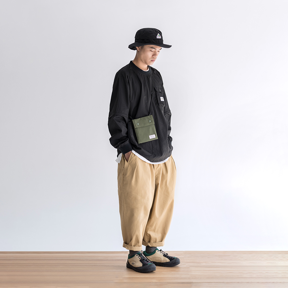 精緻簡約的包款外型,以復刻考究70年代戶外機能風格,並自行重新開發改良而成的「60/40」混紡面料進行製作。棉纱混合横向尼龍所混纺而成的面料,不僅具有尼龍的基本防潑水機能,同時也保留了棉料的舒適手感質地。
