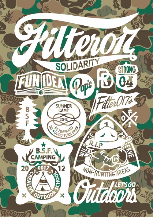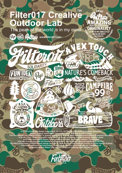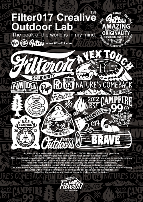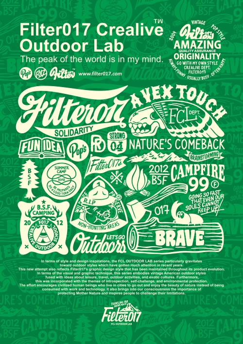 彙整2012年整個年度Filter017團隊為 「FCL OUTDOOR LAB」主題系列所設計的圖像以及視覺設定作品,包含圖像設計、標誌設計、字體設計、角色設計、PATTERN圖紋設計、海報設計以及各種運用編排上之考量設定,此系列作品也陸續於品牌、商品及藝術層面上做各種運用延伸。 此系列的平面作品在建構方式以及設計方向上比起過往更加經過深思熟慮與規劃,在邏輯和視覺上的整合,更是Filter017在創作風格上不斷自我精進之處,這方面在此系列作品的表現上更是有所成長突破。
